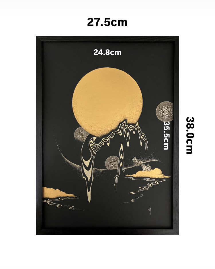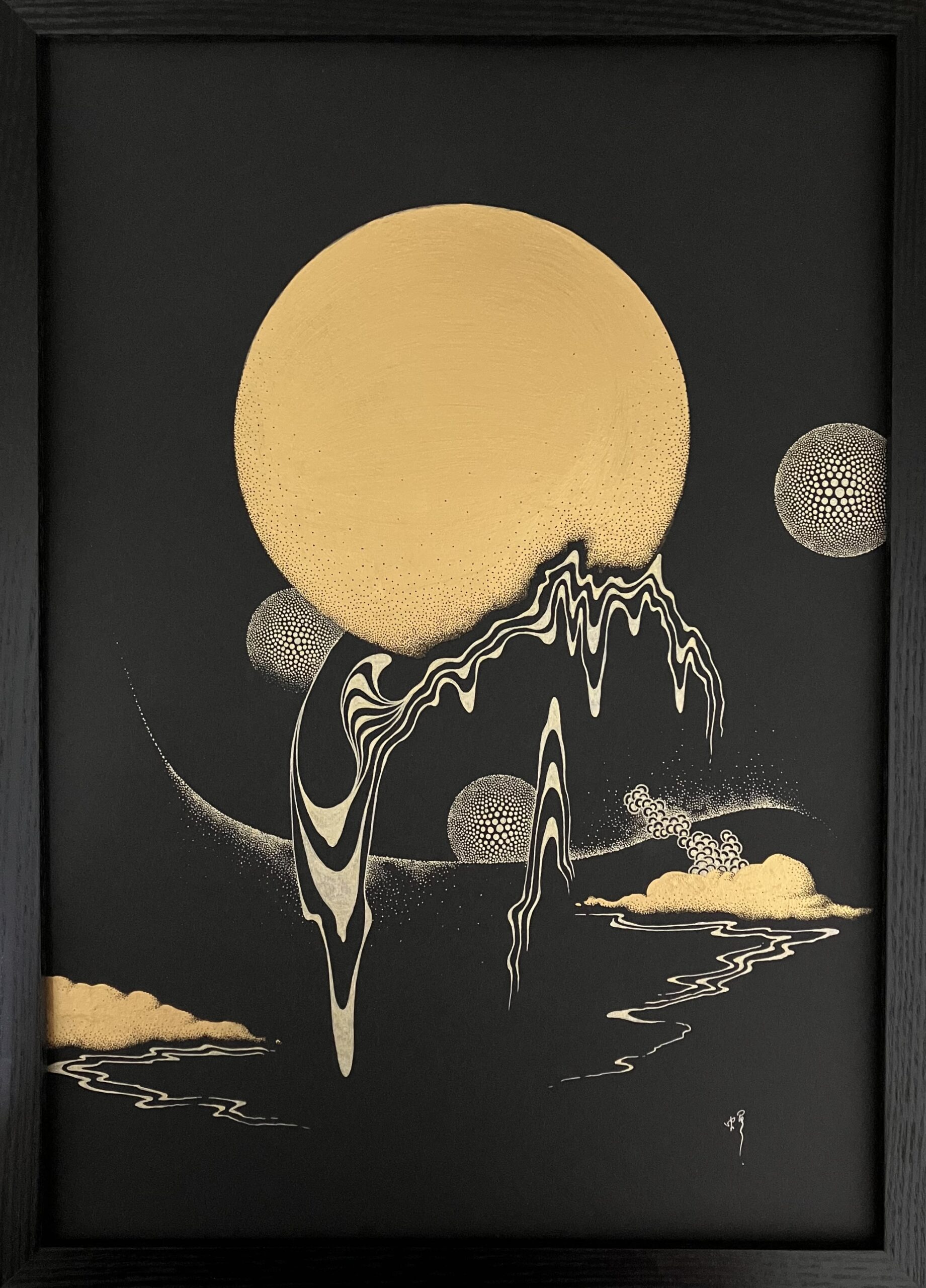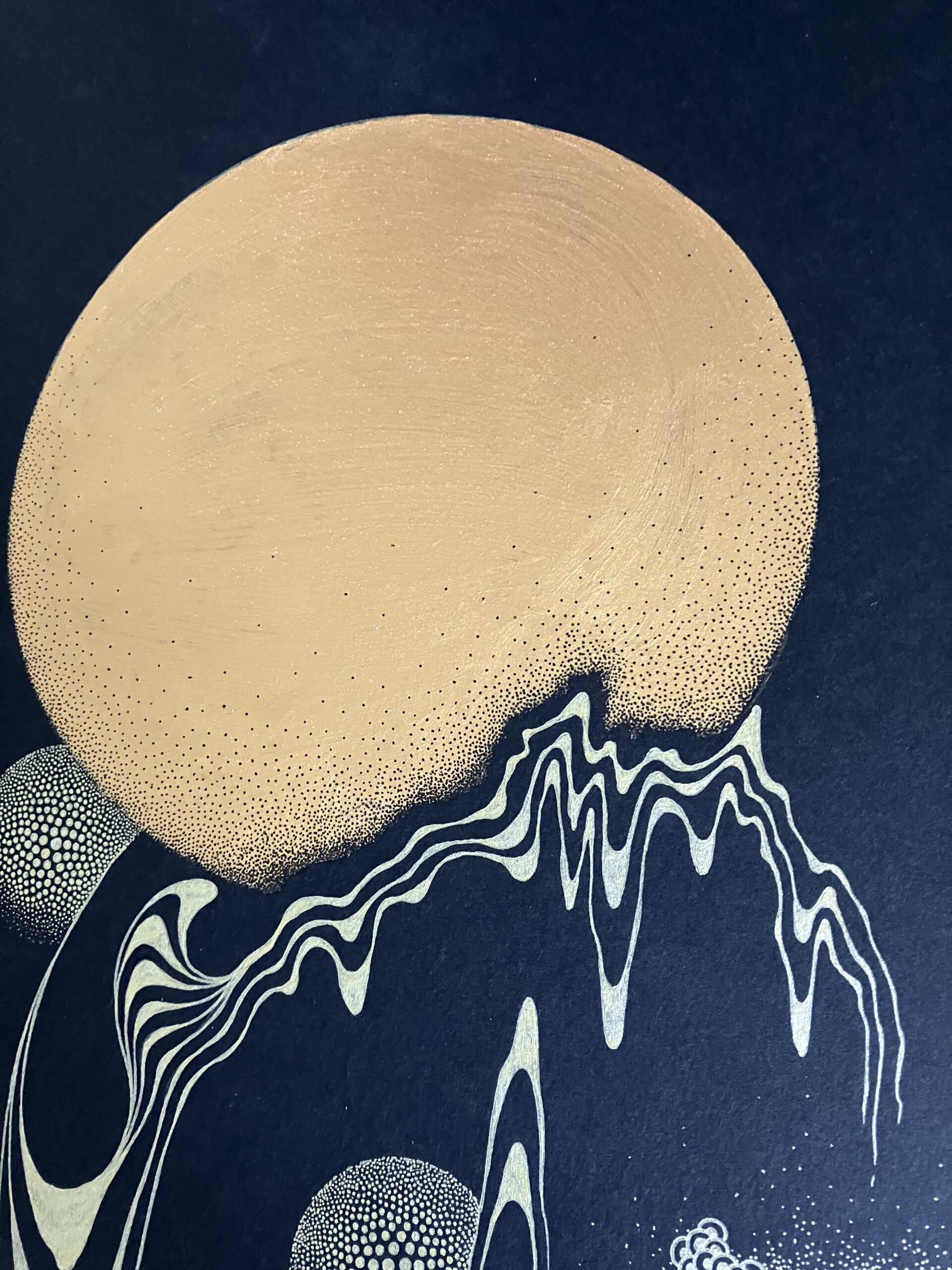 画像ではゴールドの色味が伝わりづらいですが、黒のイラストボードにゴールドのアクリル絵の具とペンを使用し静かな夜をイメージして描きました。