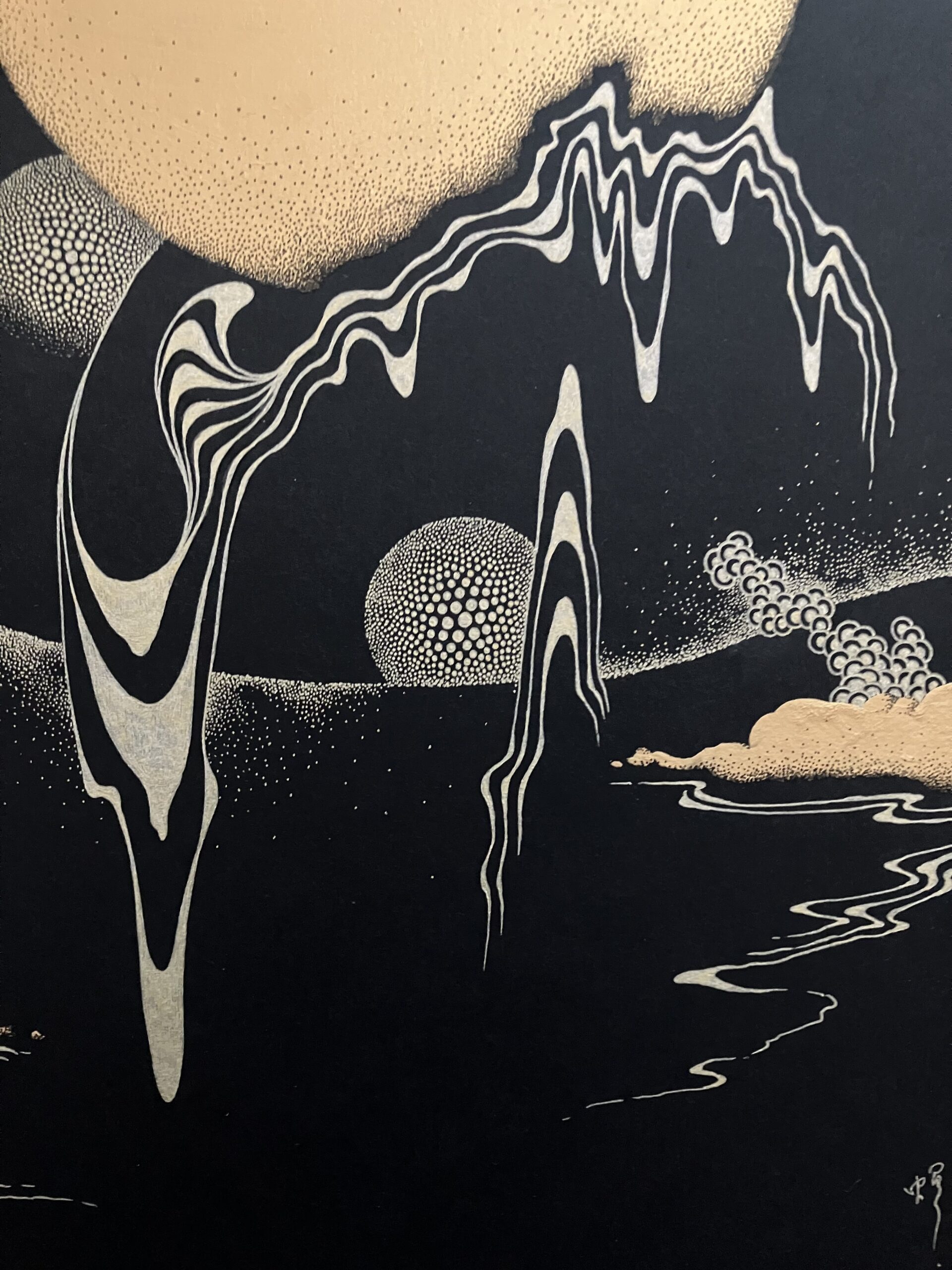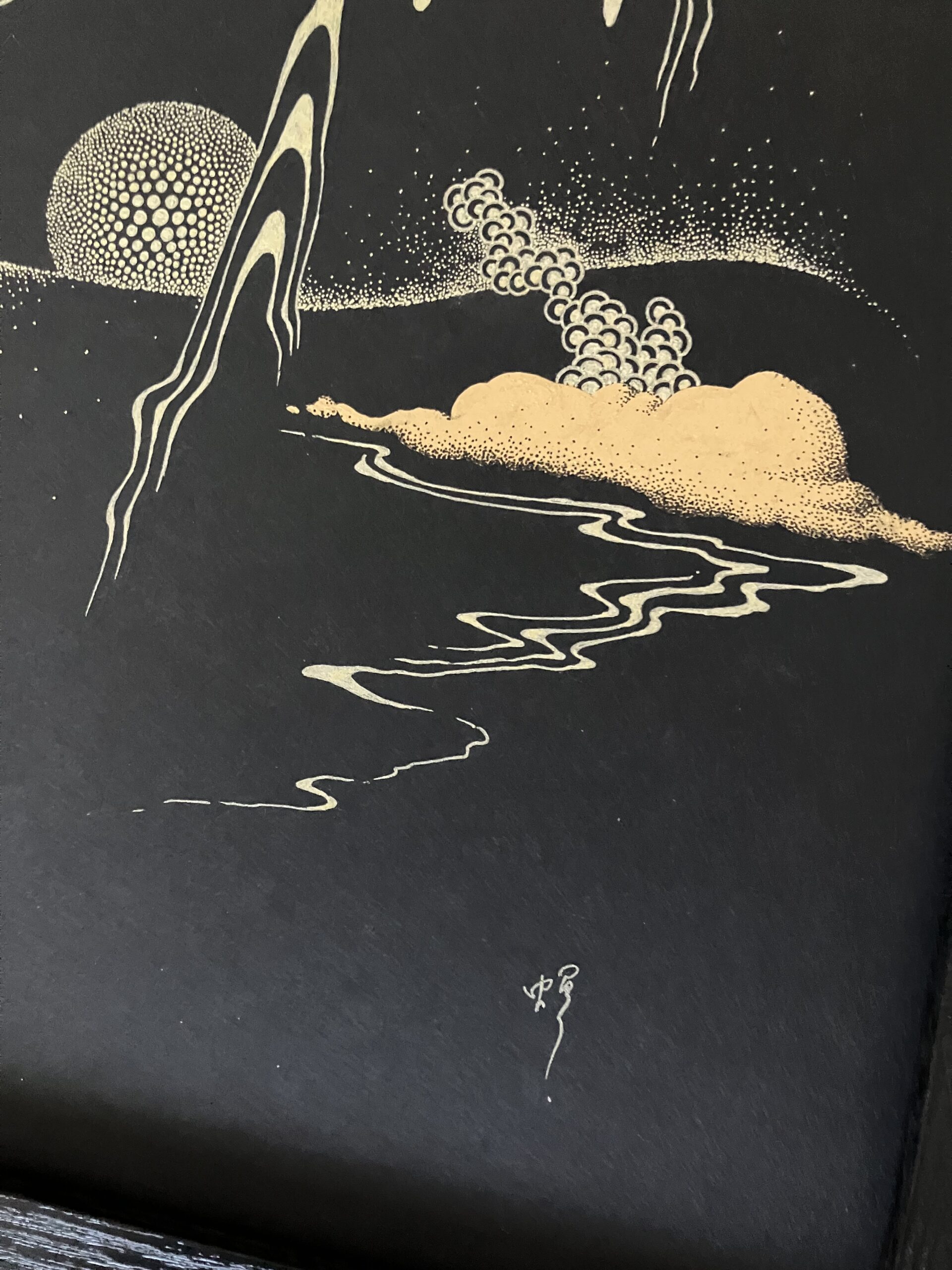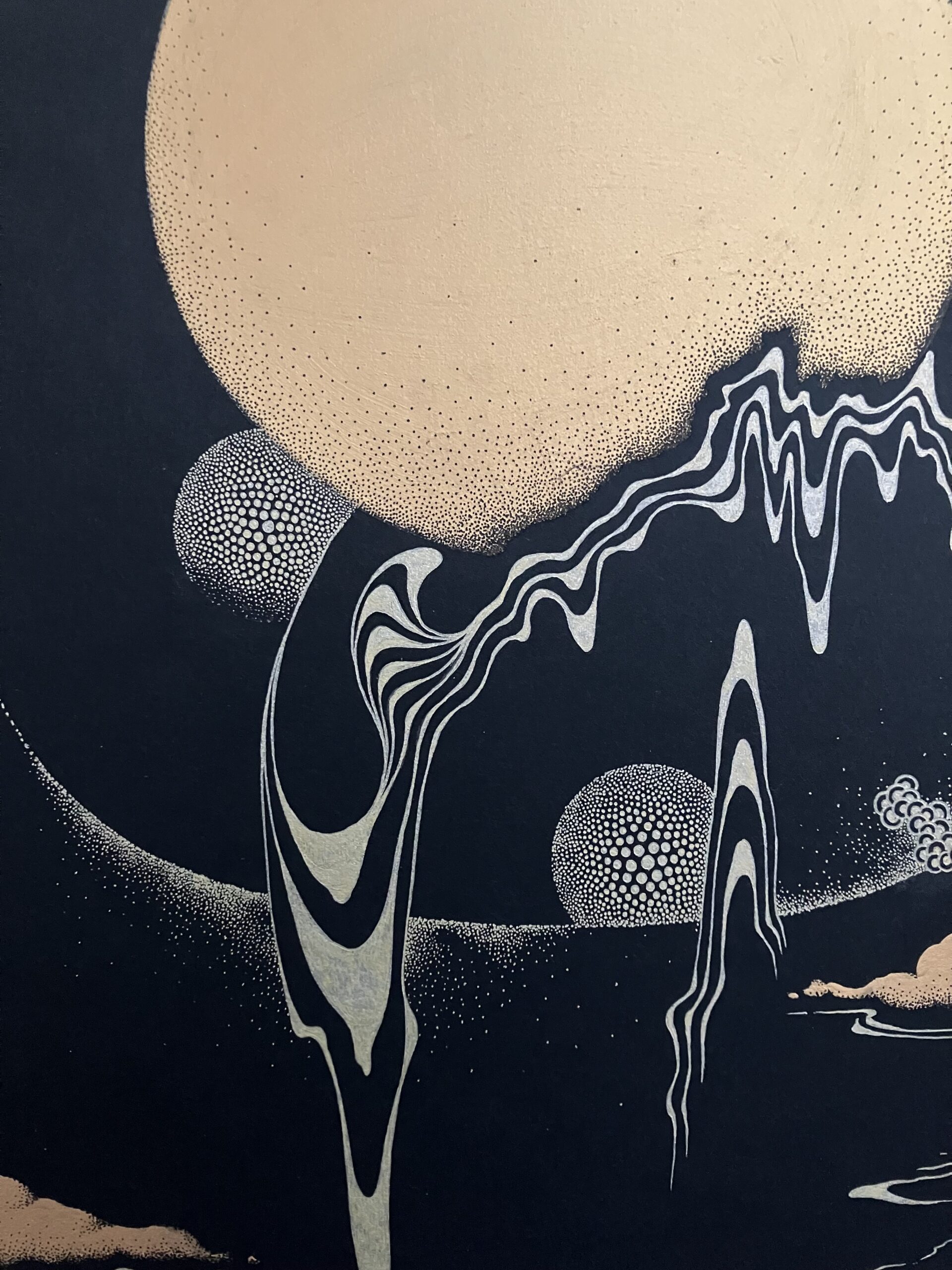 画像ではゴールドの色味が伝わりづらいですが、黒のイラストボードにゴールドのアクリル絵の具とペンを使用し静かな夜をイメージして描きました。