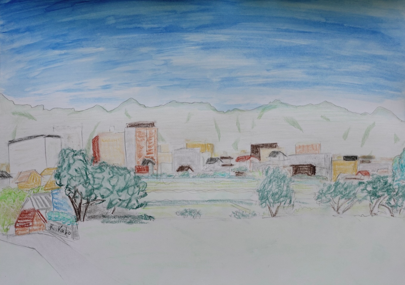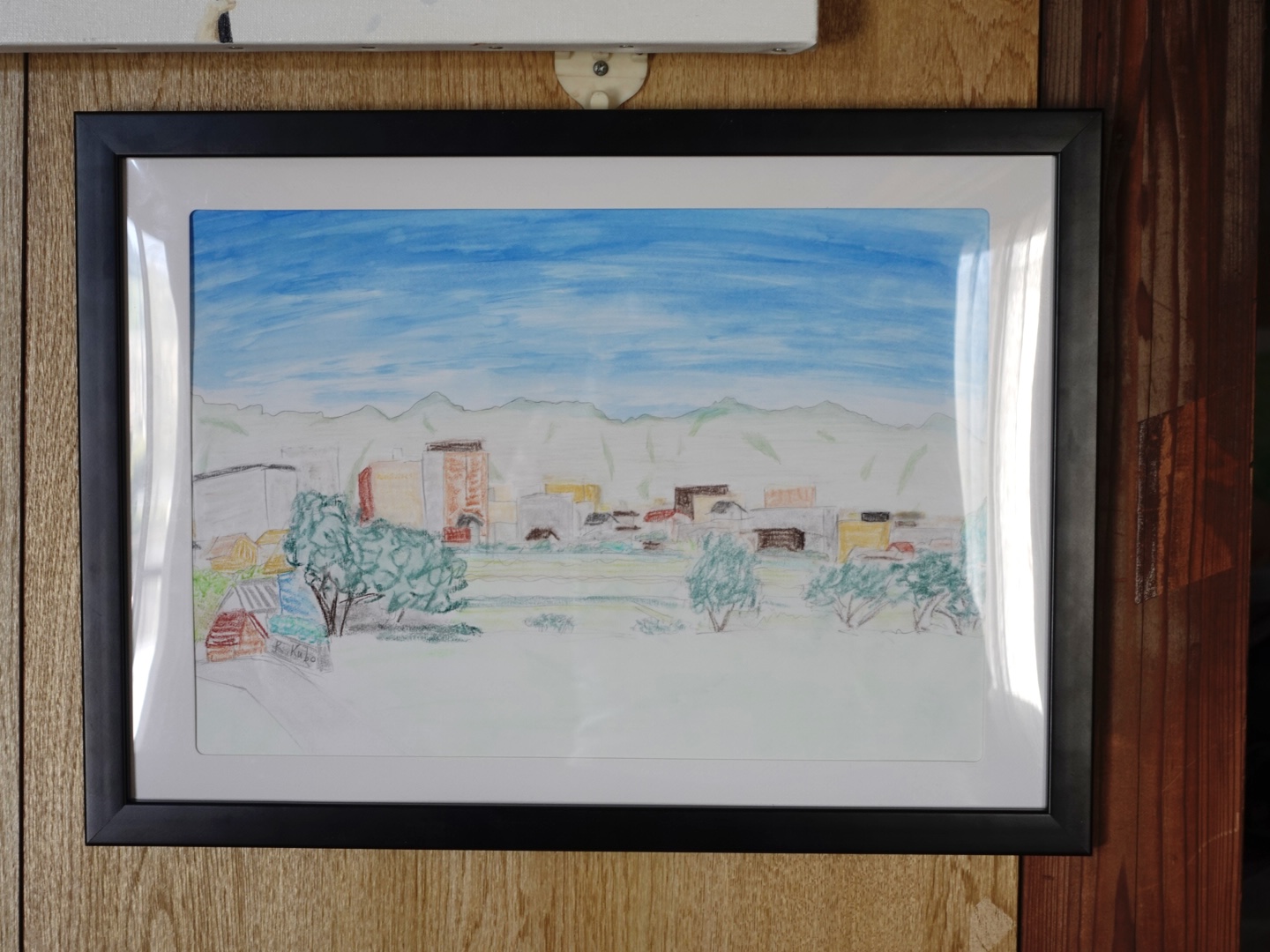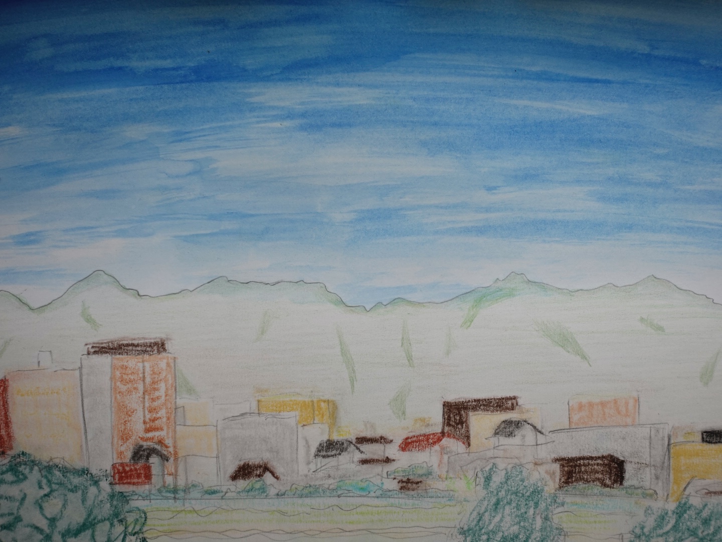 この作品は、パステル、水彩、鉛筆を巧みに組み合わせ、生き生きとしたエネルギーに満ち溢れ、日常のありのままの美しさを表現しています。フォーヴィスムの大胆な色彩と表現力豊かな筆致で、静謐でありながらも生き生きとした、愛すべき風景の真髄を捉えようと努めました。この絵が、あなたの空間を軽やかな静寂と喜びに満ちた色彩で満たし、心を落ち着かせ、その心の安らぎの中で息を吸い込むように誘う姿を想像してみてください。空は水彩、山は色鉛筆、建物や木々はパステルで描かれています。