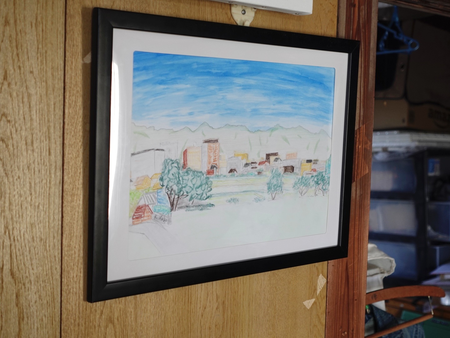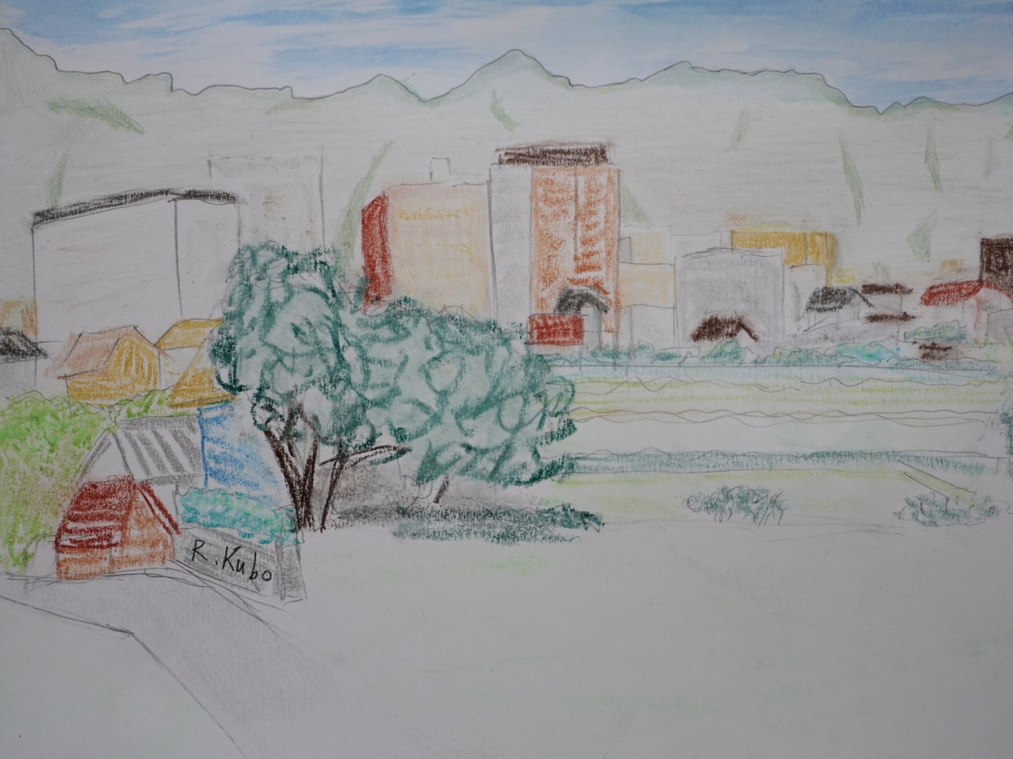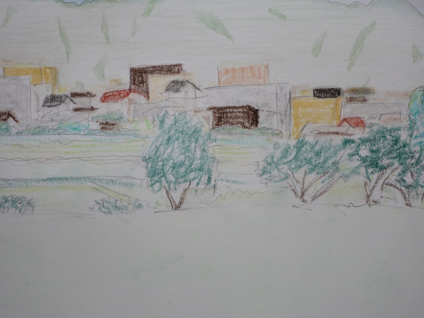 この作品は、パステル、水彩、鉛筆を巧みに組み合わせ、生き生きとしたエネルギーに満ち溢れ、日常のありのままの美しさを表現しています。フォーヴィスムの大胆な色彩と表現力豊かな筆致で、静謐でありながらも生き生きとした、愛すべき風景の真髄を捉えようと努めました。この絵が、あなたの空間を軽やかな静寂と喜びに満ちた色彩で満たし、心を落ち着かせ、その心の安らぎの中で息を吸い込むように誘う姿を想像してみてください。空は水彩、山は色鉛筆、建物や木々はパステルで描かれています。