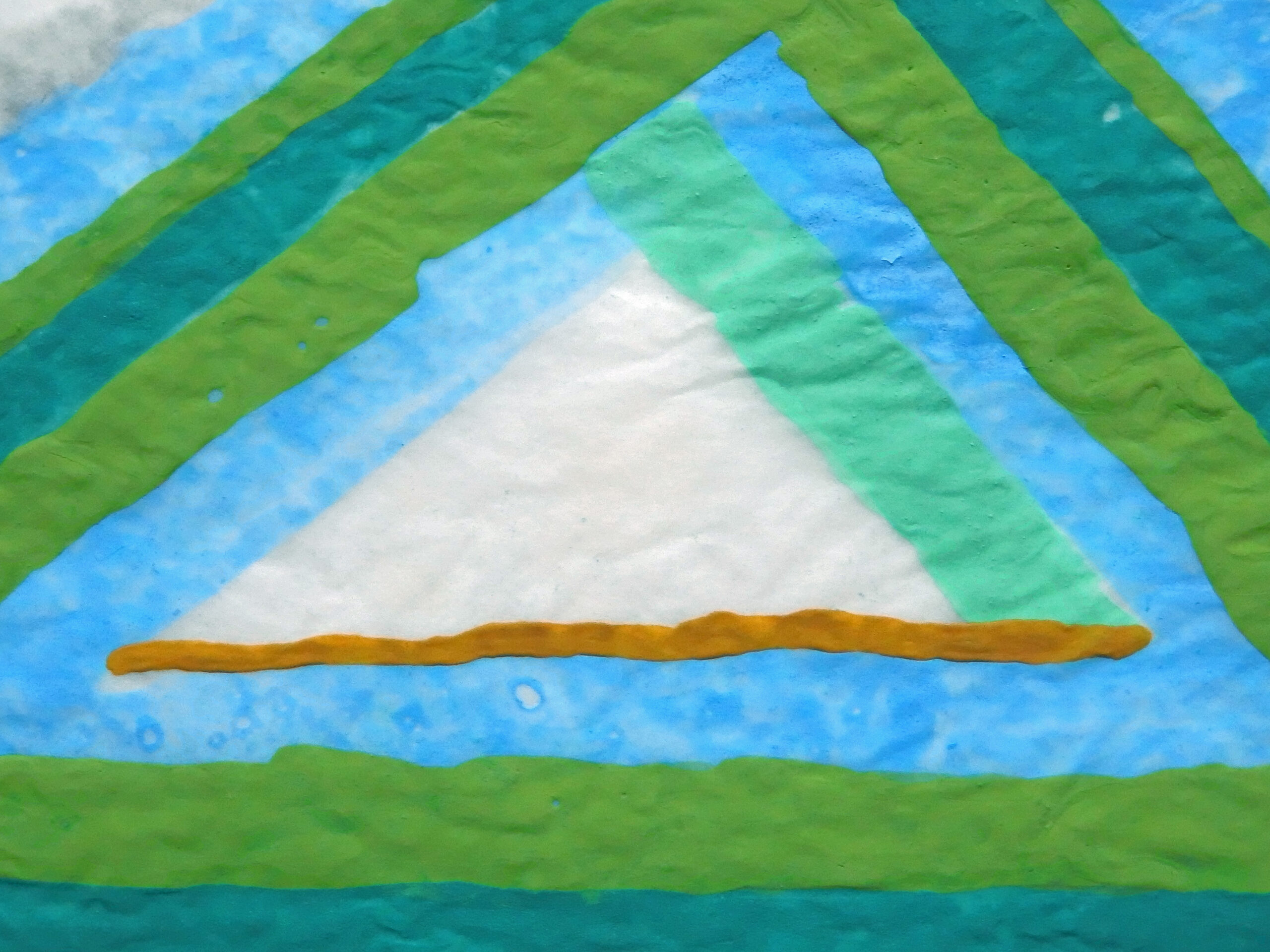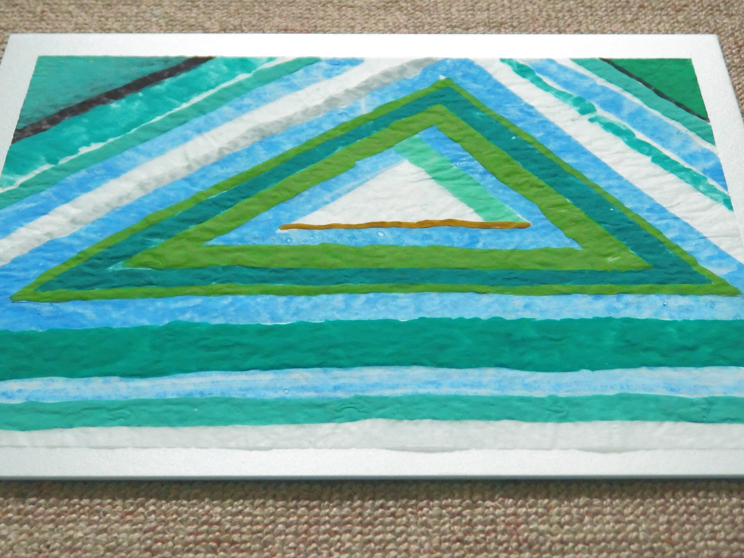 天然素材の和紙に膠を使うのが「日本画」の常識ですが、あえて人工素材を使っています。