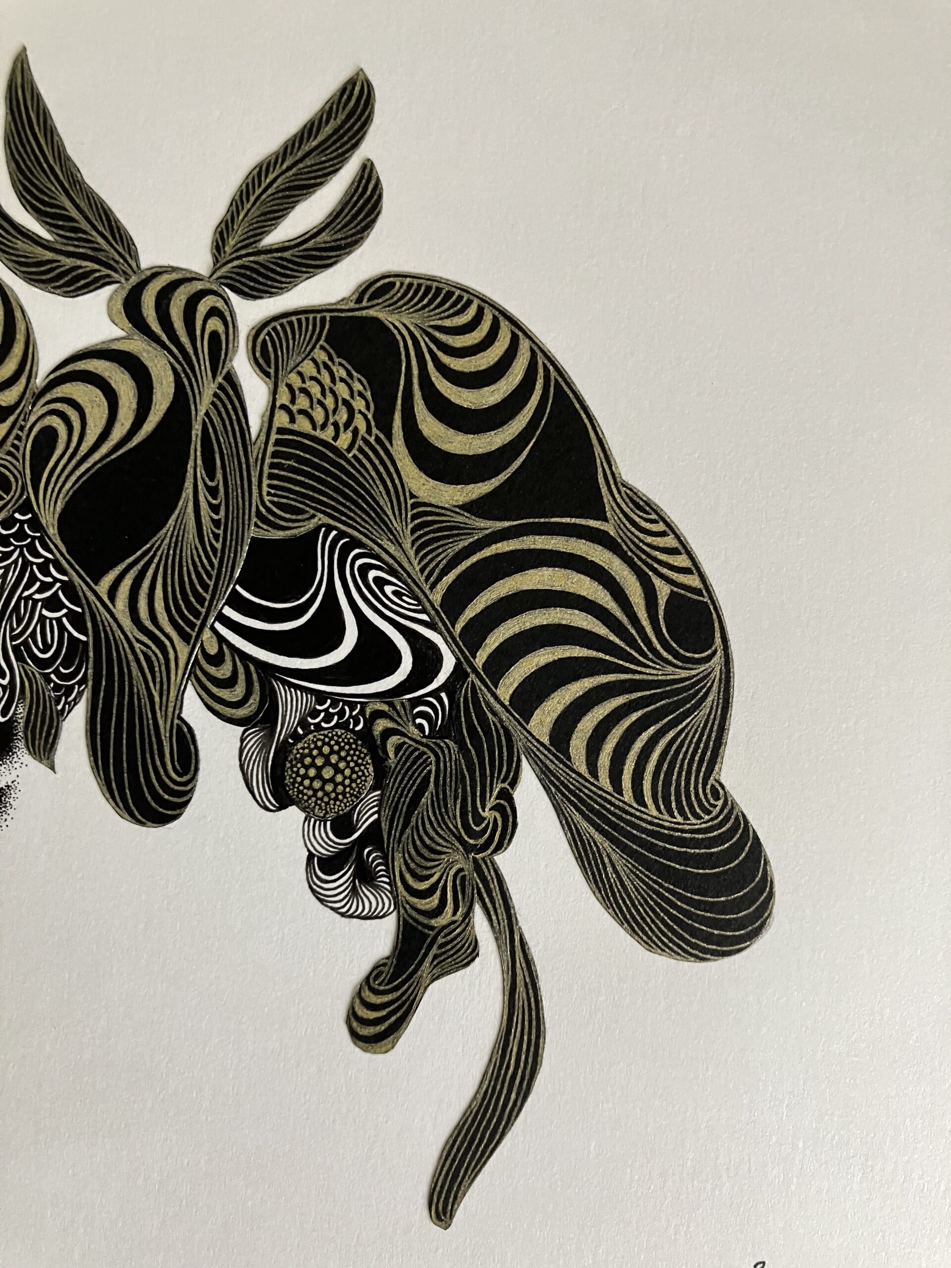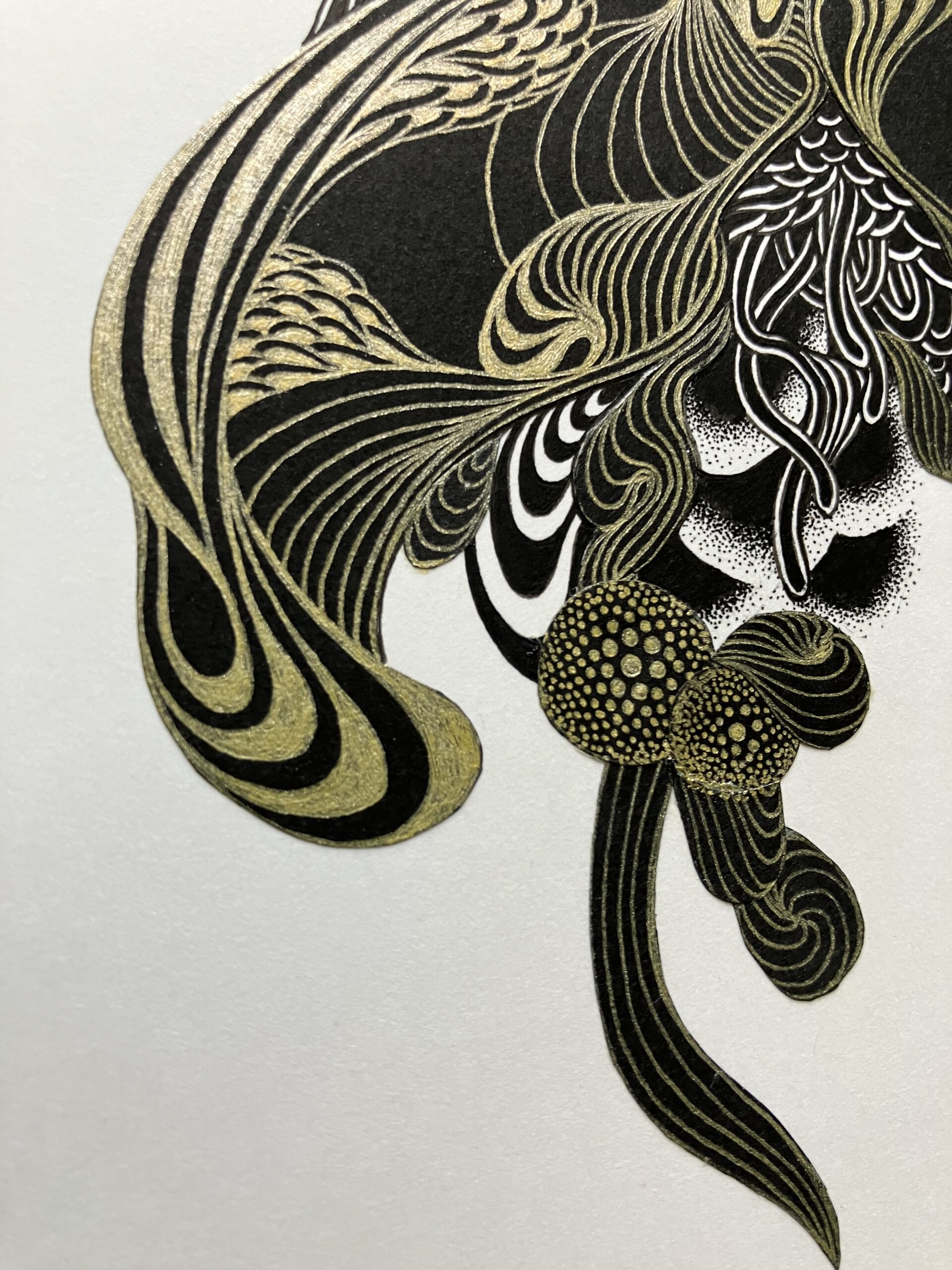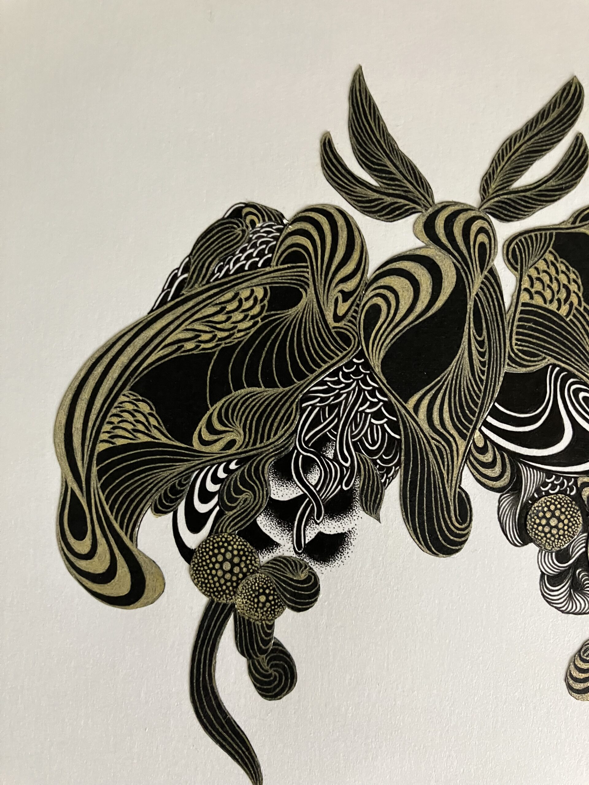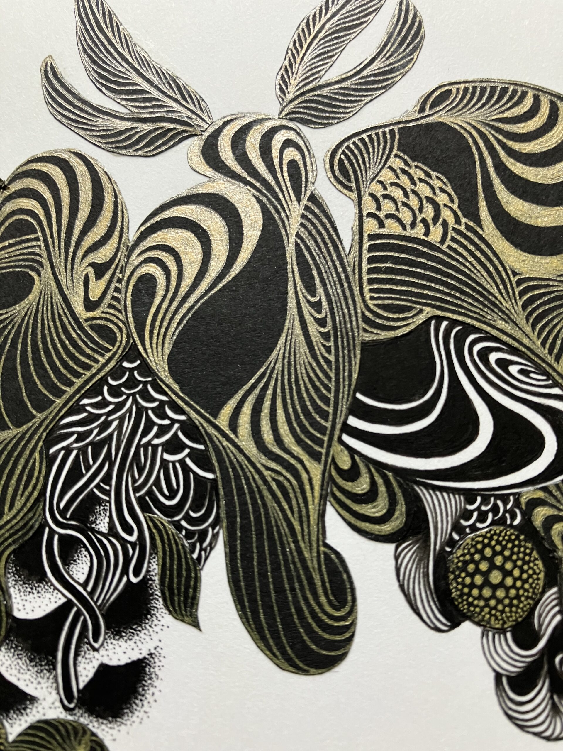 黒色と金色のボールペン、黒色の紙を使用しコラージュした作品。