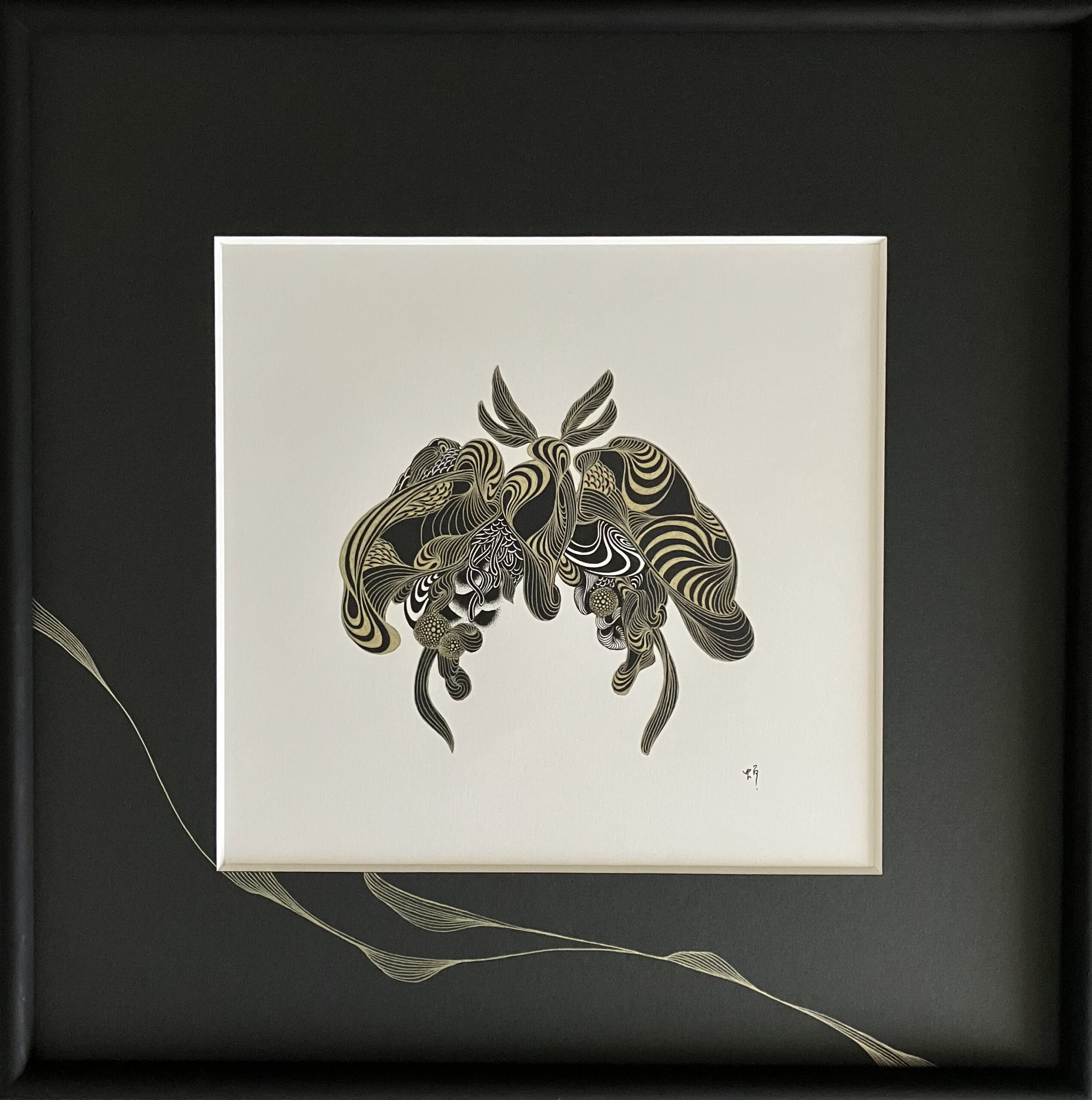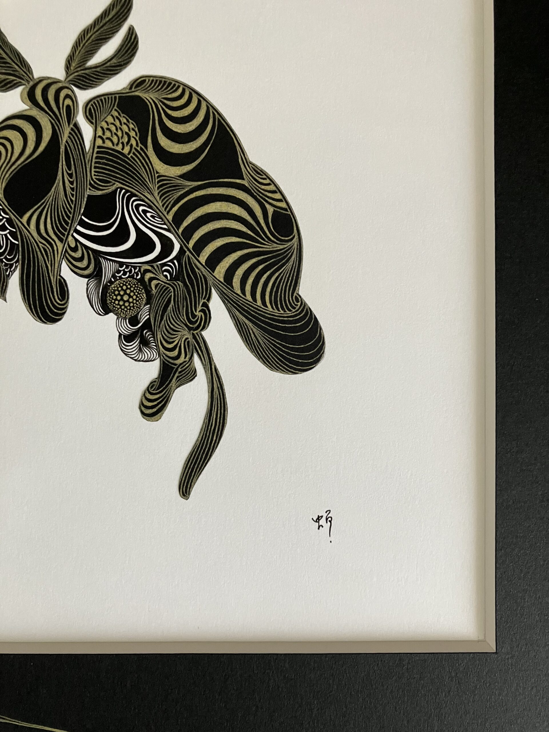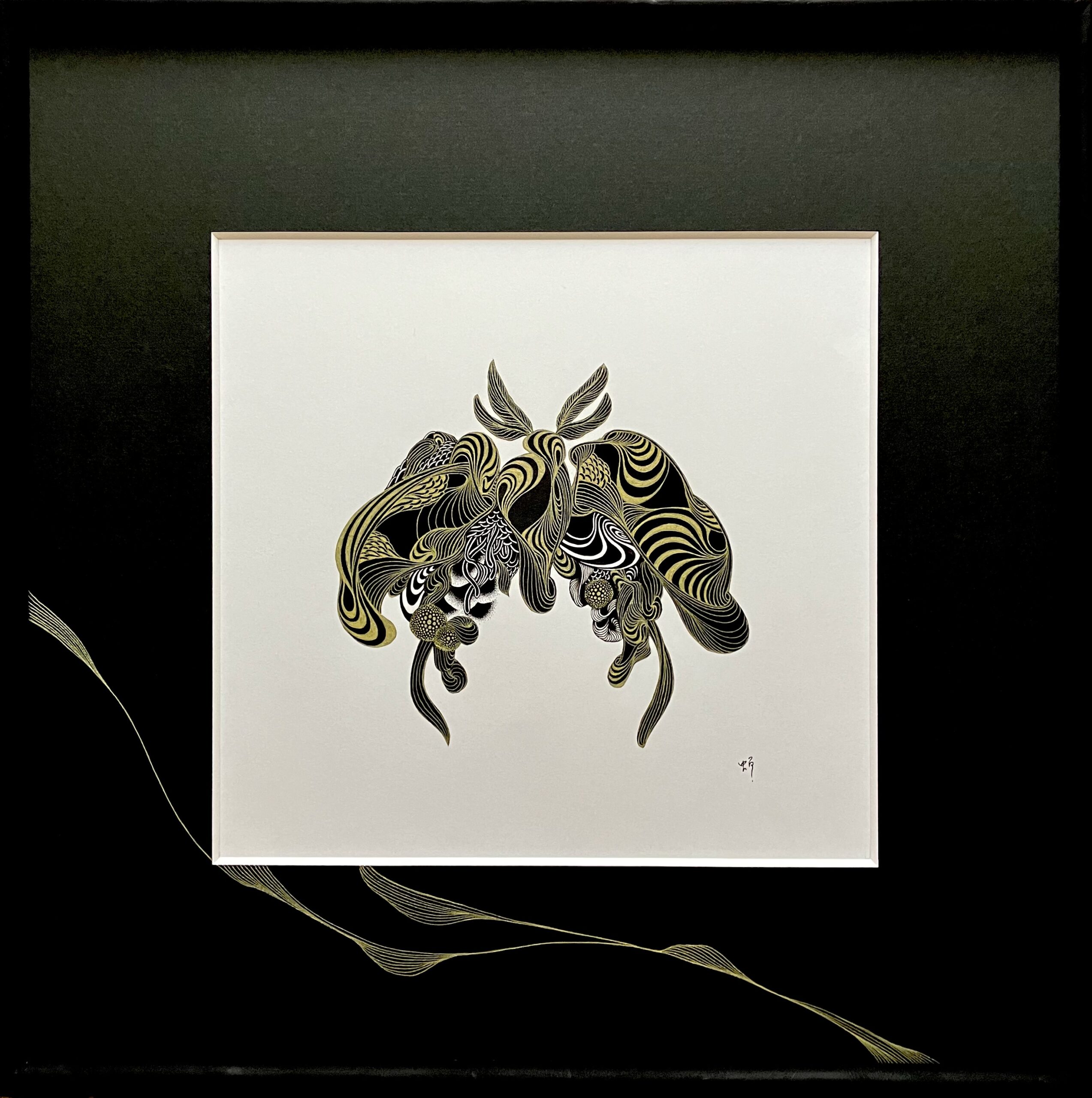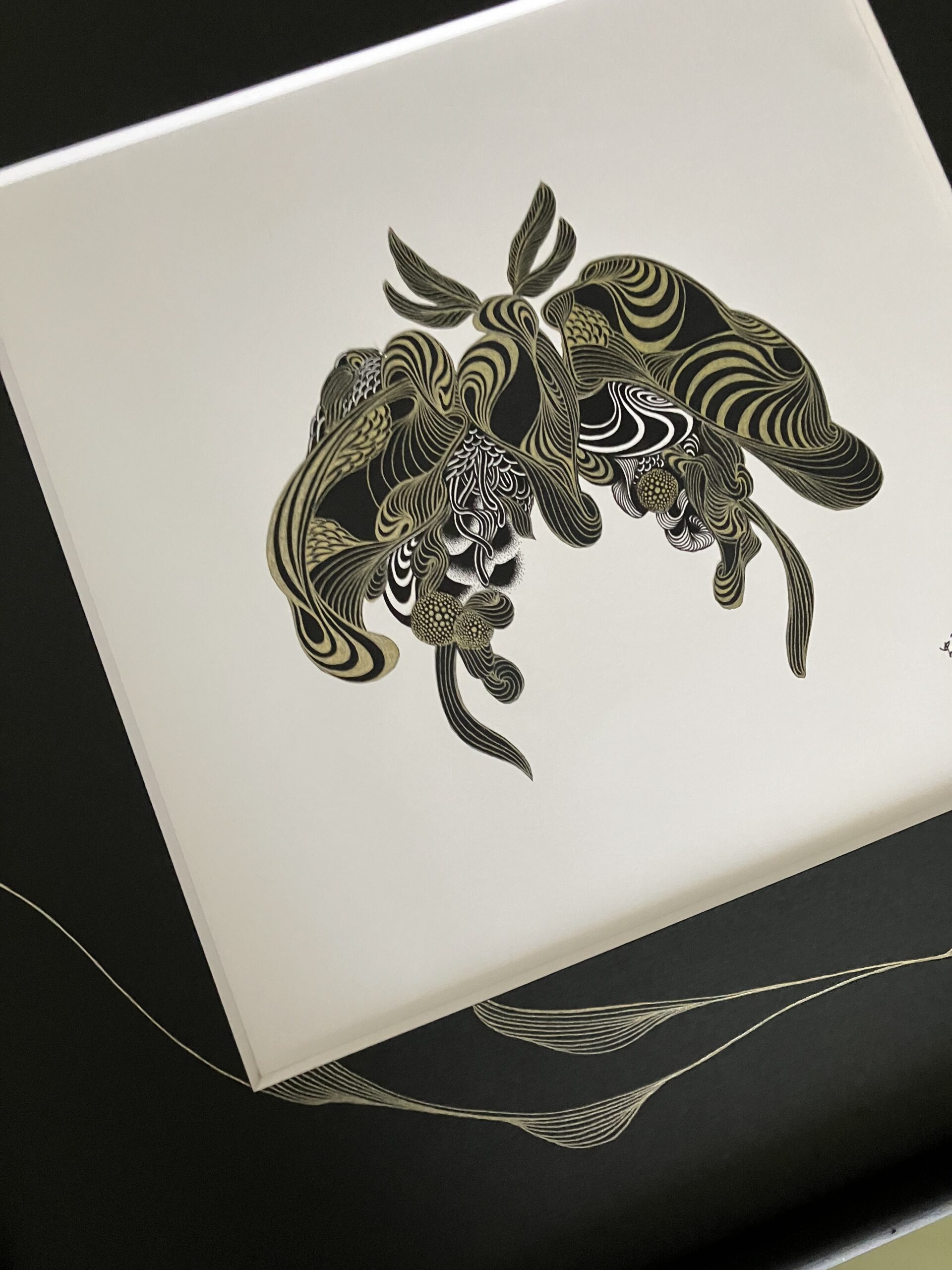 黒色と金色のボールペン、黒色の紙を使用しコラージュした作品。