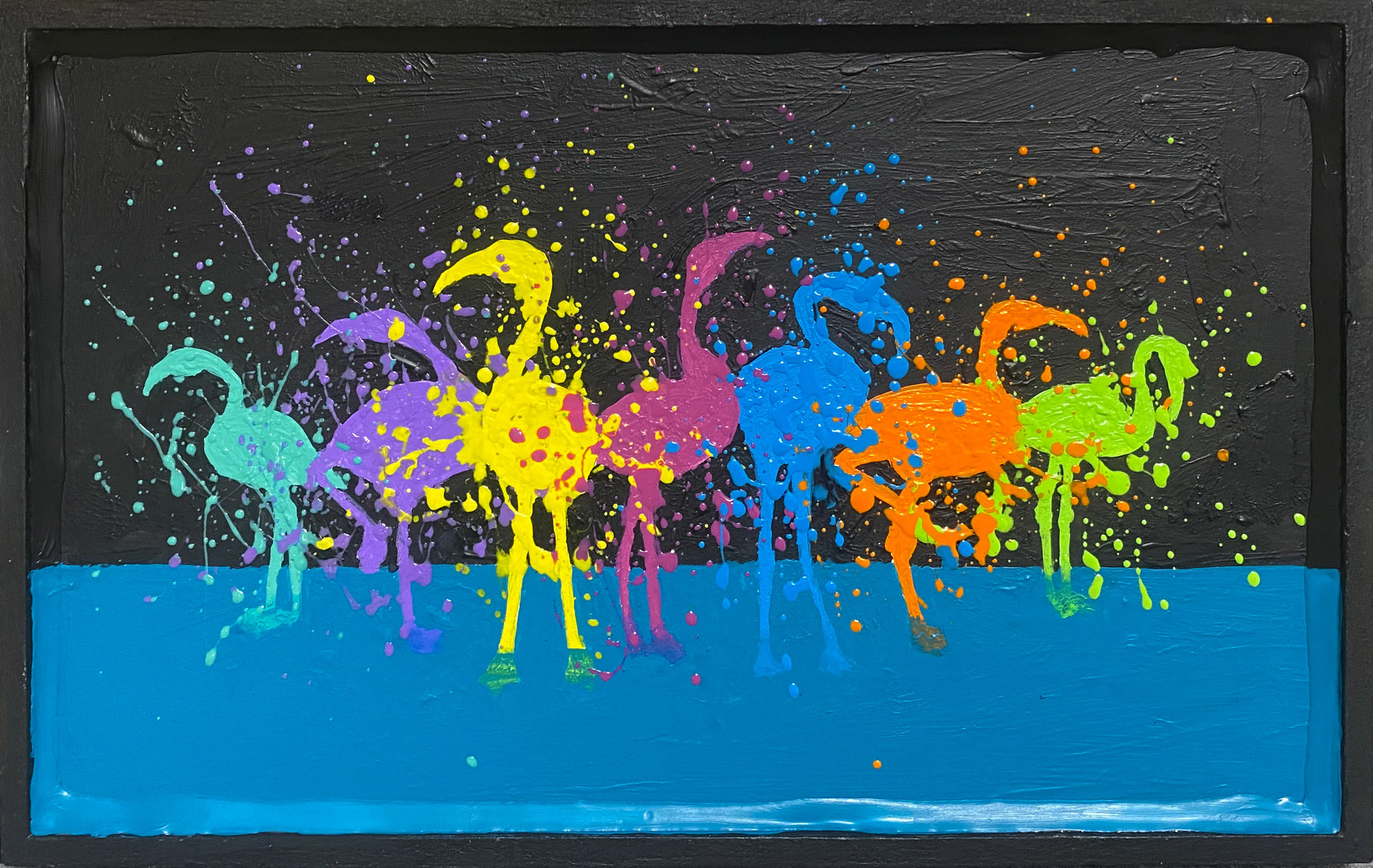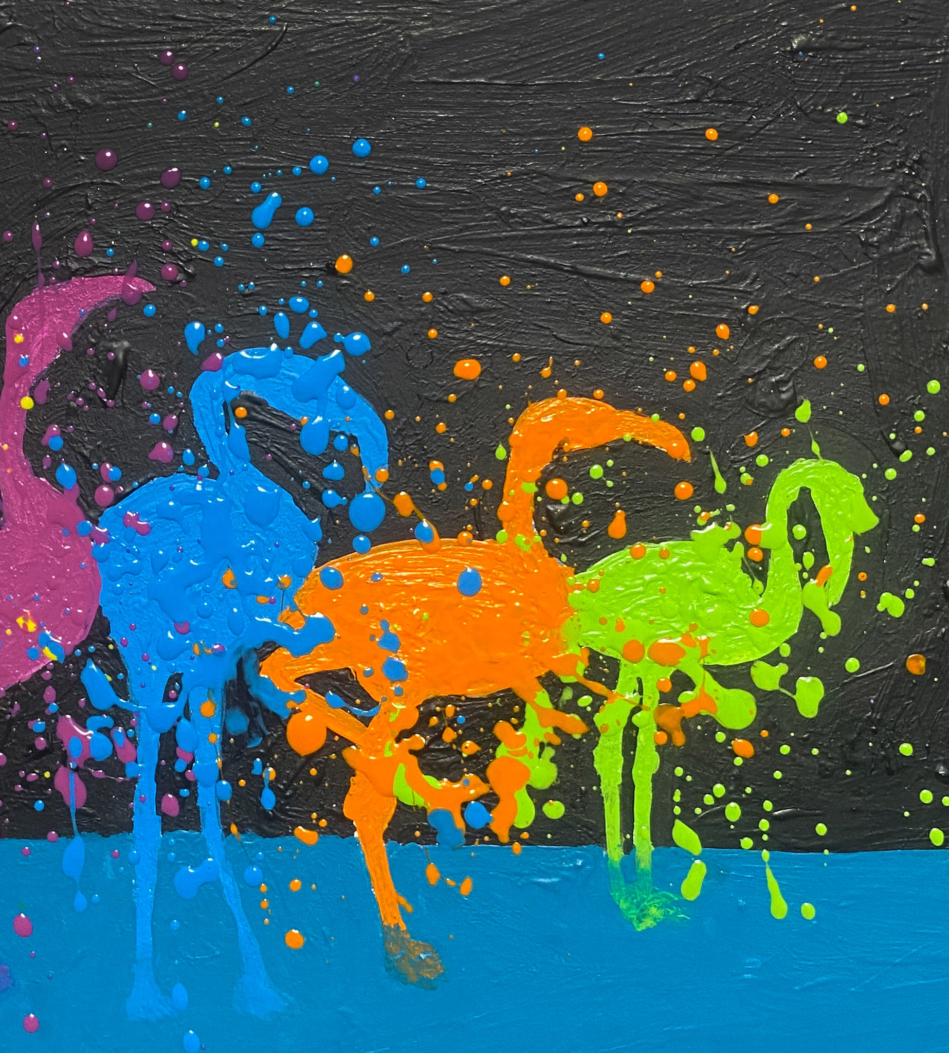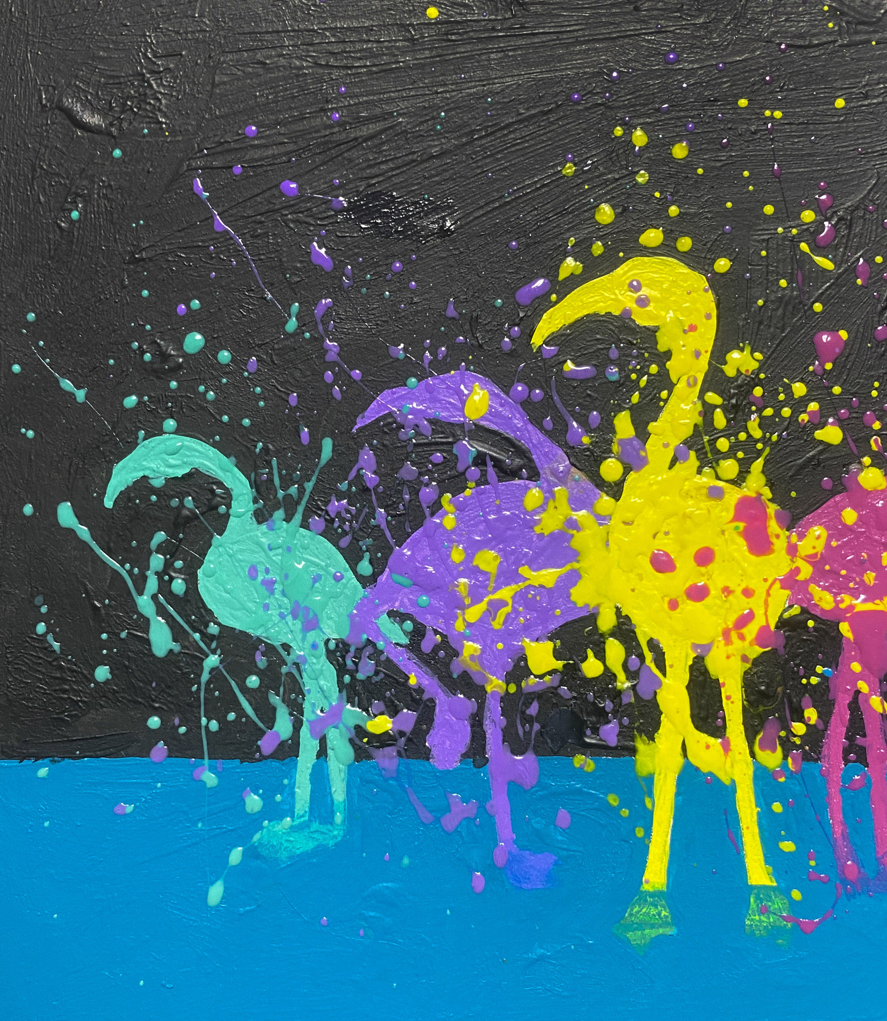 作品にドリッピングを用いるのは、生命力あふれるものへの憧れからです。偶然が生まれる飛沫や線は、自然や宇宙の大きな力とつながる感覚をもたらし、この偶発性こそがまるで作品に命を吹き込むかのようです。 作品の表面は露出しています(ニスでコーティング済み)