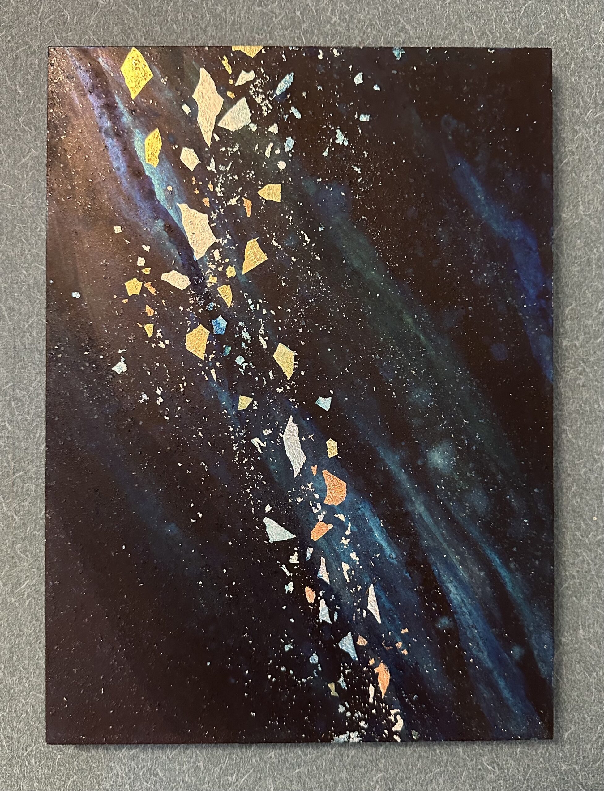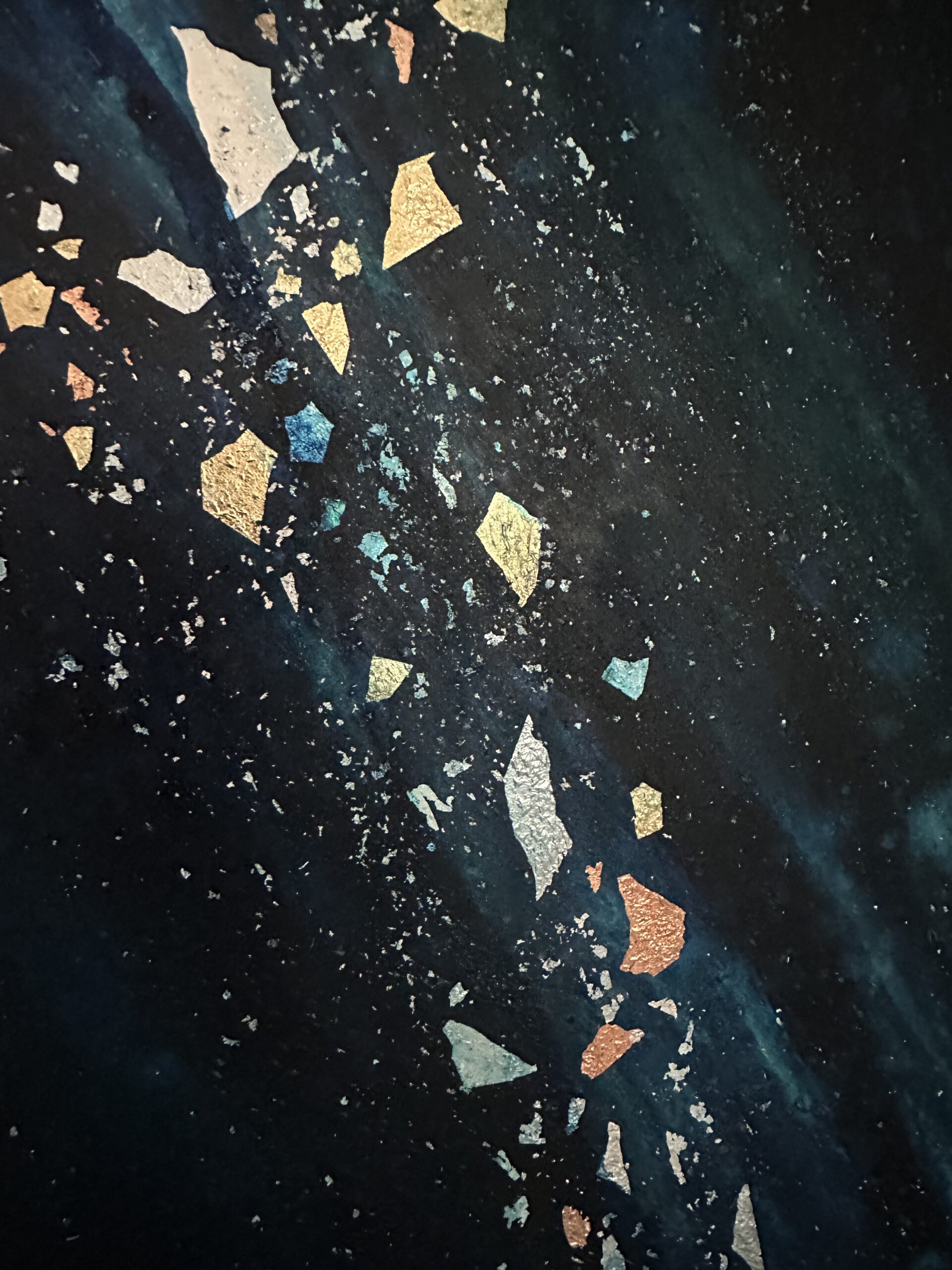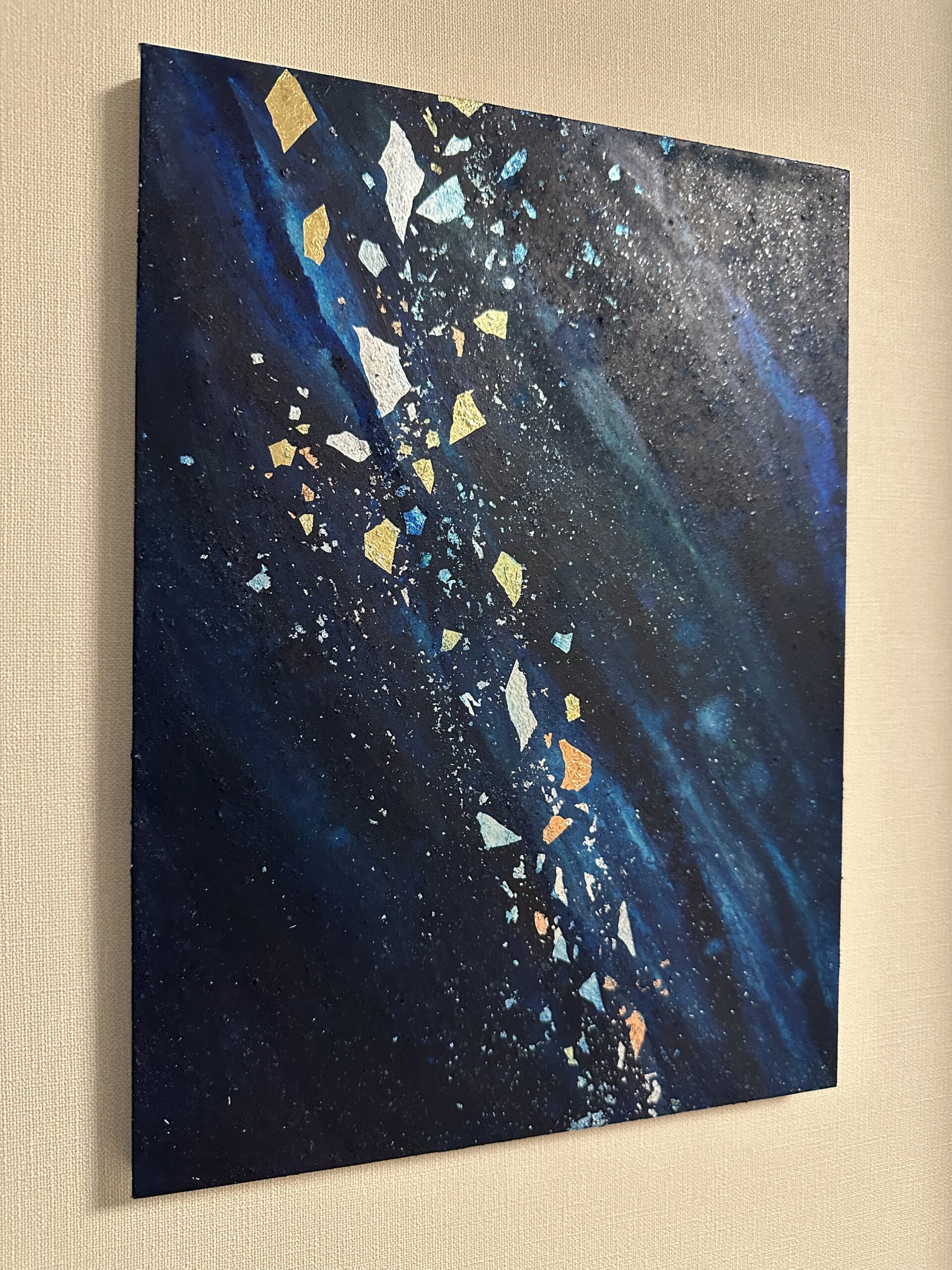 箔を使用した作品は、光のあたり方によって輝き方が変わります。日中の窓から入る自然光、夜の照明の光など、光の違いにより表情がかなり変わります。また、箔の変色を抑えるためのコーティングをしておりますが、時間経過とともに少しずつ色味が変化します。その変化もお楽しみいただけますと幸いです。