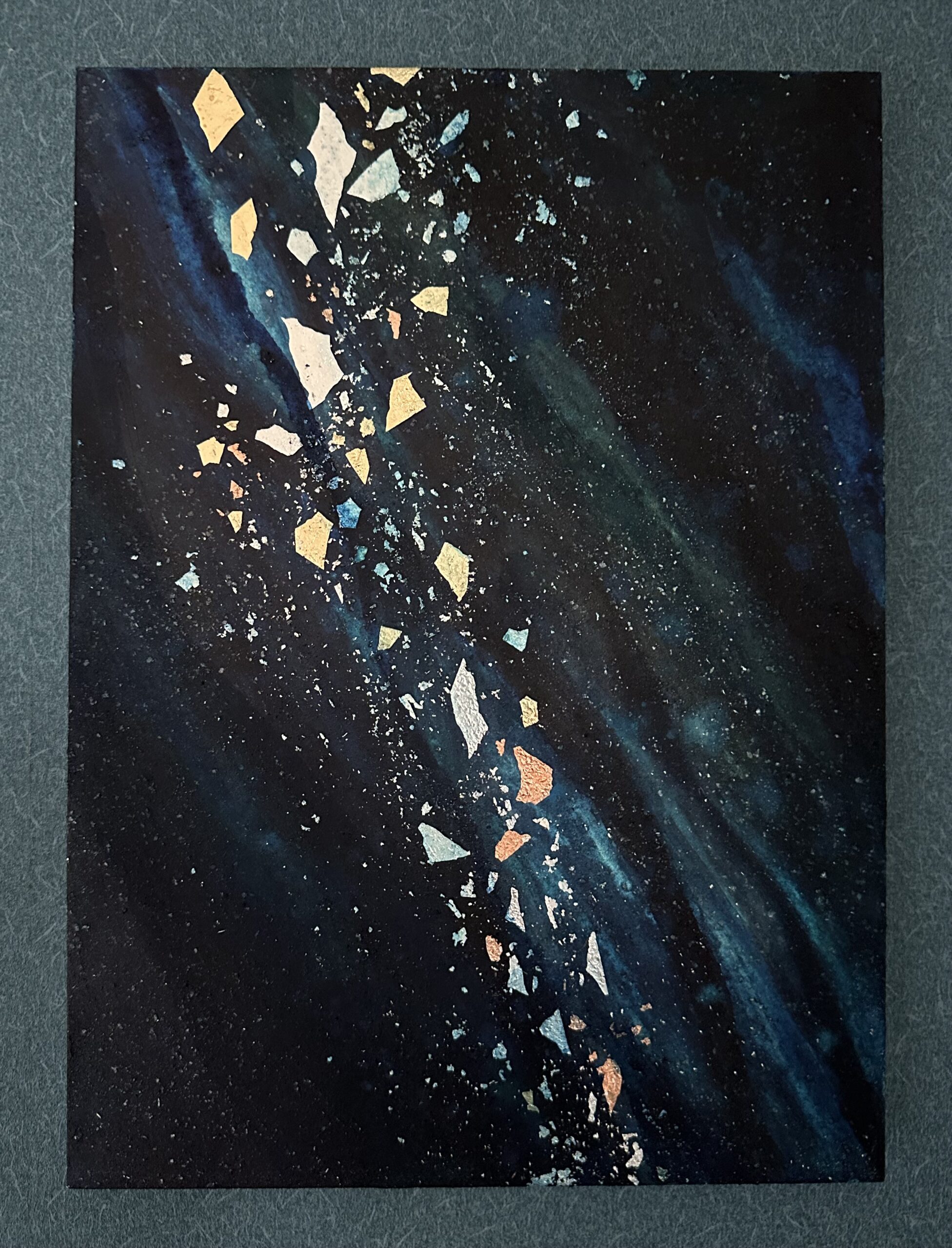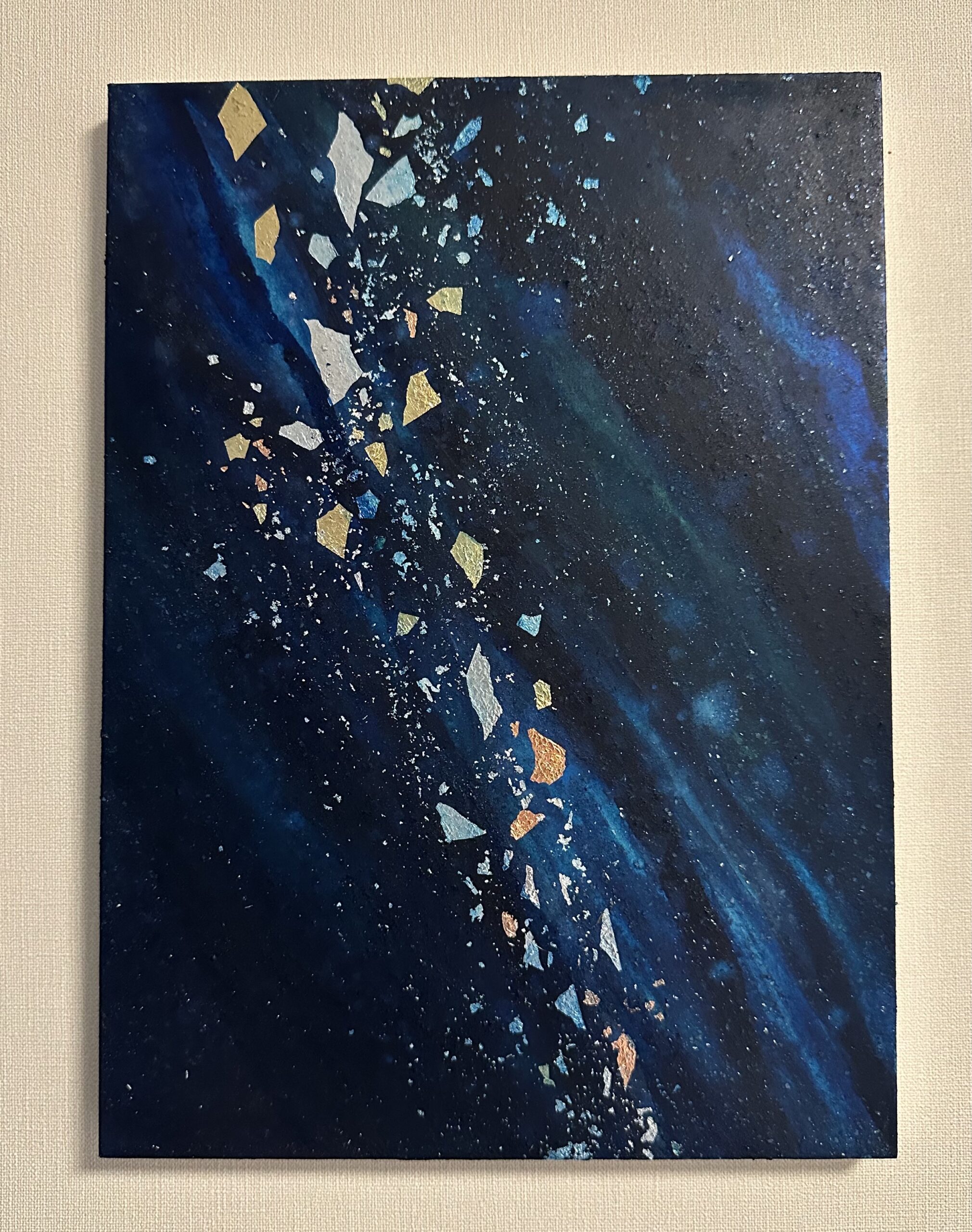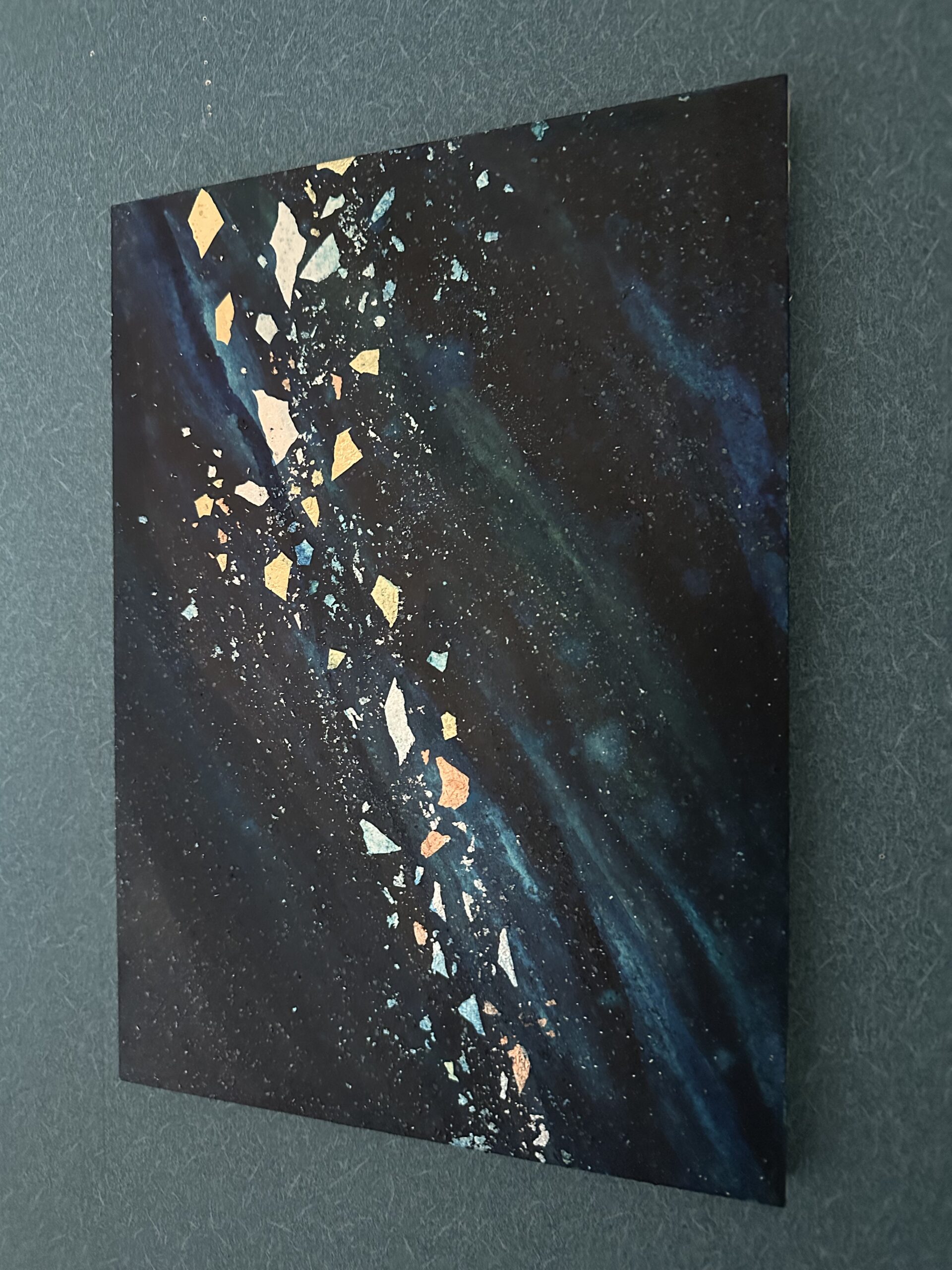箔を使用した作品は、光のあたり方によって輝き方が変わります。日中の窓から入る自然光、夜の照明の光など、光の違いにより表情がかなり変わります。また、箔の変色を抑えるためのコーティングをしておりますが、時間経過とともに少しずつ色味が変化します。その変化もお楽しみいただけますと幸いです。