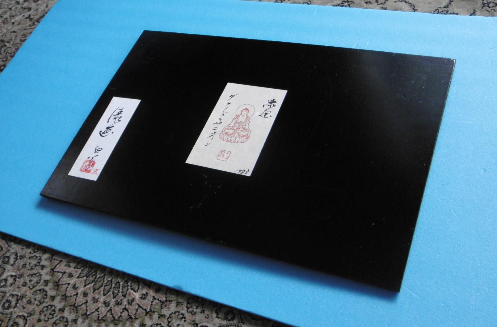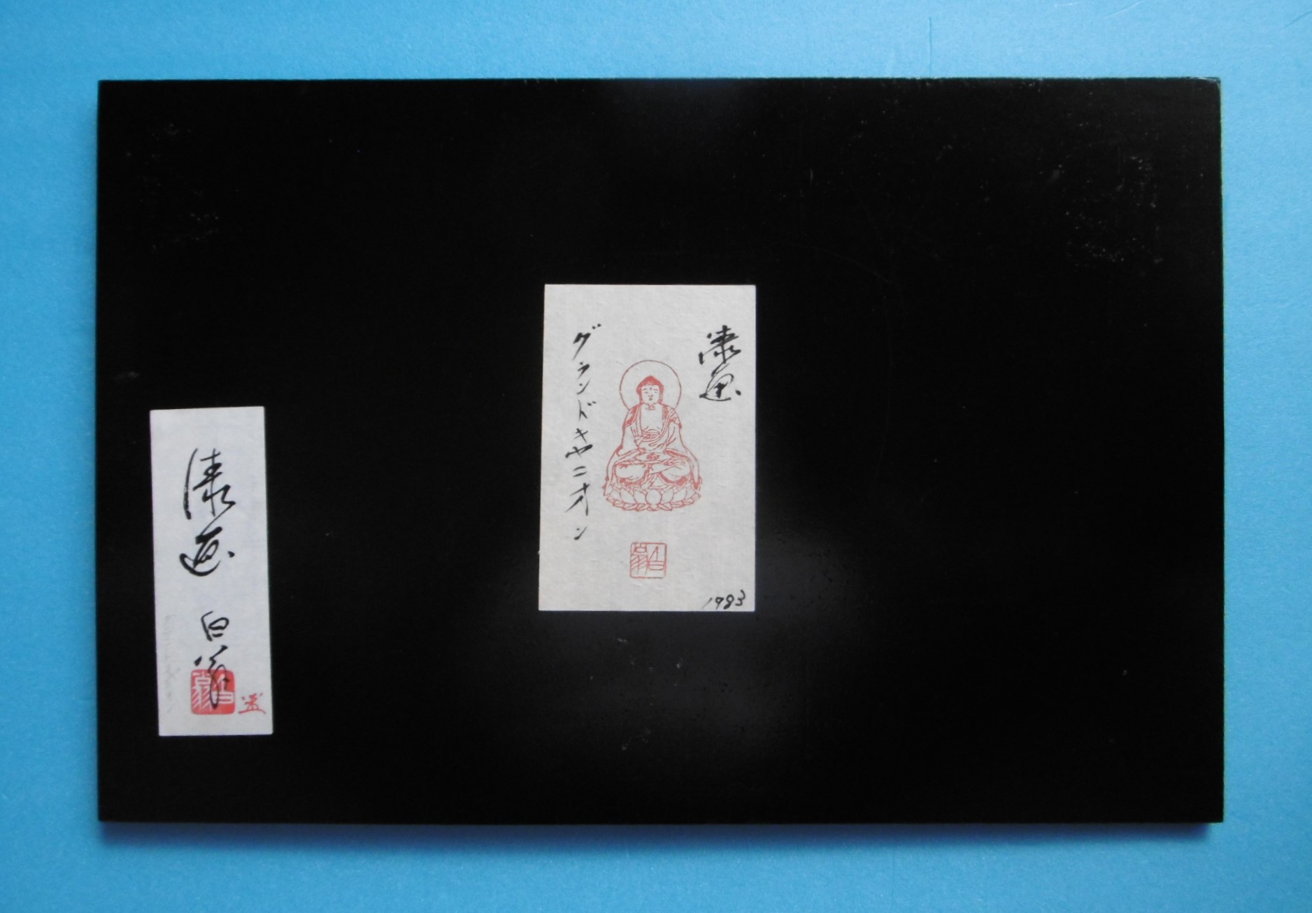 昭和57年4月(1982年)作者78歳の折、アメリカ カリフォルニア州・パサデナ市 「パシフィック・エージア美術館」に於いて、「長期漆画展」を開催 東洋の漆芸術に対する高度の好評を得る 会期中、ハリウッド・ユナイテッドテレビに出演し、大いにその芸道を伝えました その合間にも、グランドキャニオン、ヨセミテ渓谷、ナイヤガラの滝など多くのスケッチを 繰り返し、帰国後、制作にかかりました コロラド川は白漆、キャニオンの岩石はココア色の丹漆や黒漆・紫と白の混合漆、 空は青と緑の中間色(シアン系漆)と白漆を使用しております 全て純日本産漆を使用しております 額は付属しておりません ※サインあり 「花押」かおう 署名の代わりにする印の事。ほとんど読めない程、崩したもの 初めは「楷書体」で自署したが、次第に「草書体」になり、更に様式化したのが「花押」 正面左下 サイン・花押 作品裏面に朱漆による佛印と落款あり