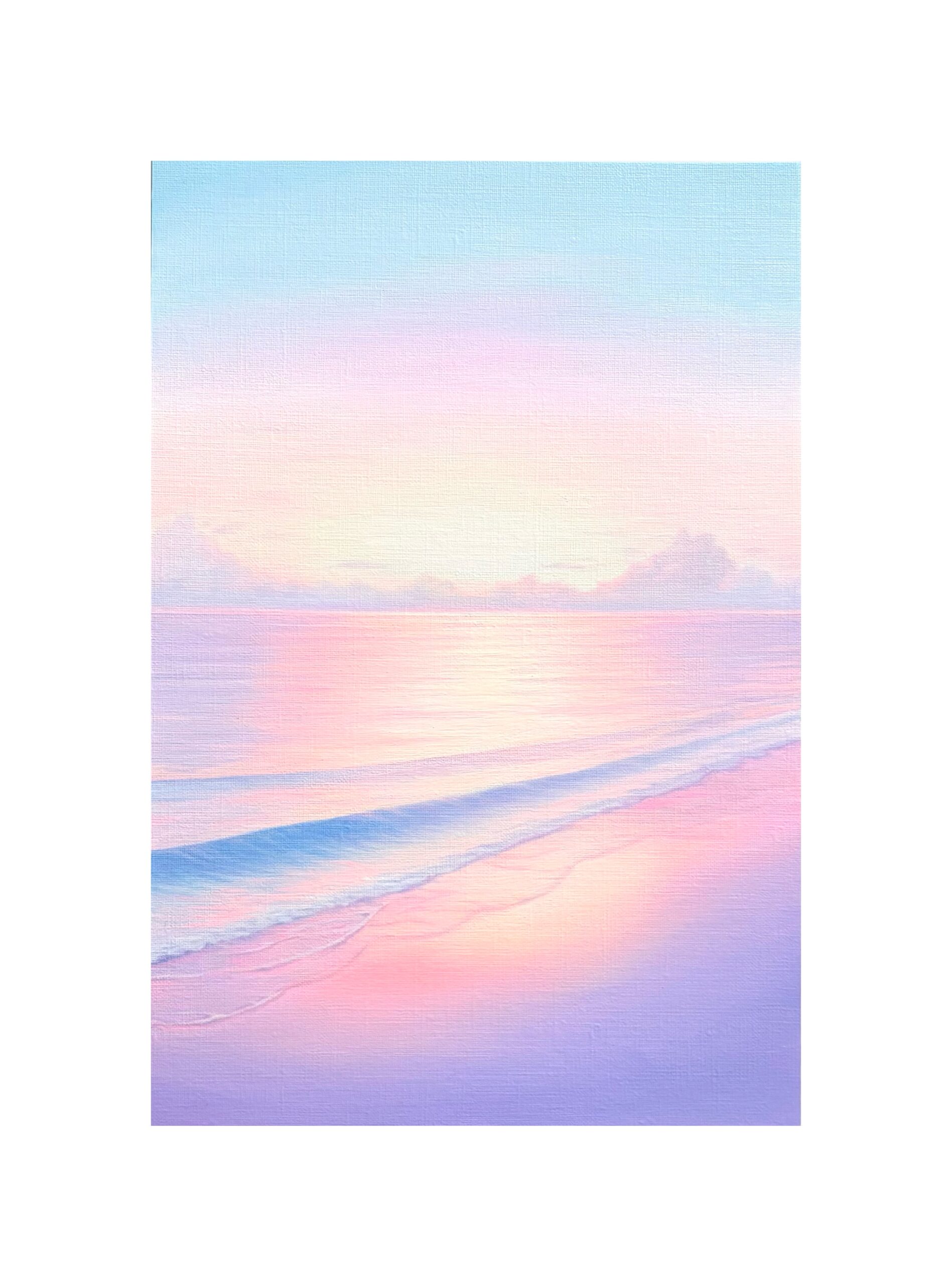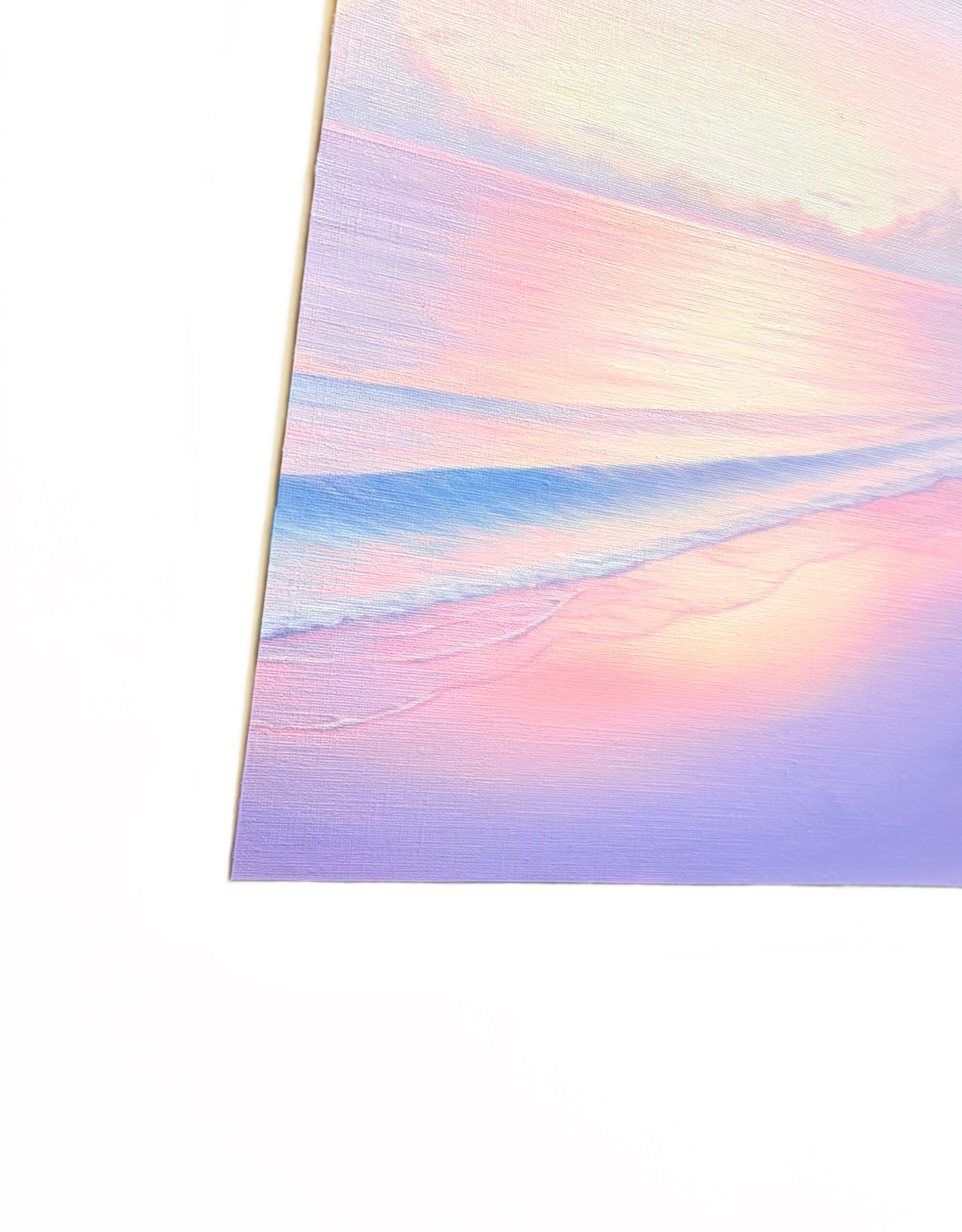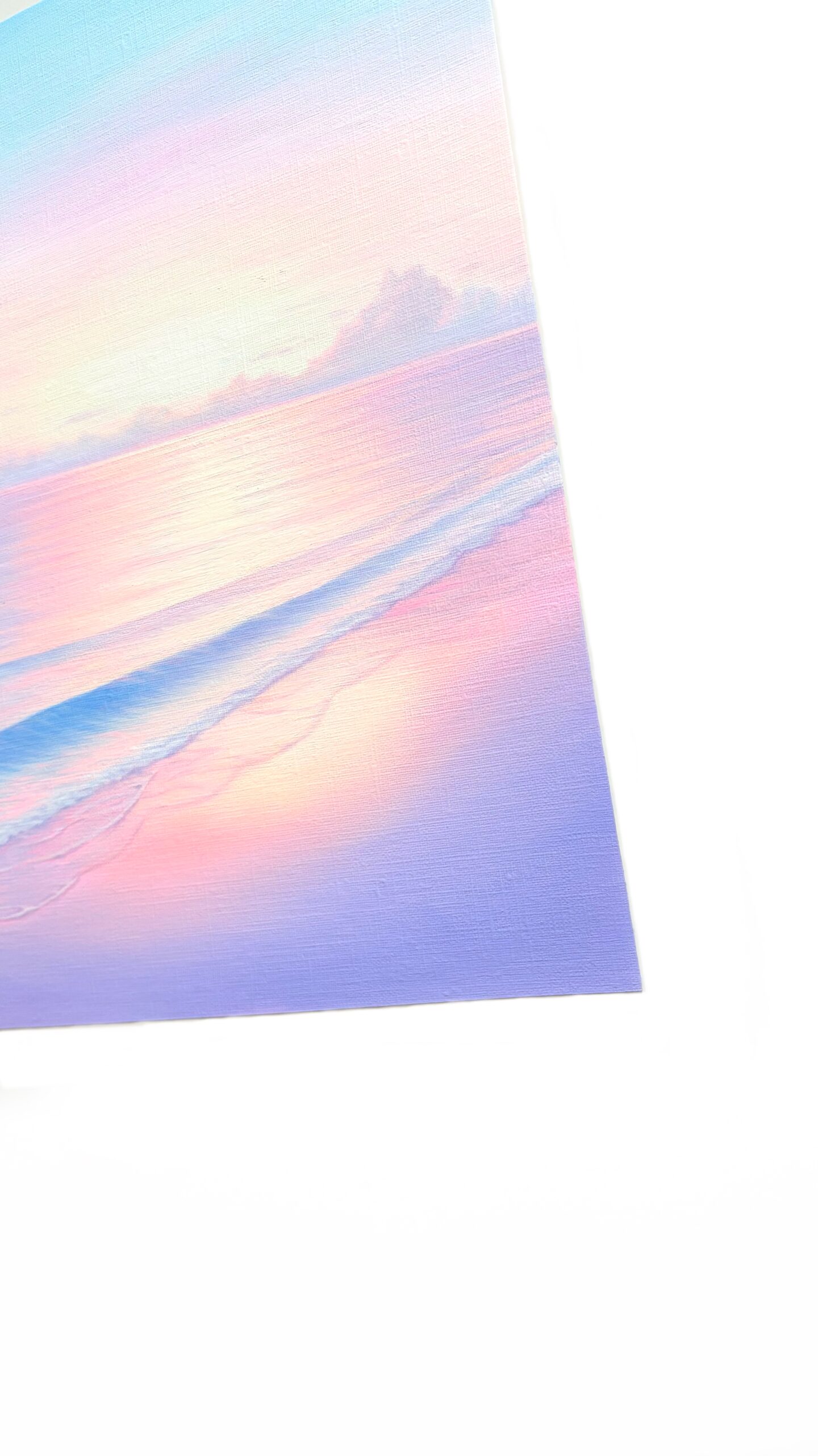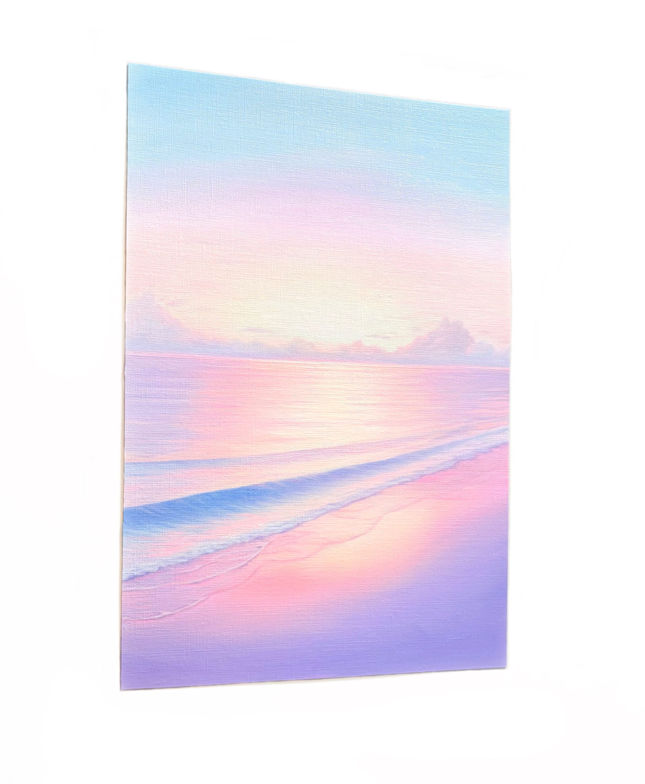 温かいシャーベットカラーに染まる空が、海面に当たりゆっくりとこちらに波打つ海の様子を描いた柔らかい印象の作品です。