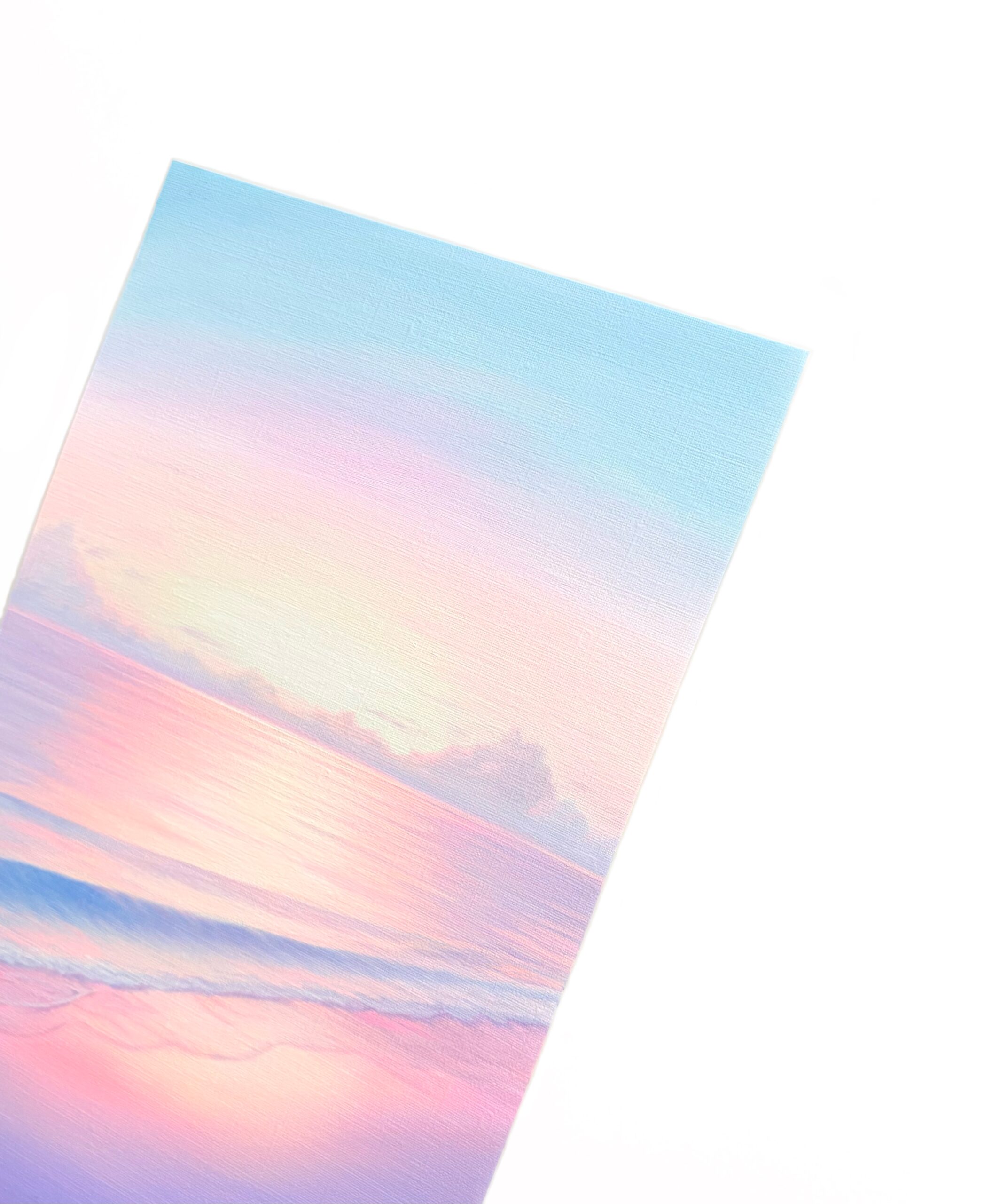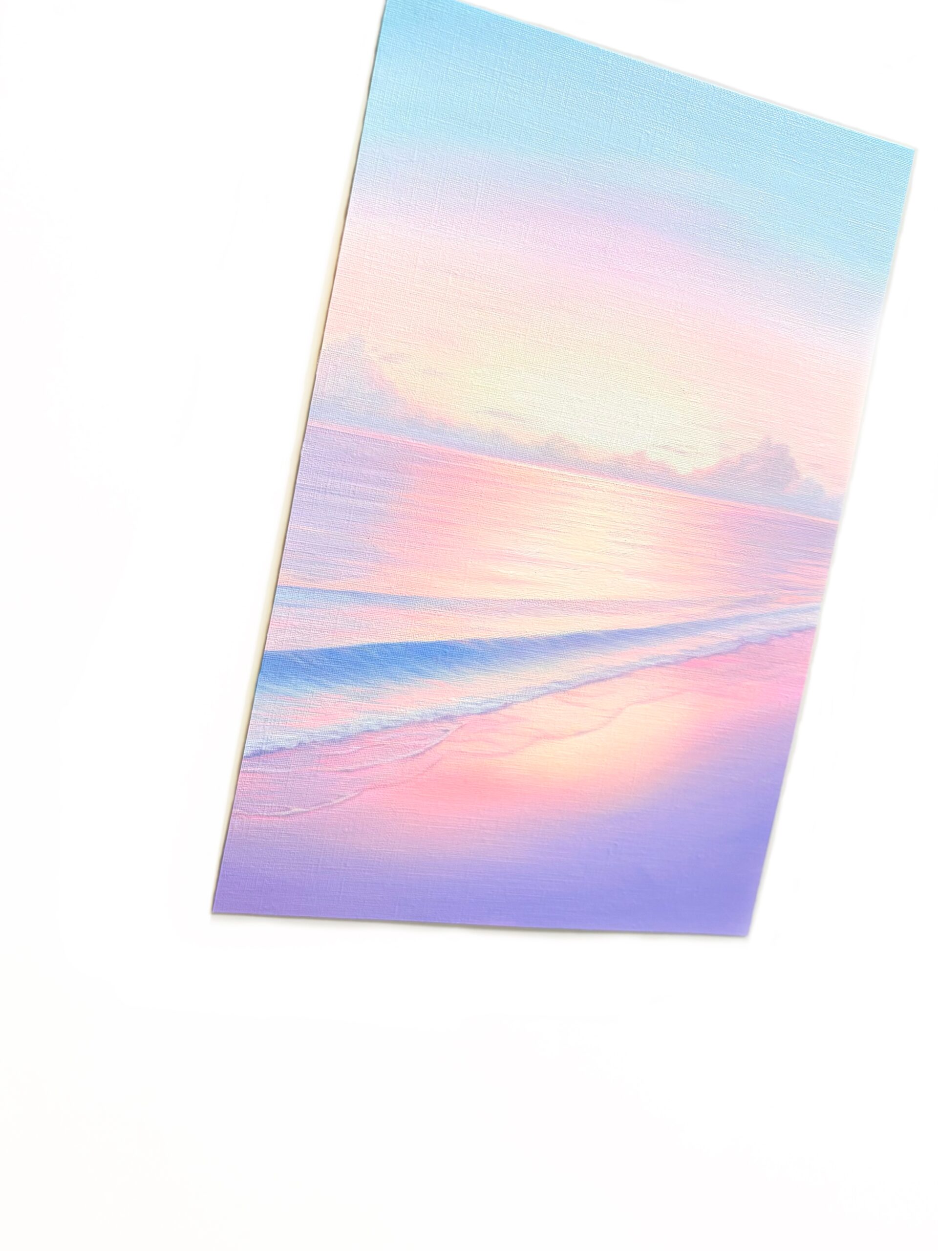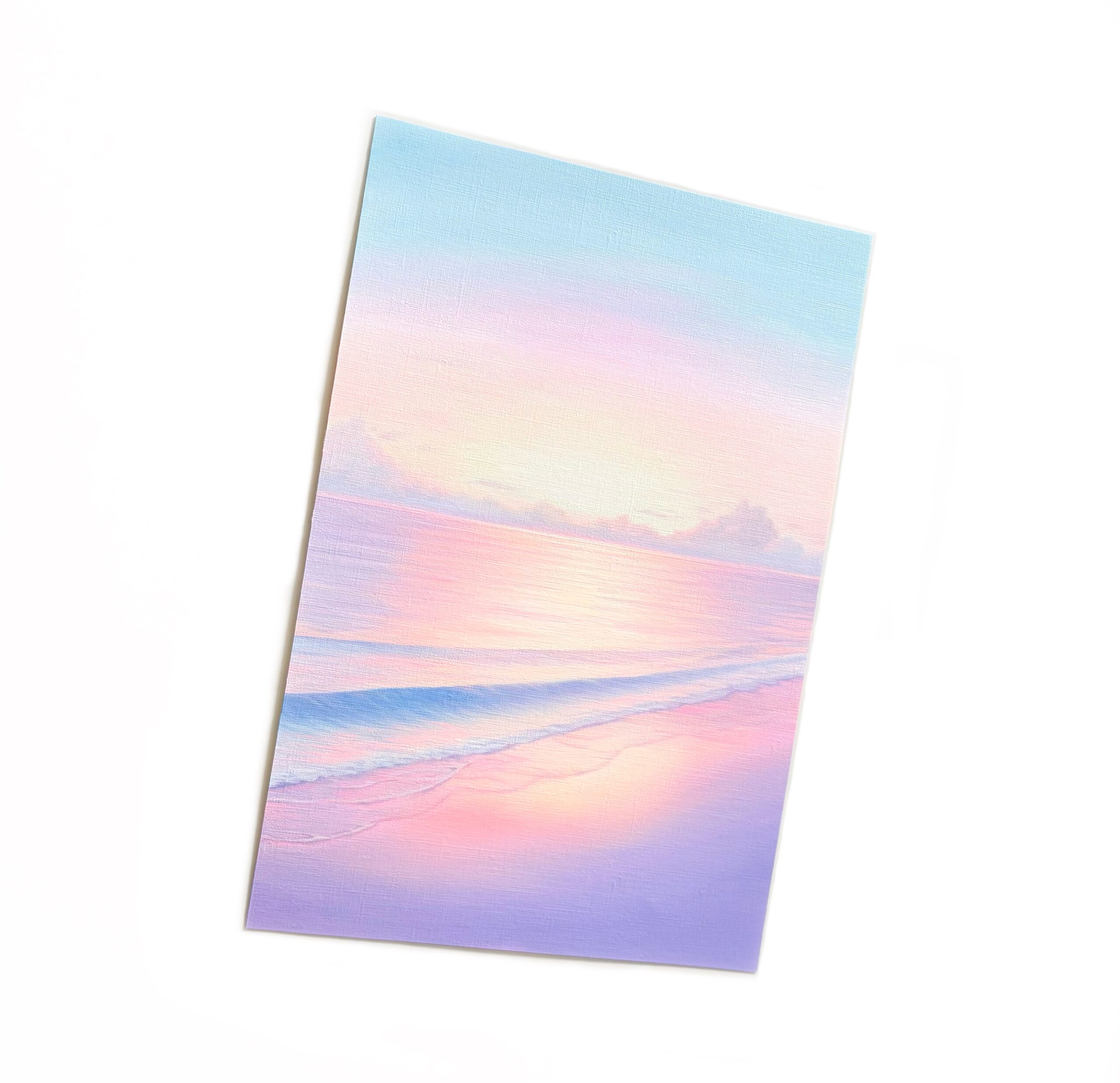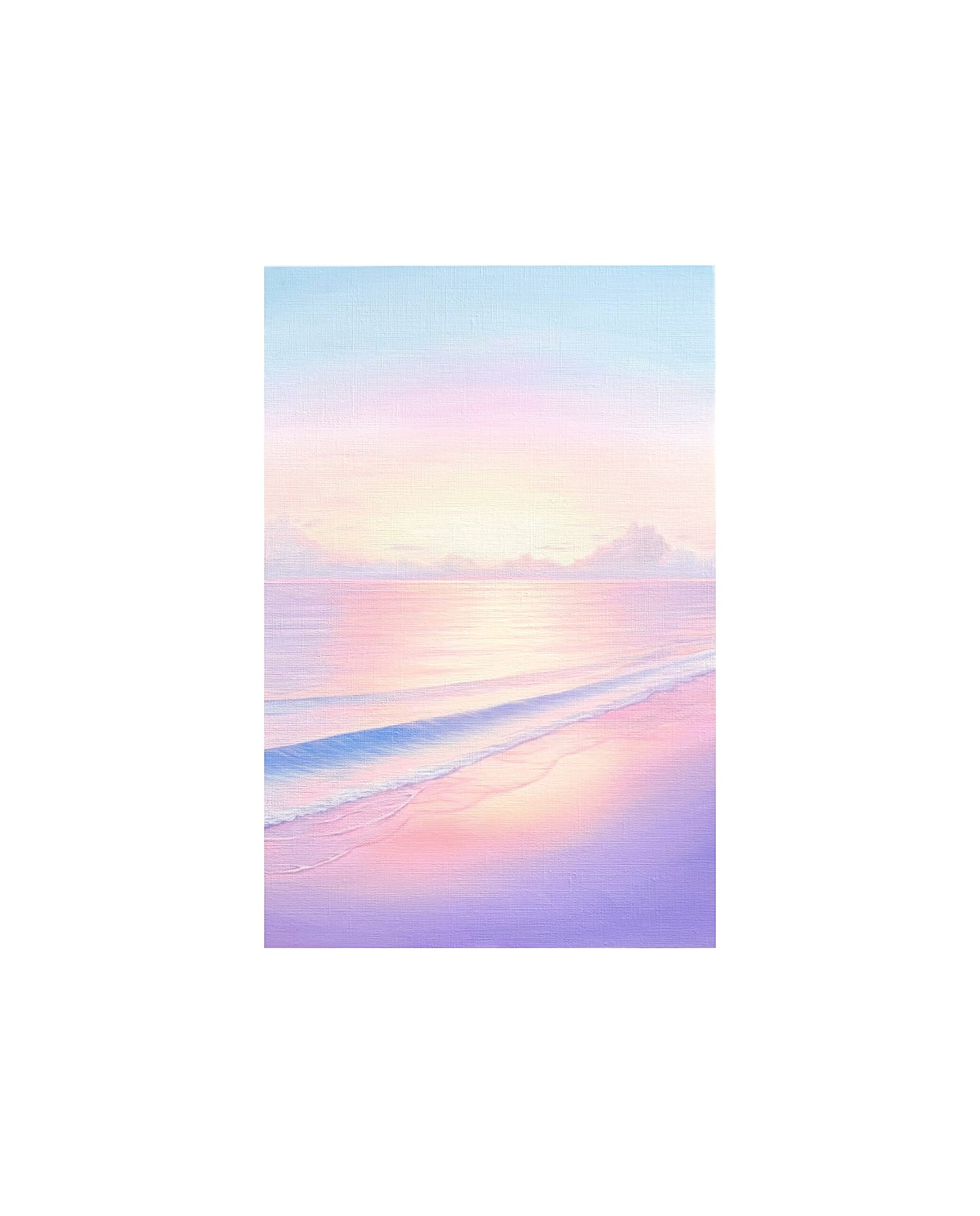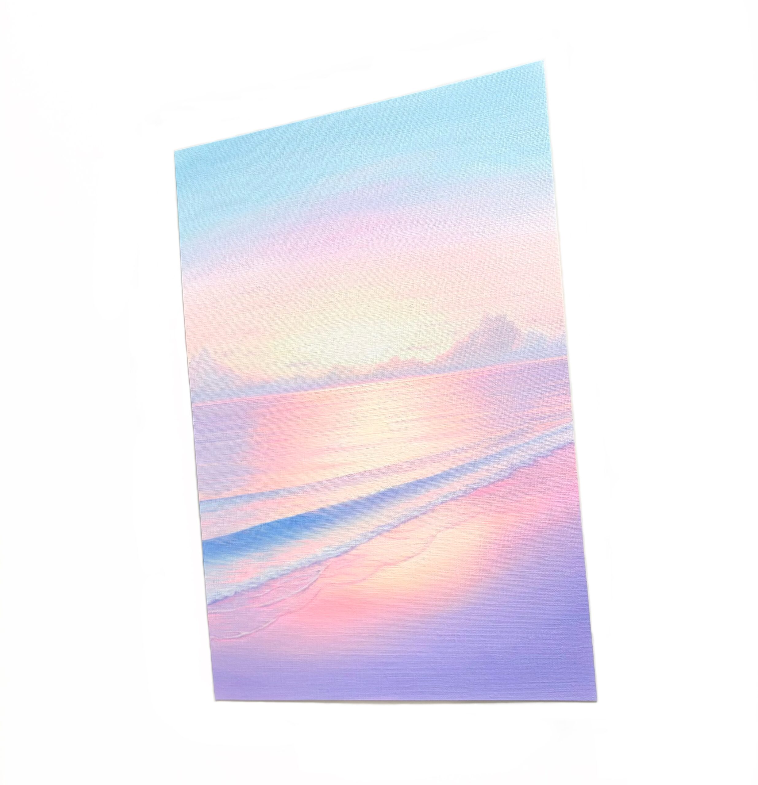 温かいシャーベットカラーに染まる空が、海面に当たりゆっくりとこちらに波打つ海の様子を描いた柔らかい印象の作品です。