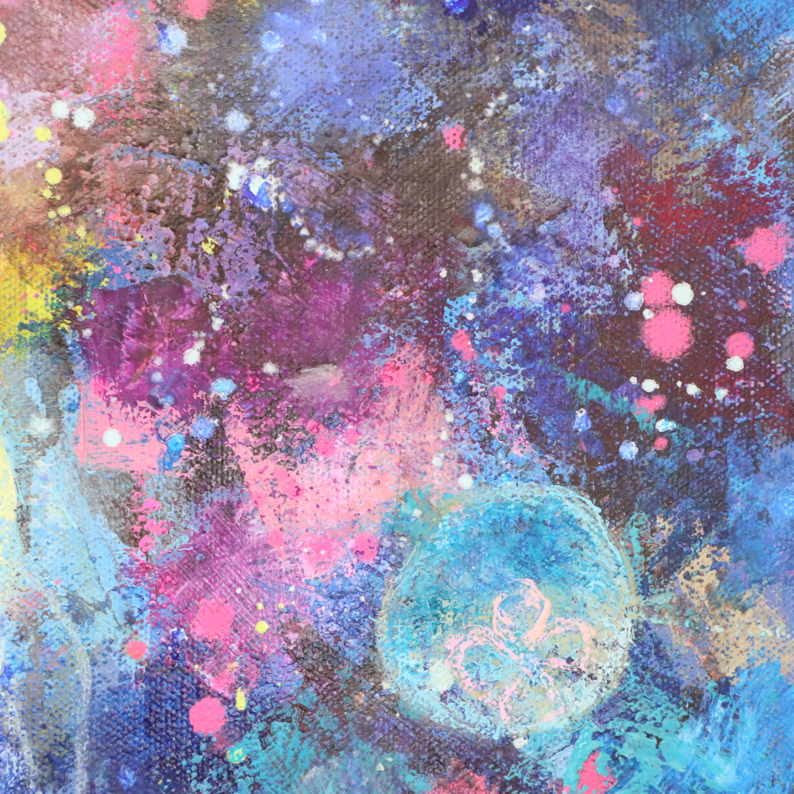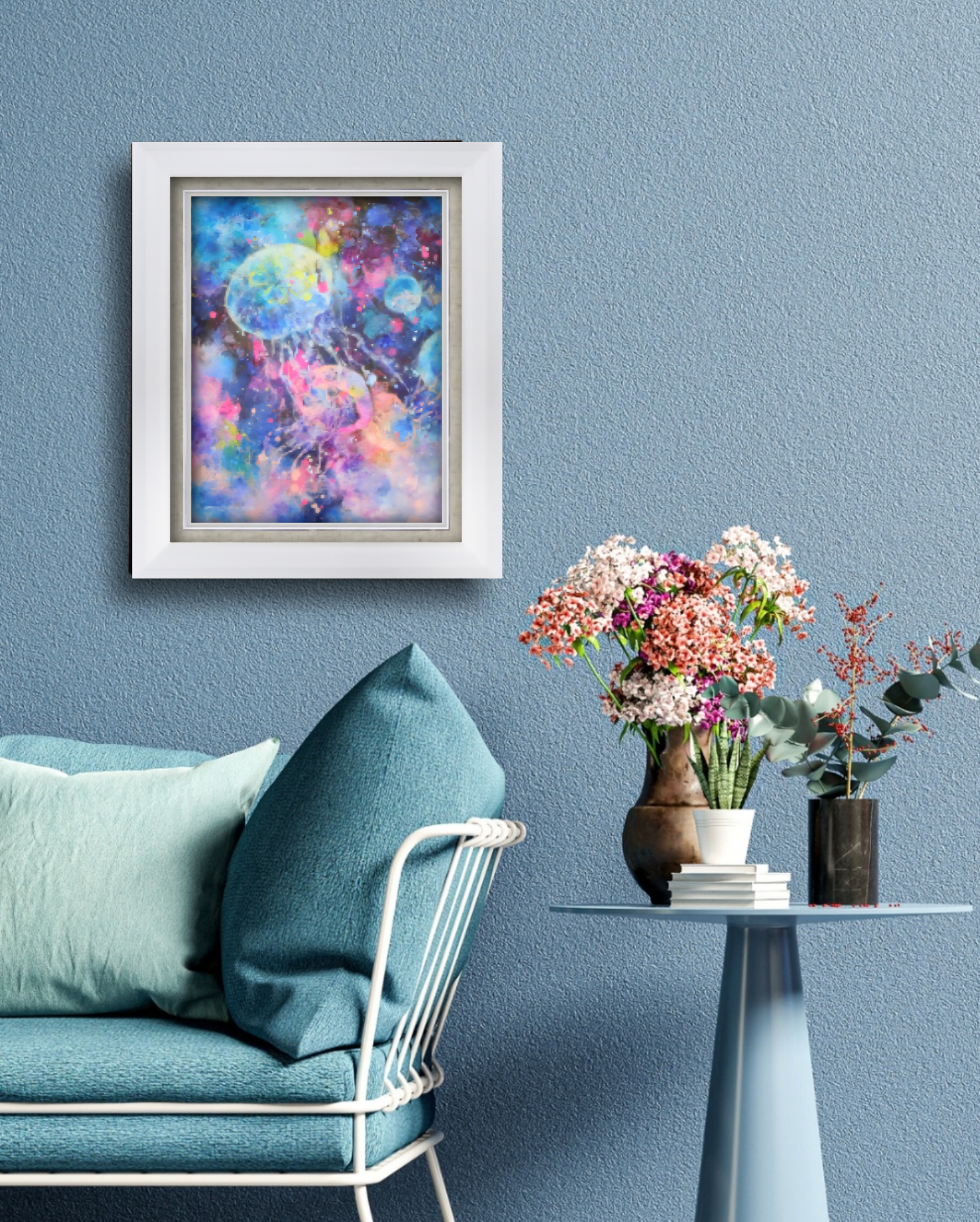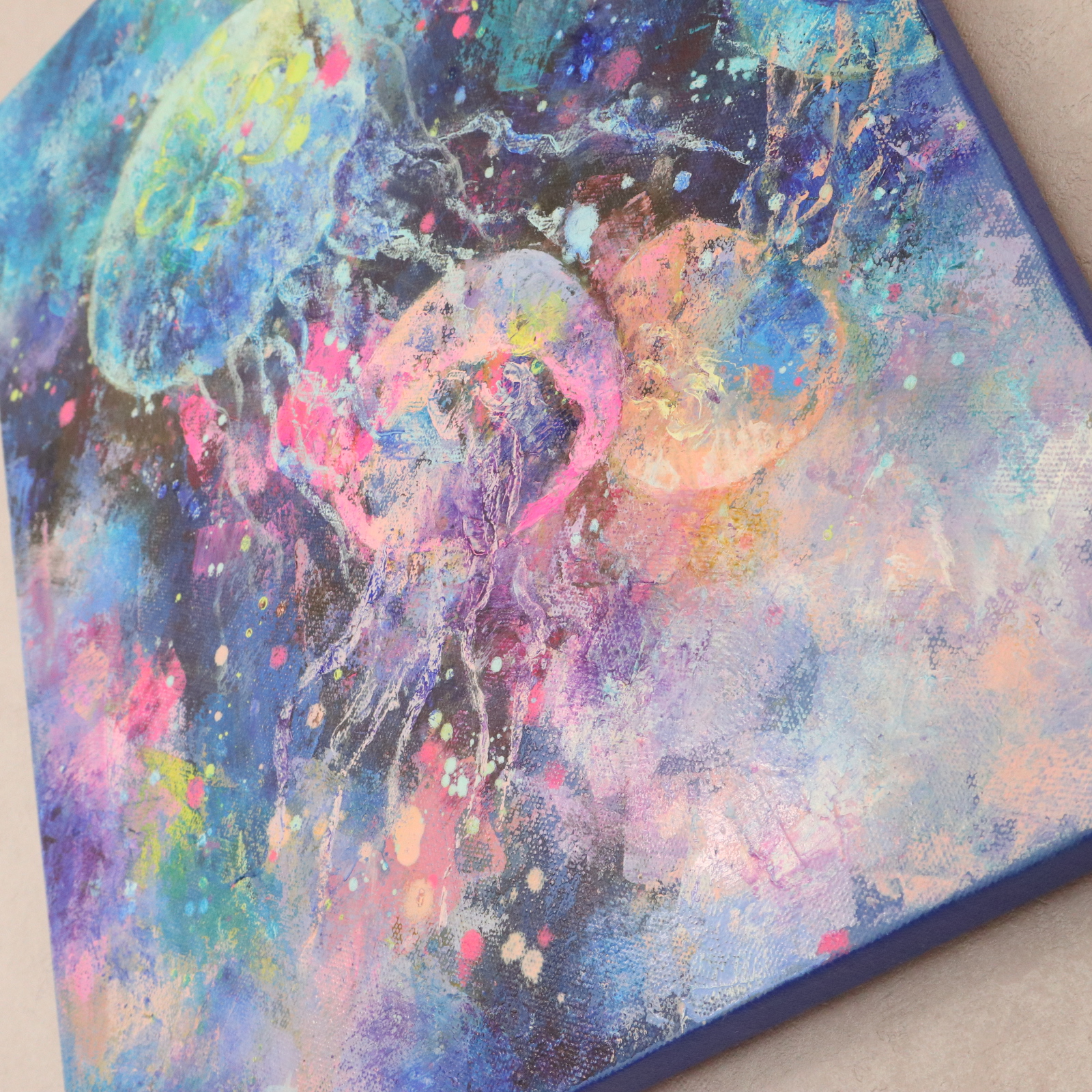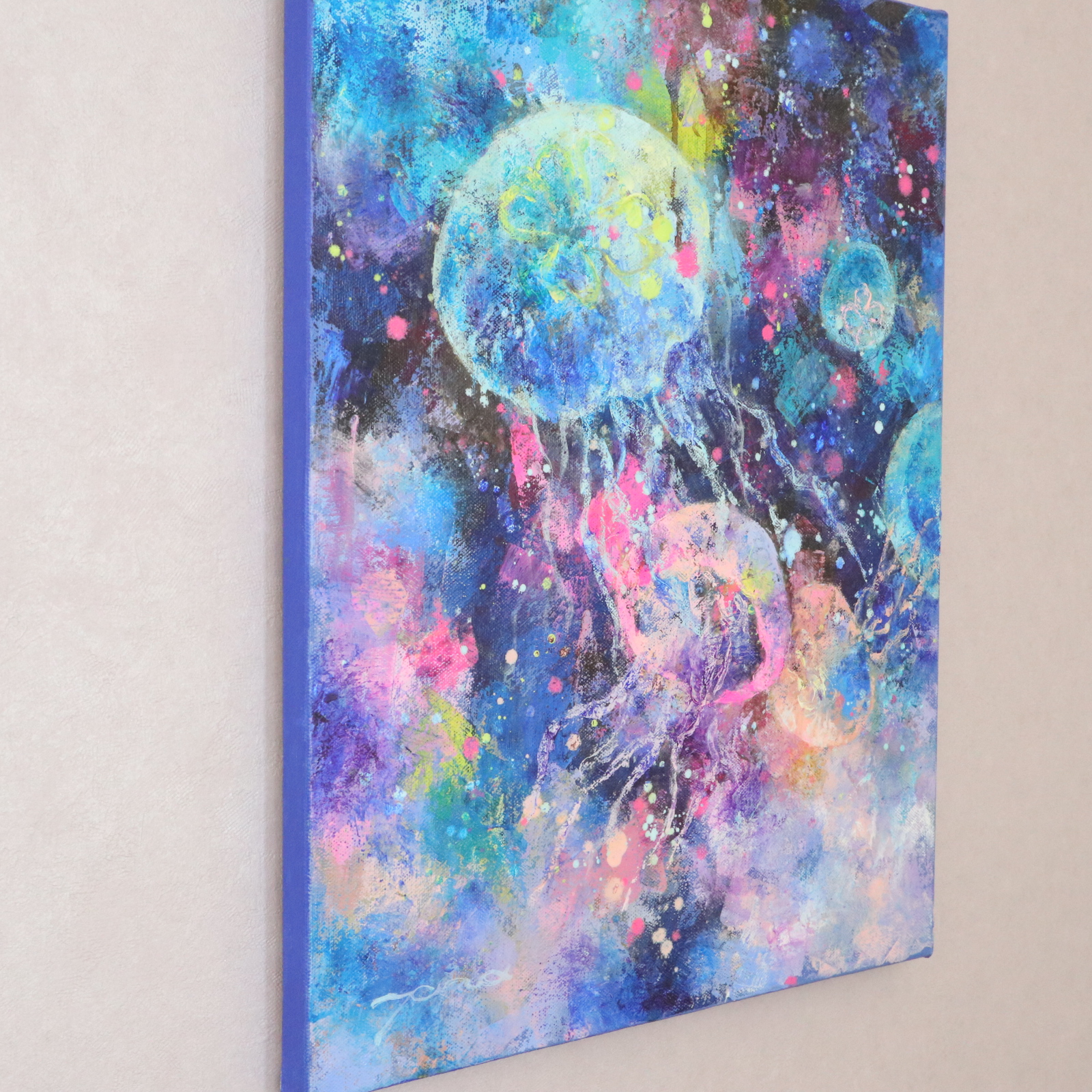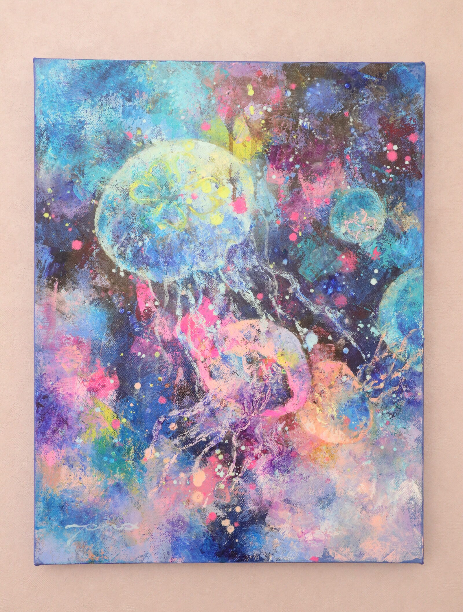 クラゲをモチーフに半抽象画に仕上げました。薄く溶いた油絵具を何層にも重ねて描き、最後にローラーを使い色を重ねて深みを出しました。色の重なりの美しさを感じていただけたら、嬉しいです。