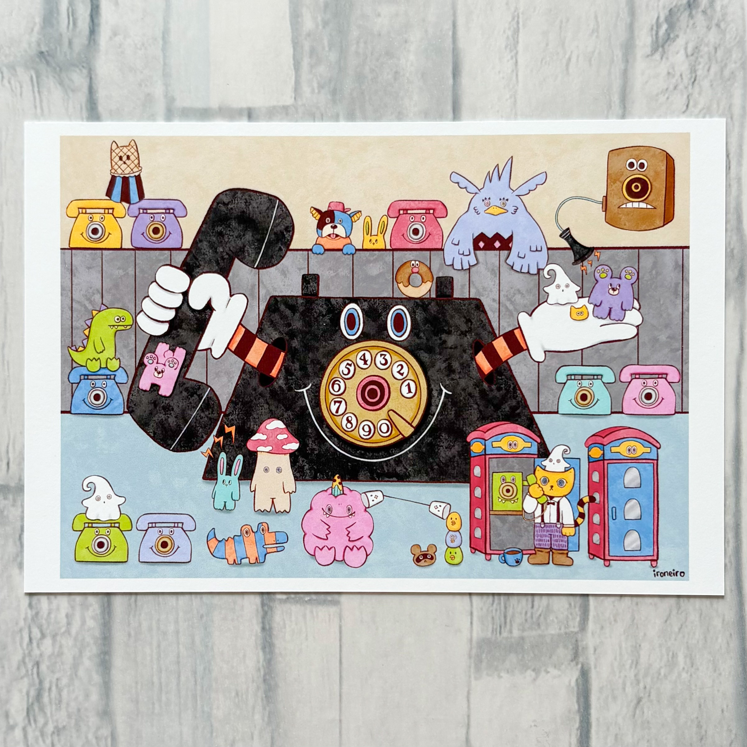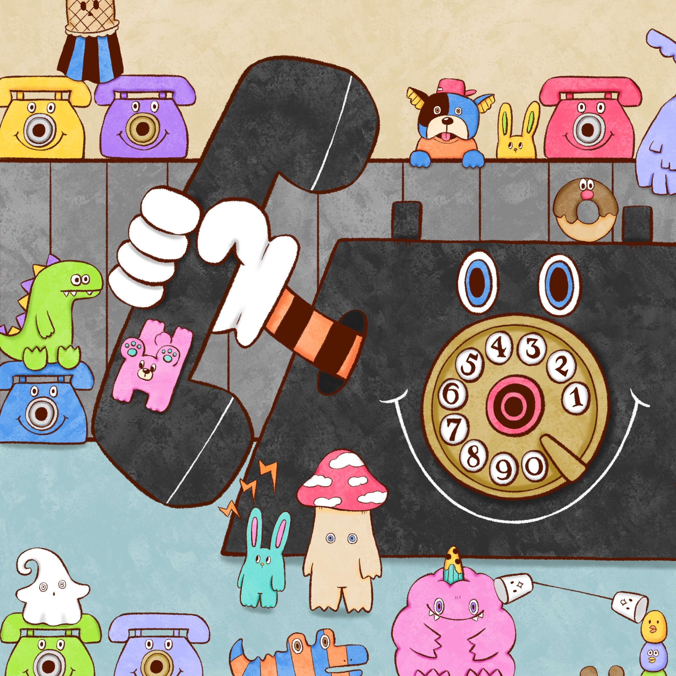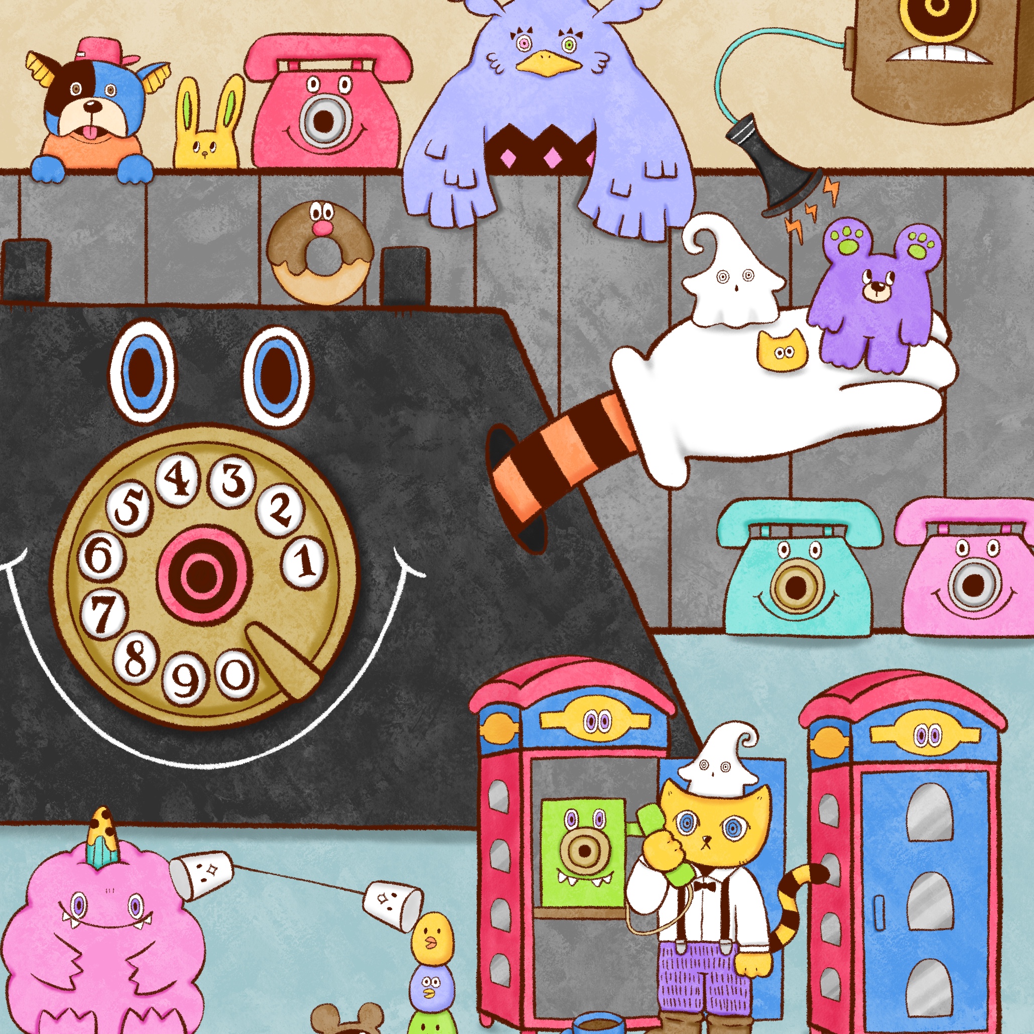 大きい黒電話、レトロ電話、公衆電話、糸電話などたくさんの電話たちが暮らしている家に遊びに来たシュレディンガーたち。