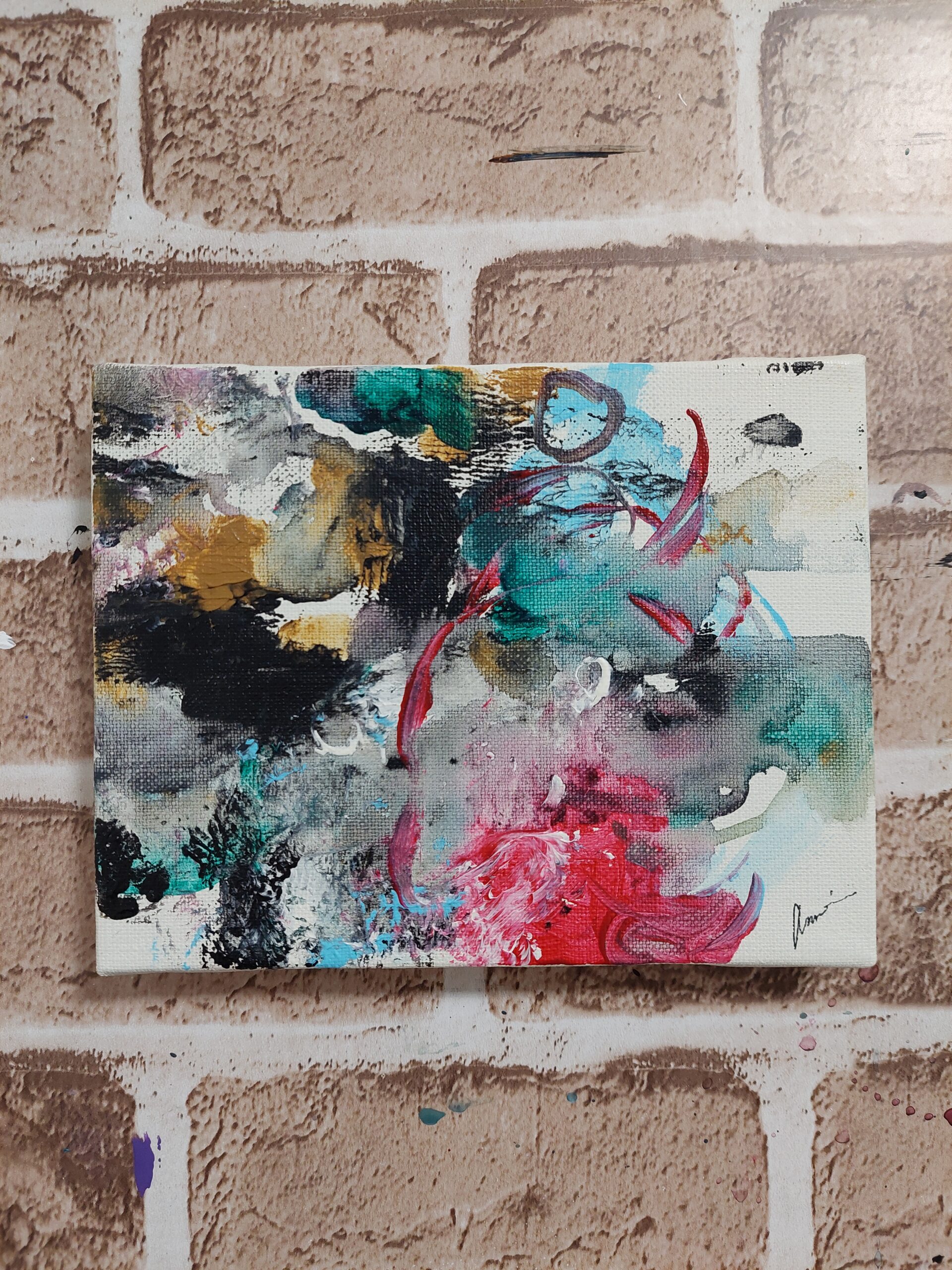 毎日、自分の感じた感情をドローイングしています。その思いを小さなキャンバスに積めました。裏側はヒモをつけていないので、壁に背の高い画ビョウをさして、かけて飾ってください。大きくないので、どんな場所でもあうと思います。あなたのその日の気持ちにあったものを選んでみてくださいね。