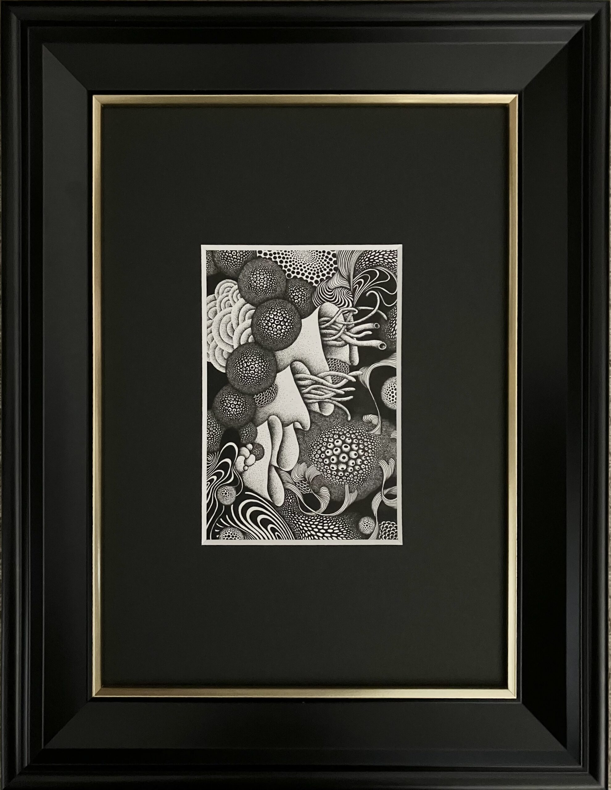 下描きせずに描いた点や線が生き生きとしている緻密で面白い作品。小さな作品ですがとても存在感があります。