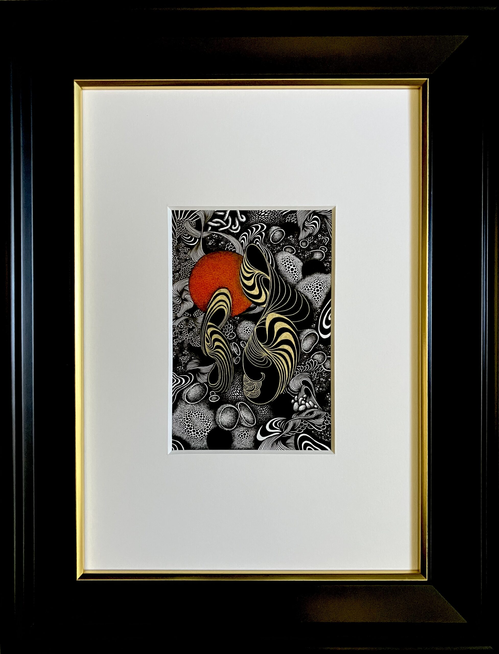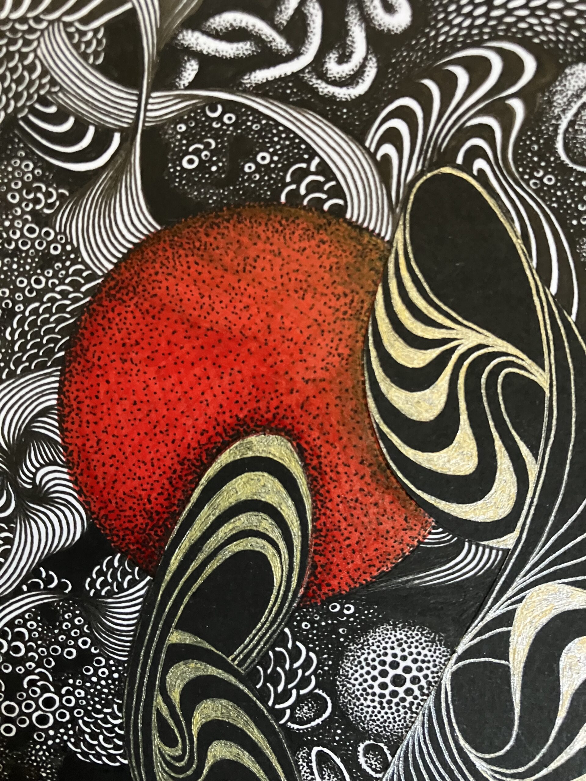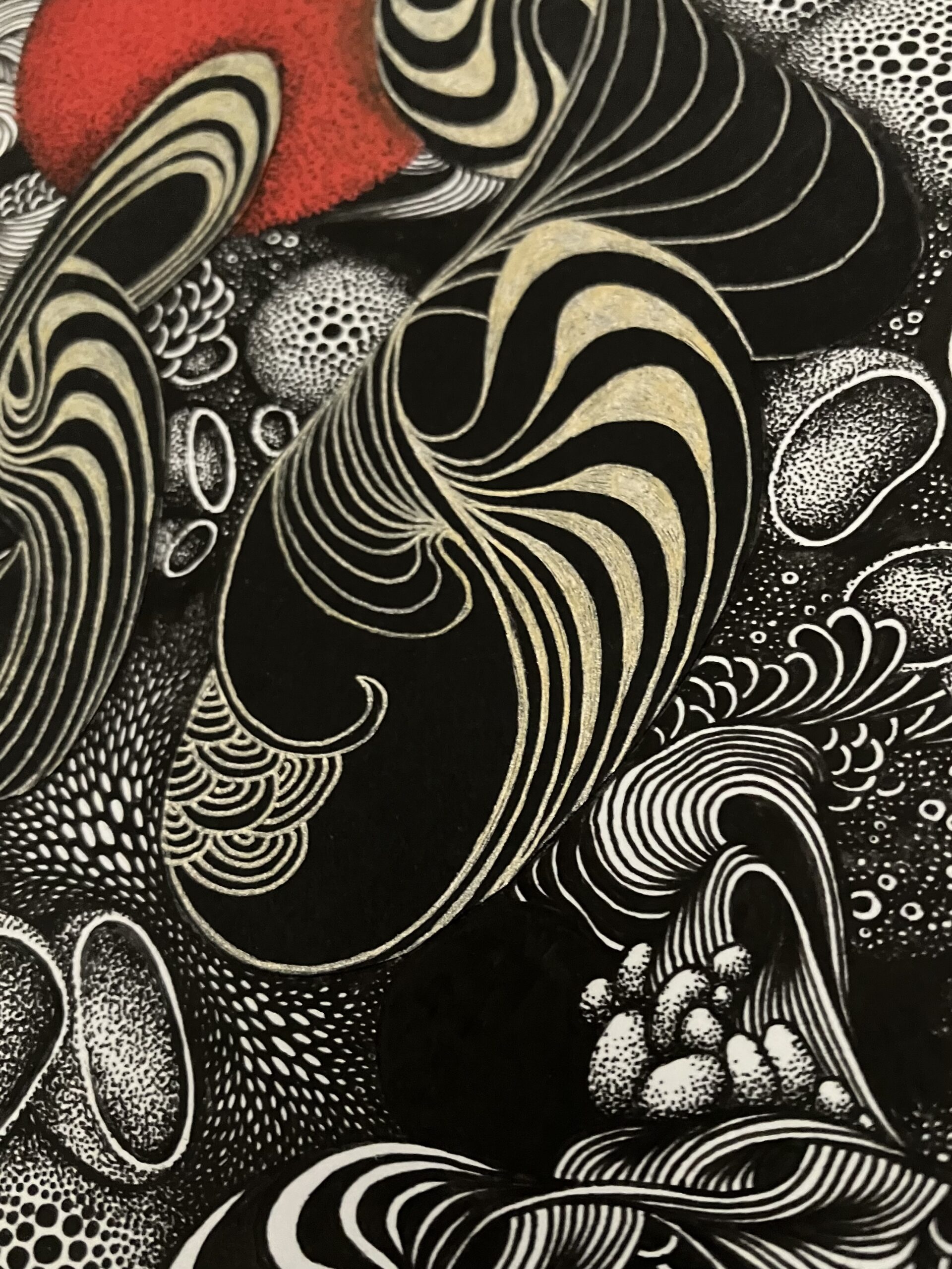 私の好きな黒、金、赤の数種類のペンを使用し下描きはせず自由に描き一部コラージュしました。