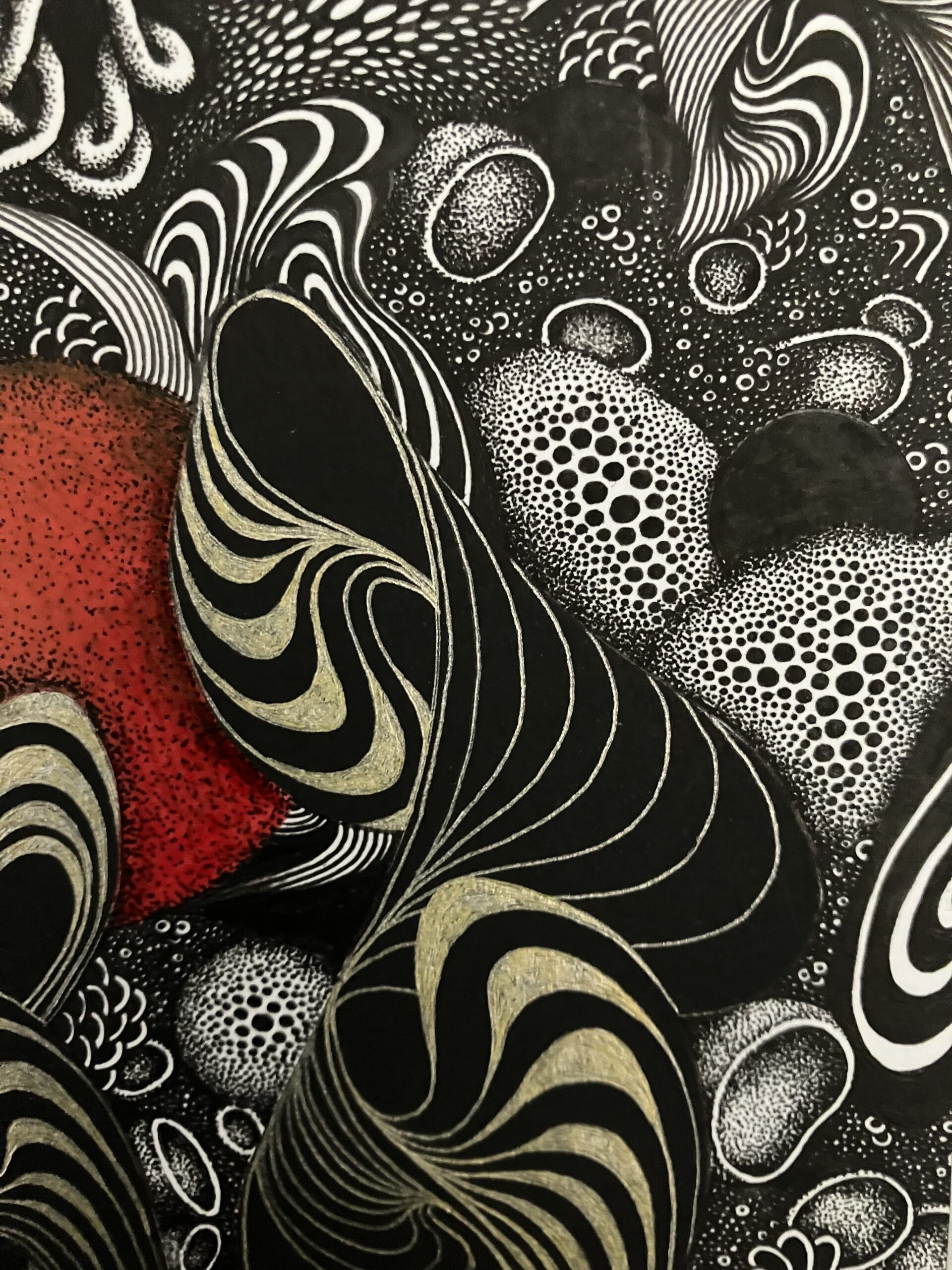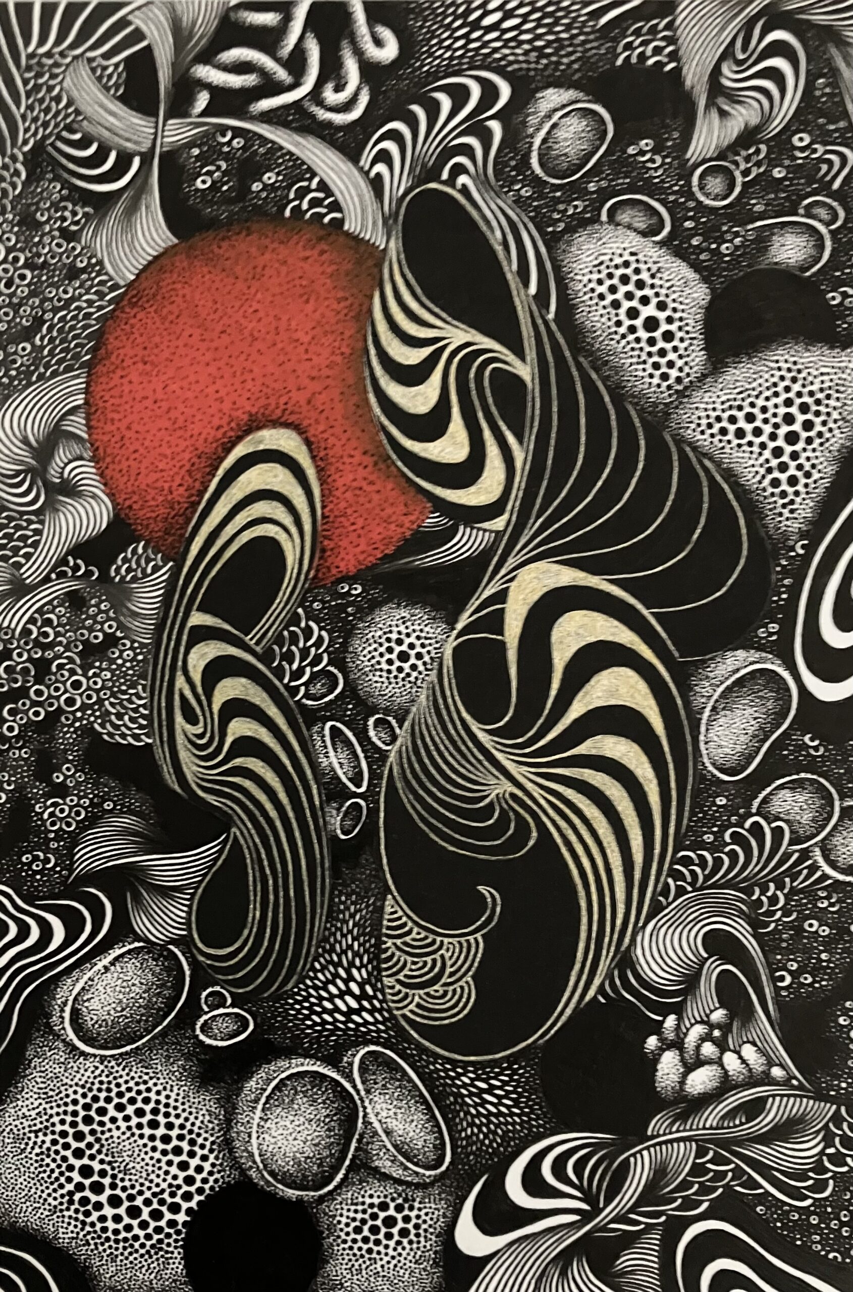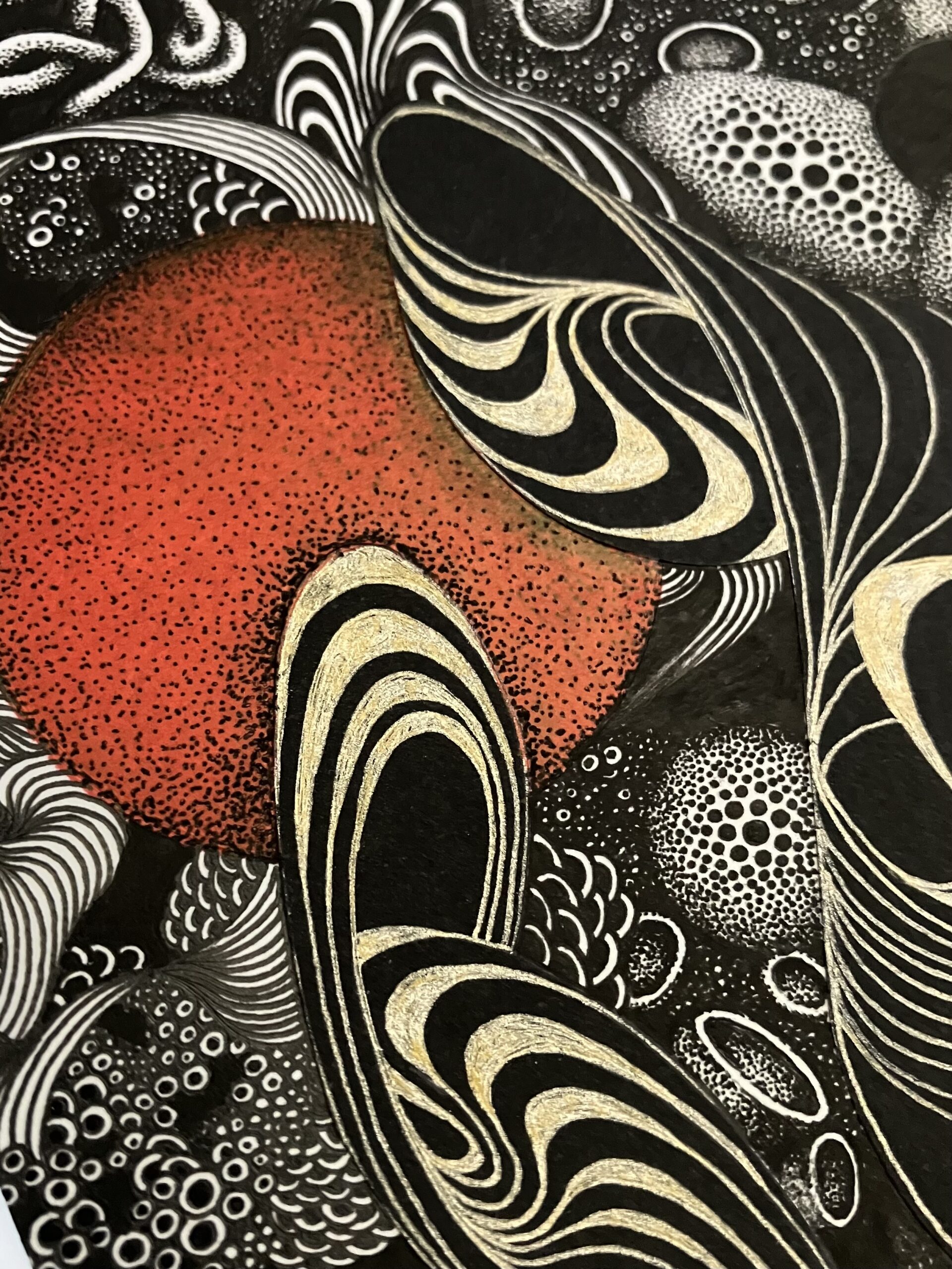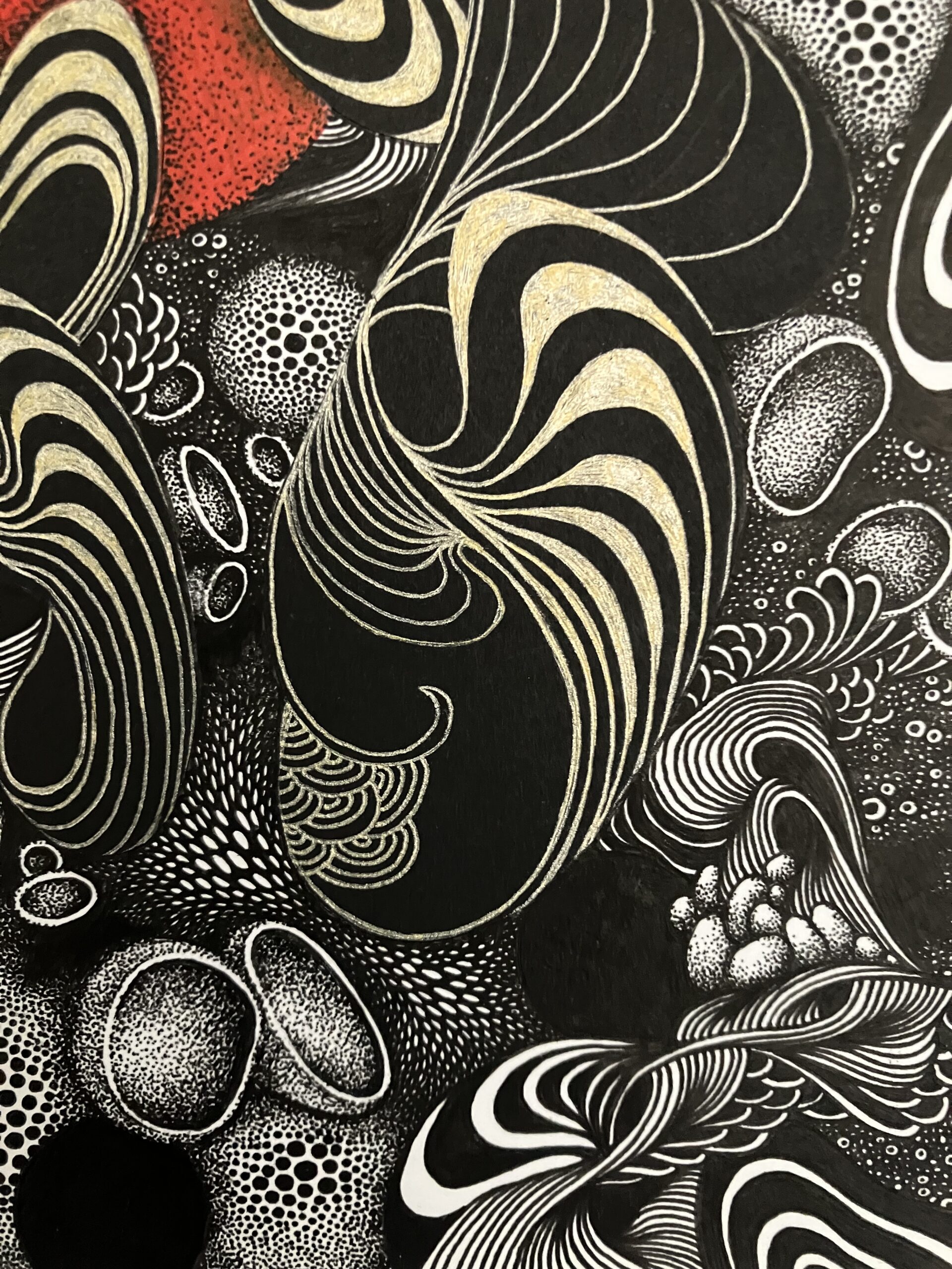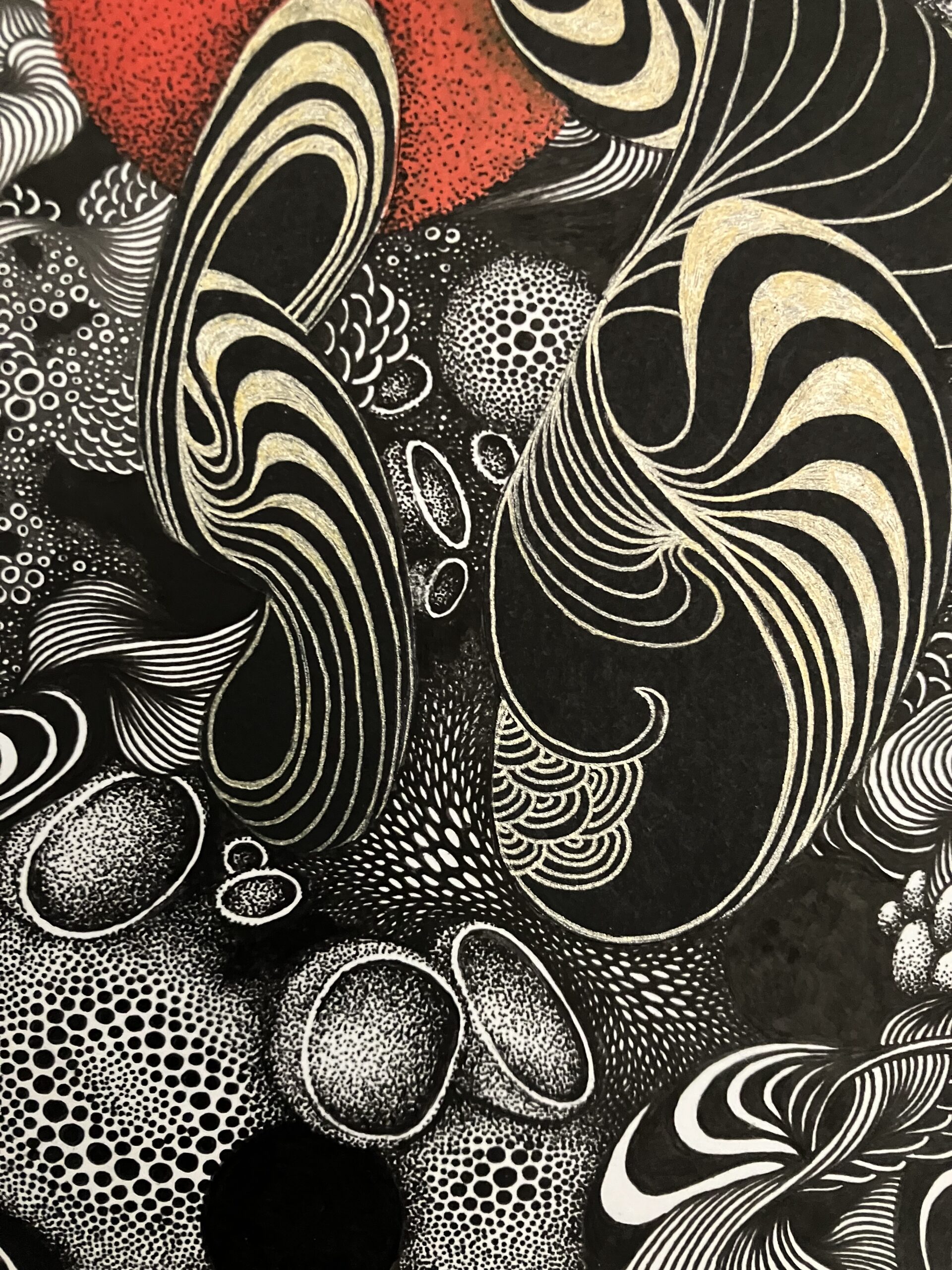 完成が想像できないワクワク感、緊張と期待が入り混ざった感覚の中ペンを走らせてたのしんでいる。