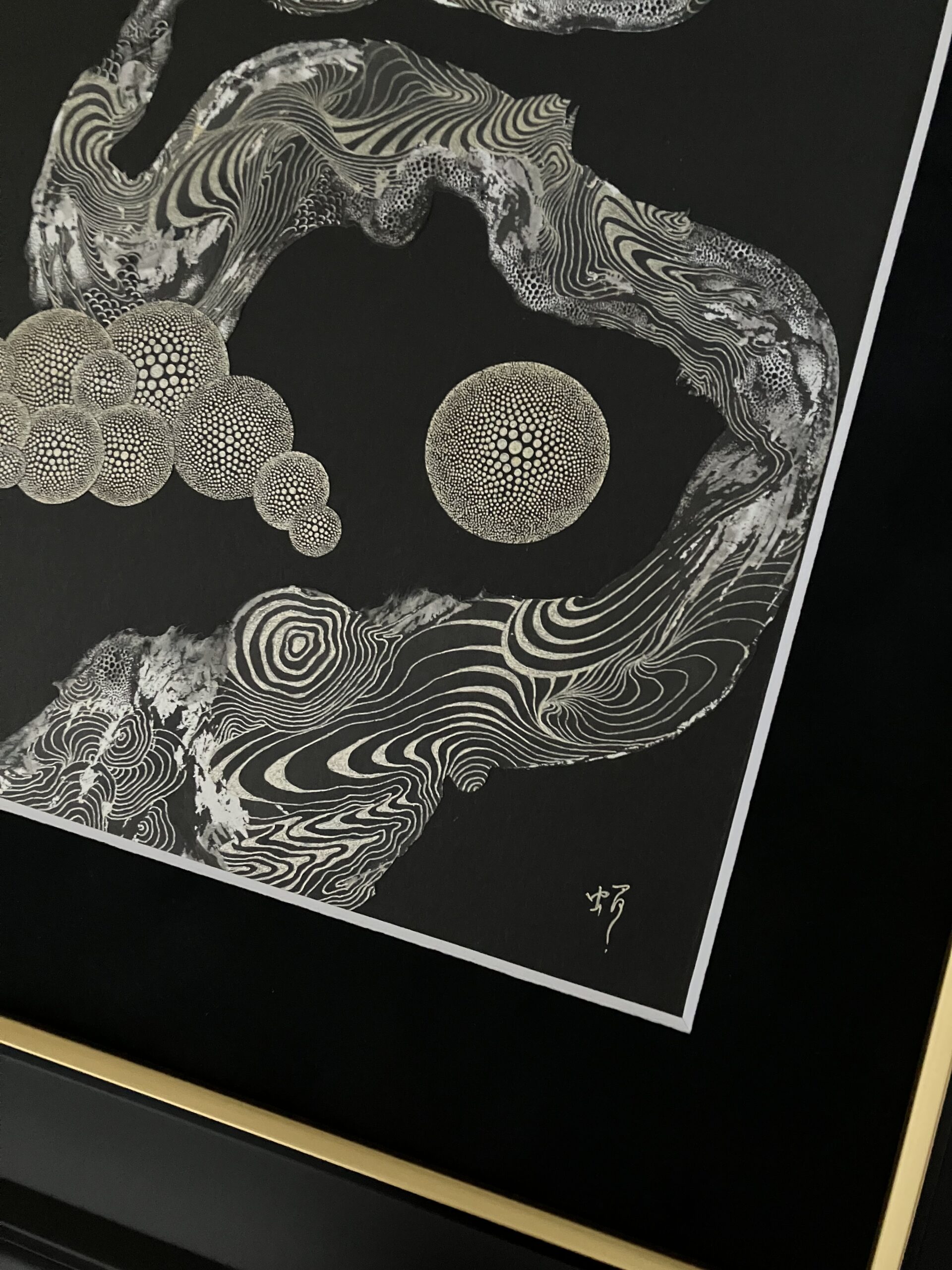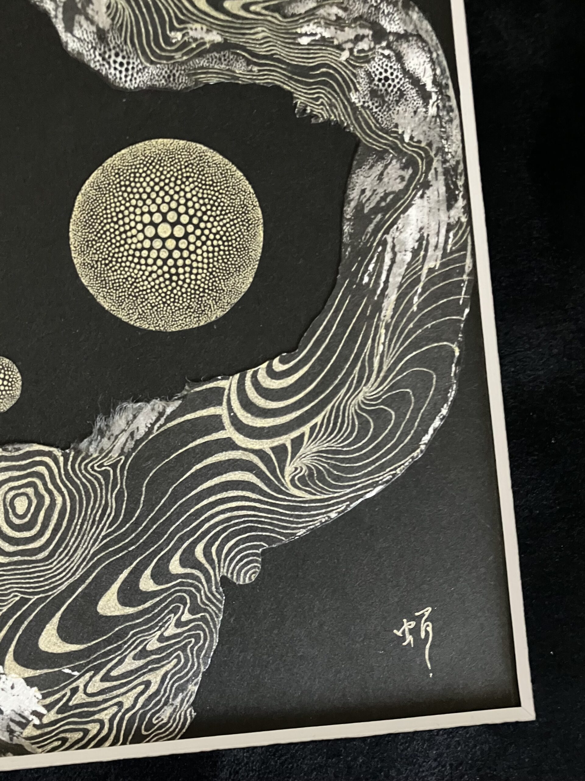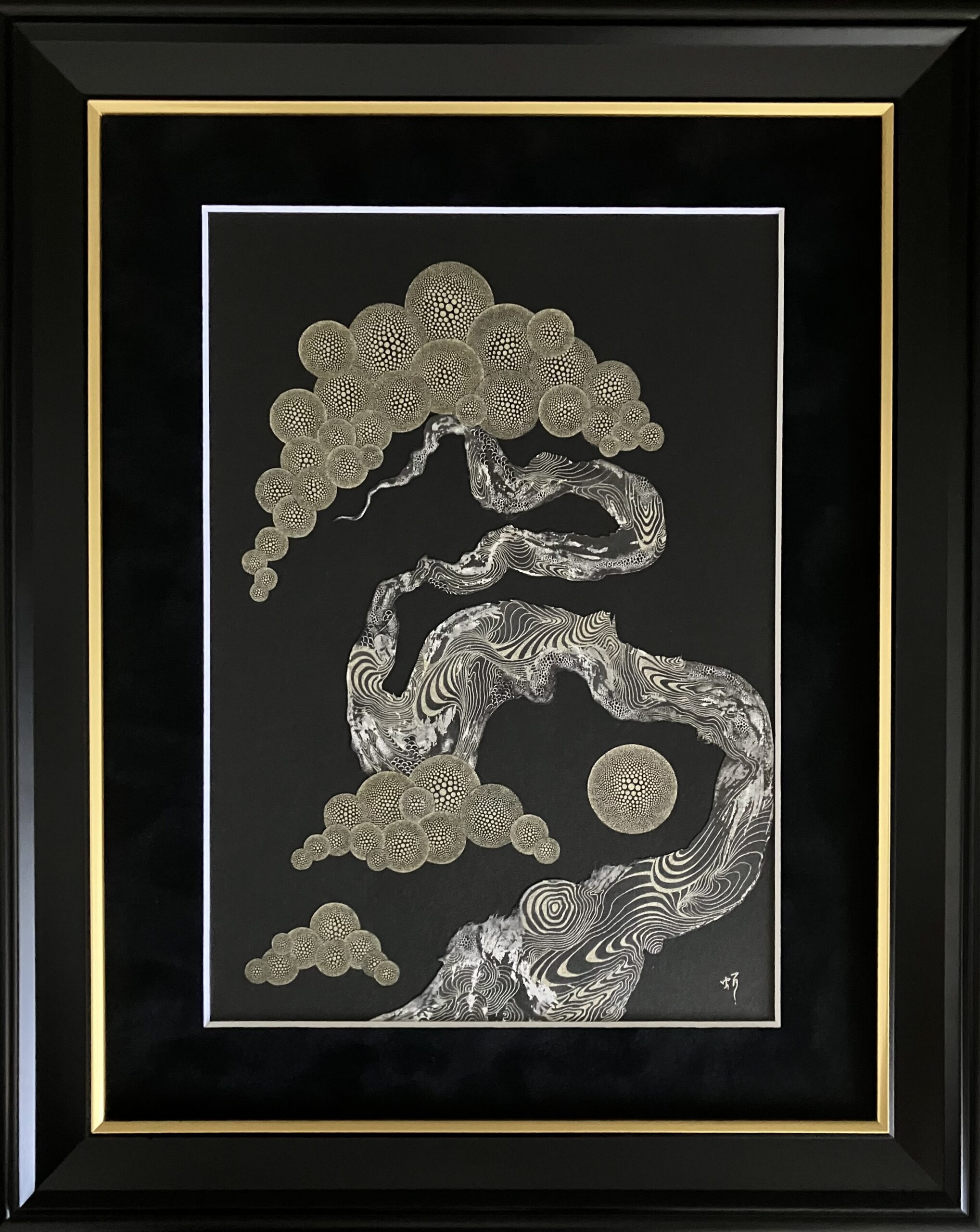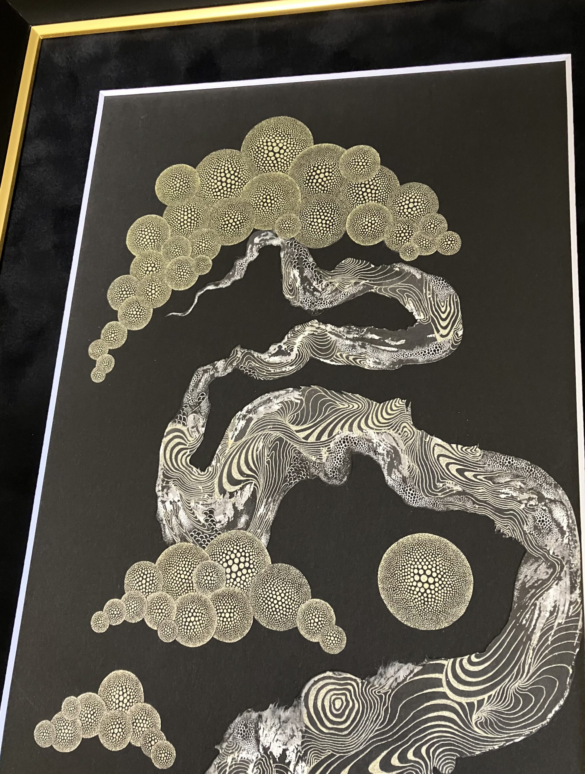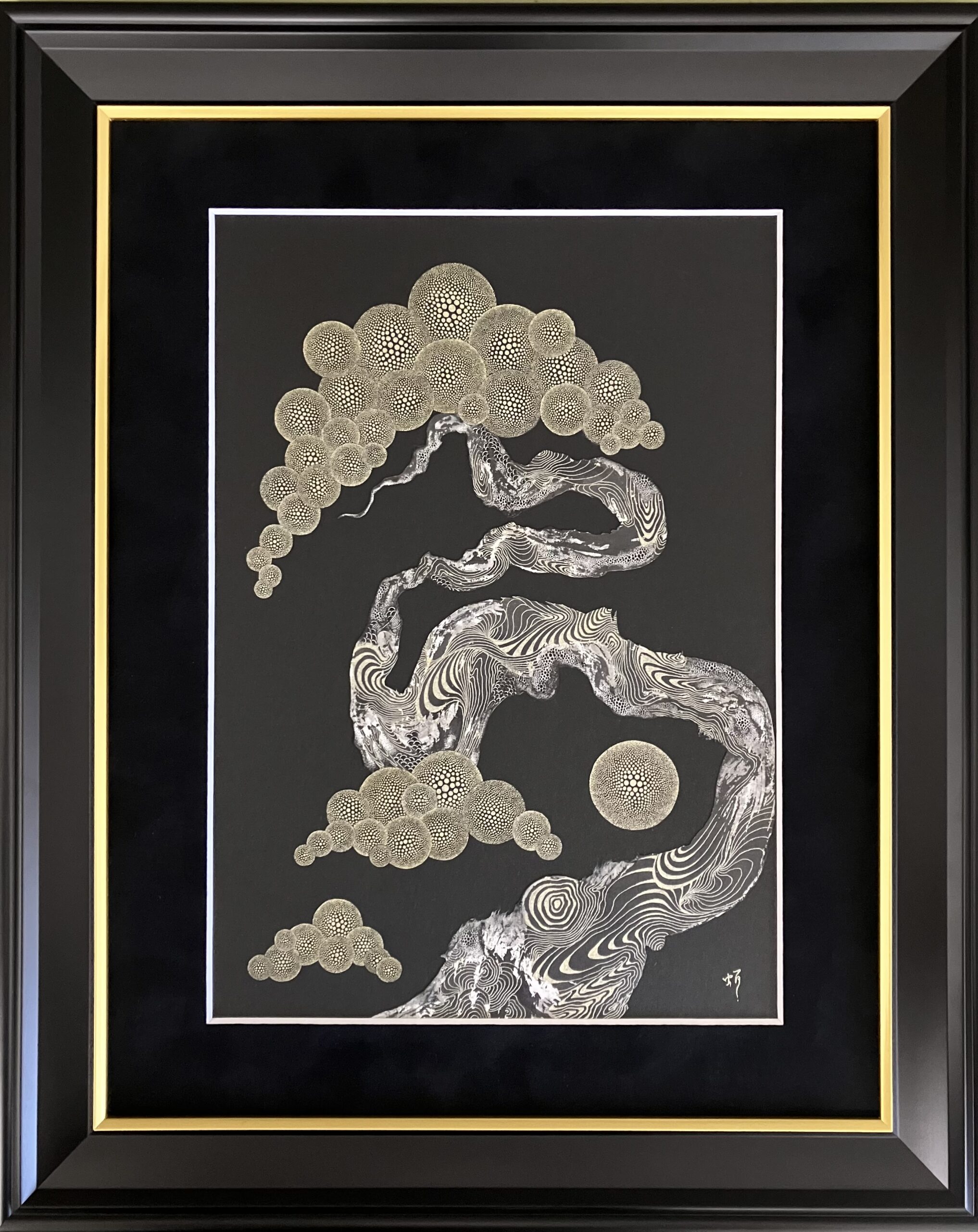 阿波紙に墨を滲ませ2種のボールペンで幹を表現。葉はドットの集合体の円を一枚一枚丁寧に描き、重ね貼り合わせたコラージュ。(貼り合わせた箇所は段差があります)