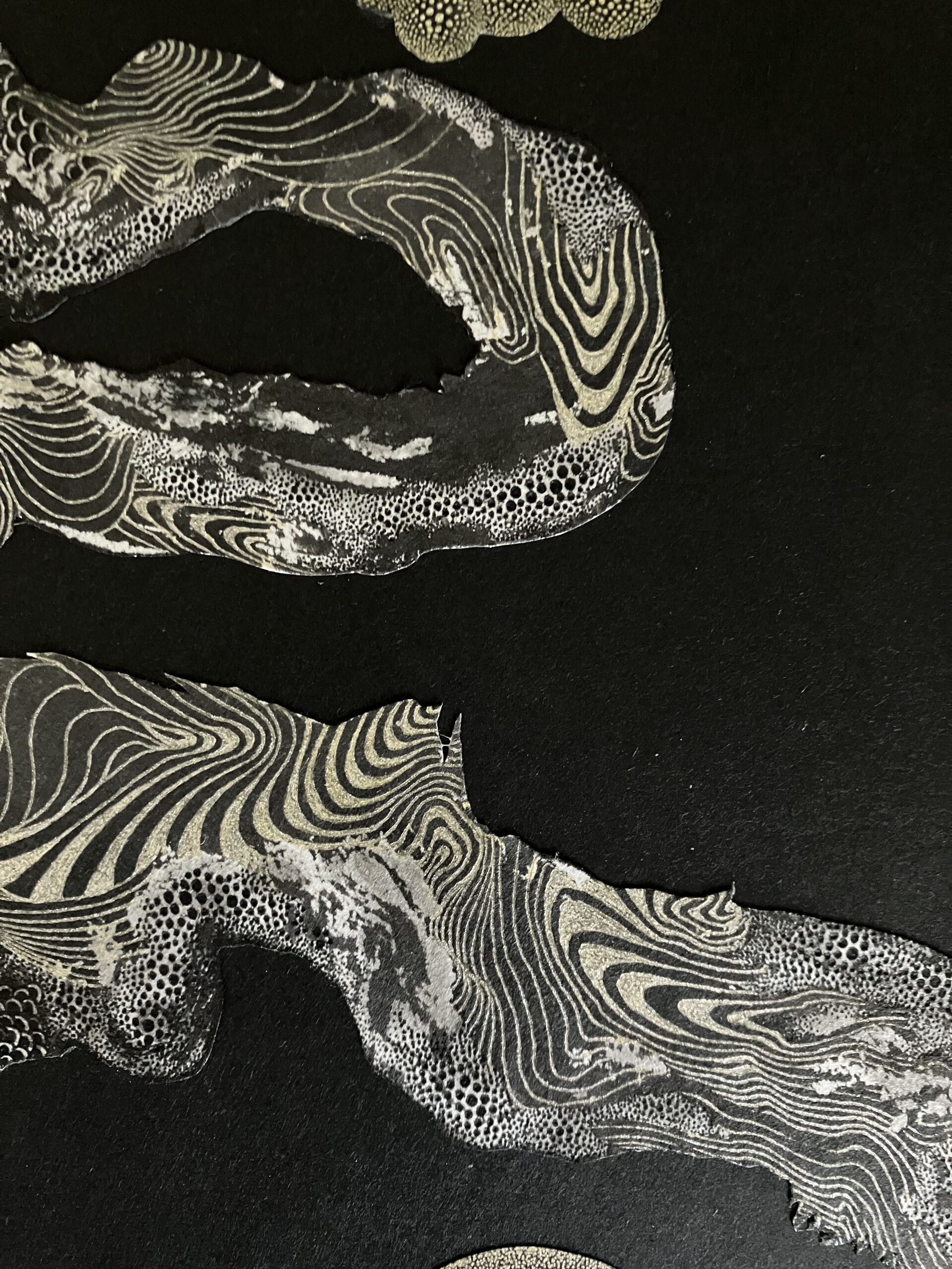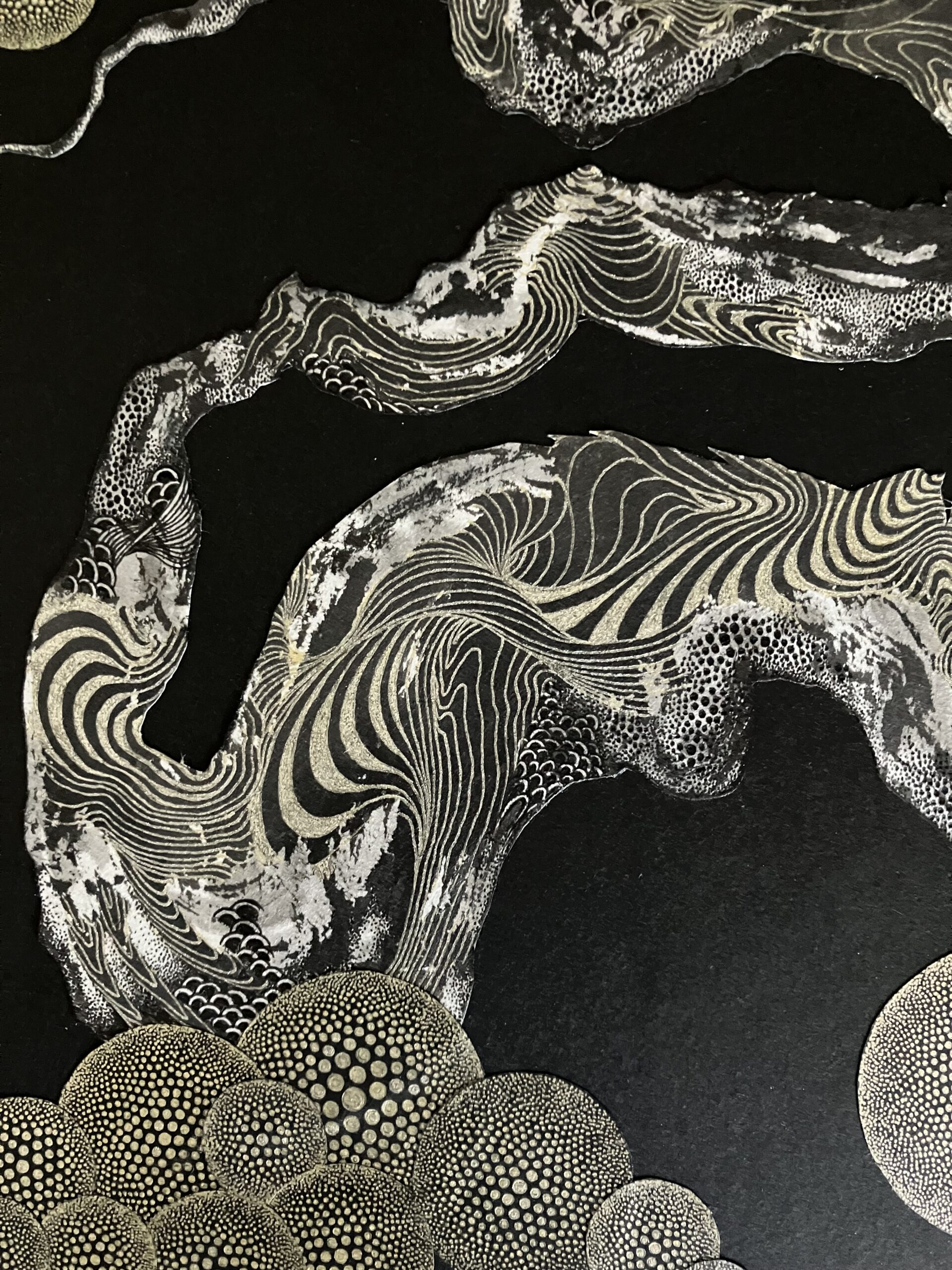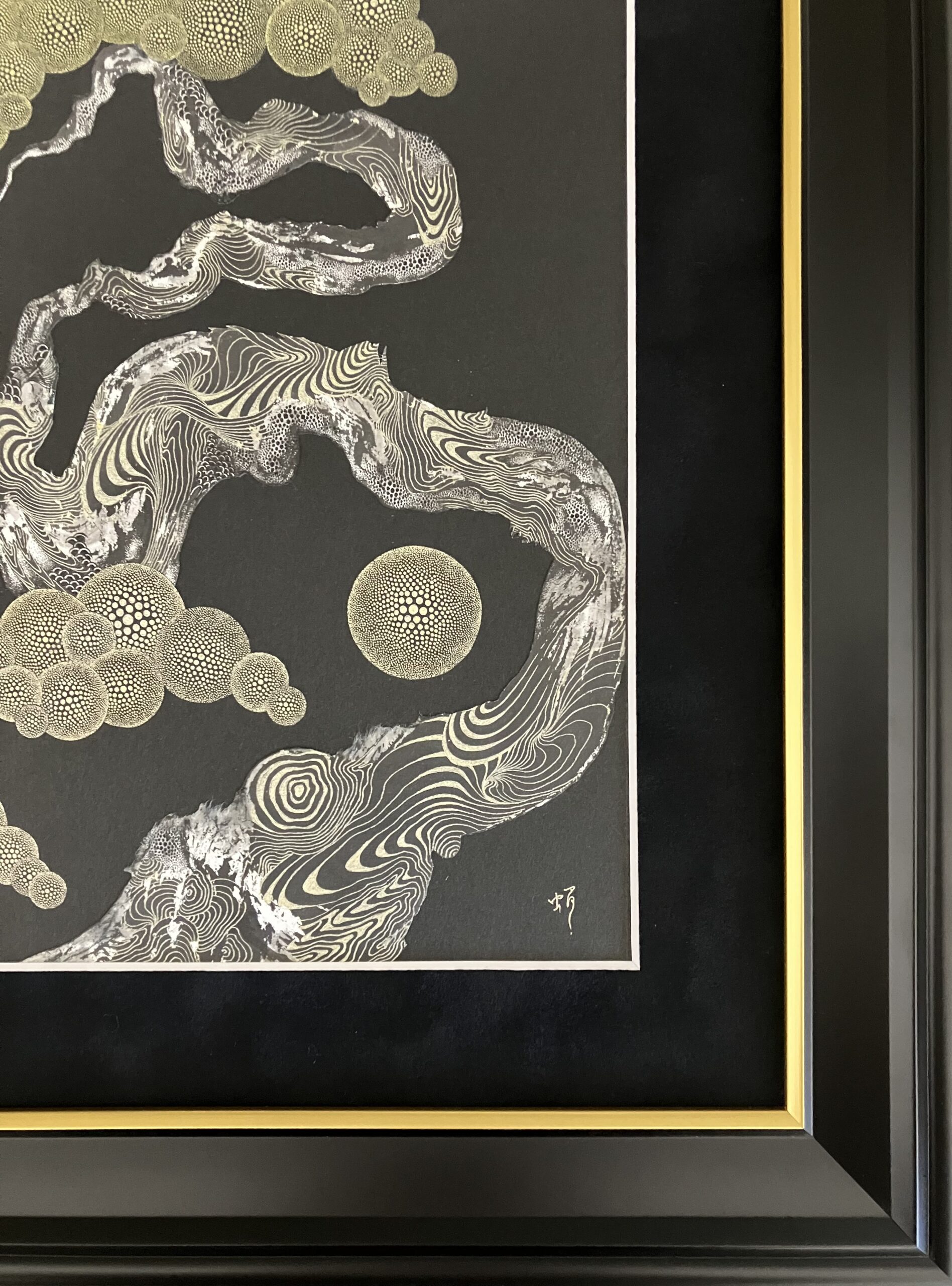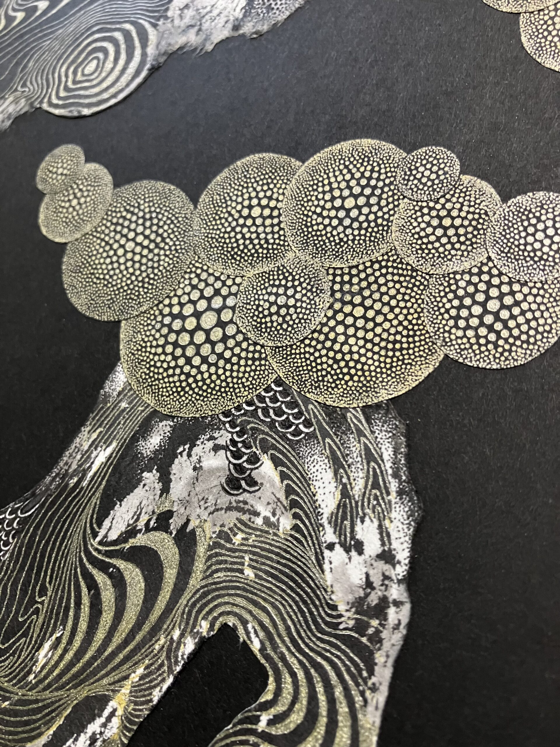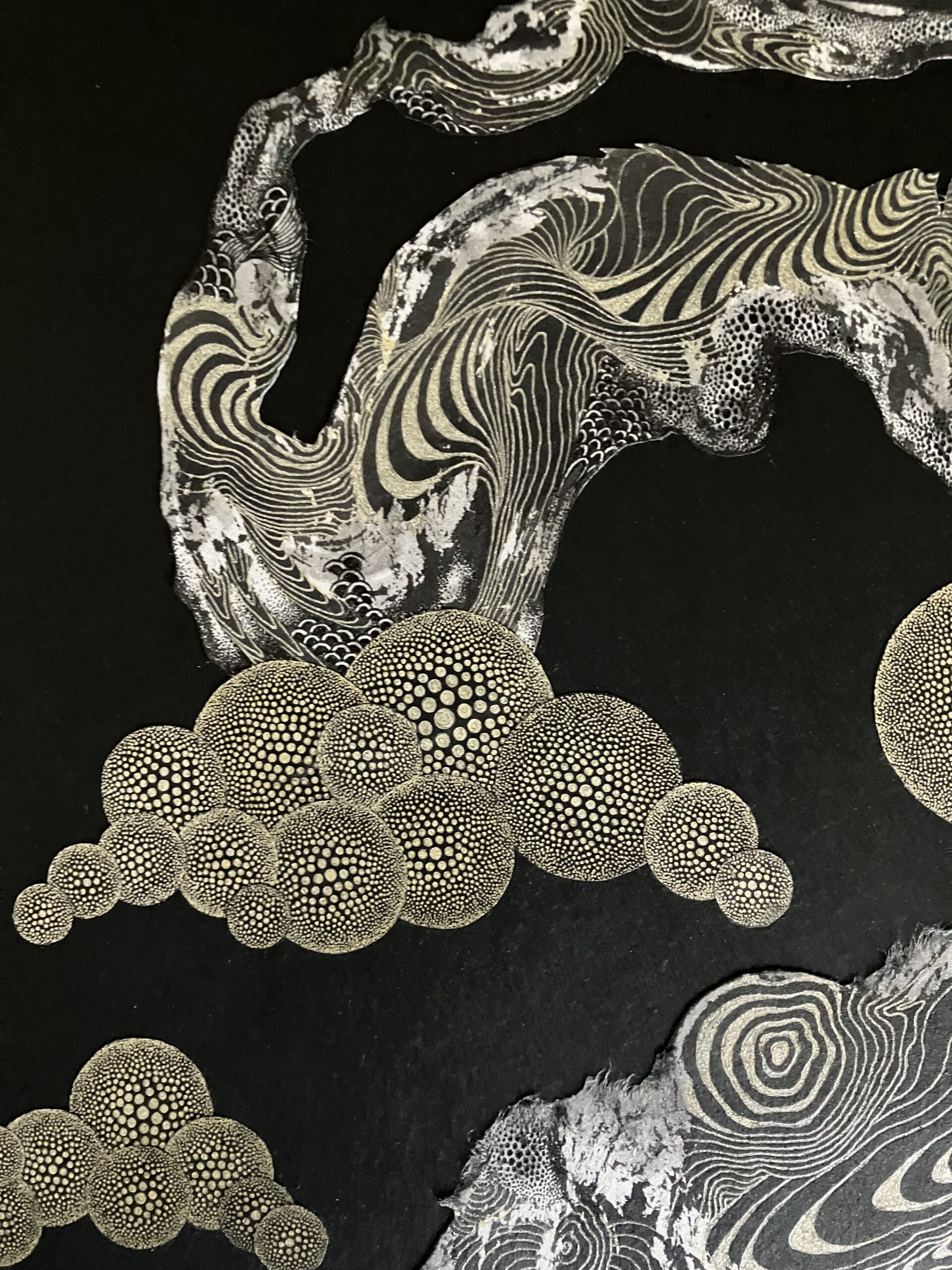 阿波紙に墨を滲ませ2種のボールペンで幹を表現。葉はドットの集合体の円を一枚一枚丁寧に描き、重ね貼り合わせたコラージュ。(貼り合わせた箇所は段差があります)