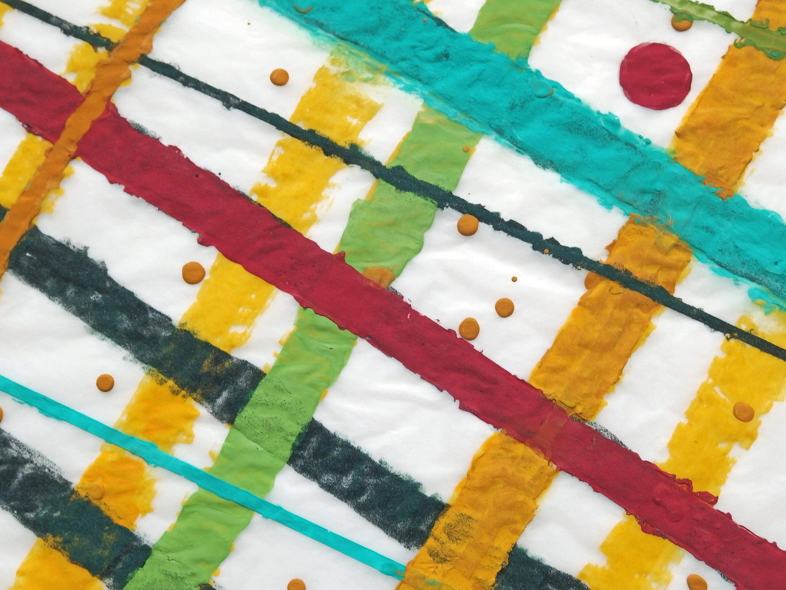 天然素材の和紙に膠を使うのが「日本画」の常識ですが、あえて人工素材を使っています。