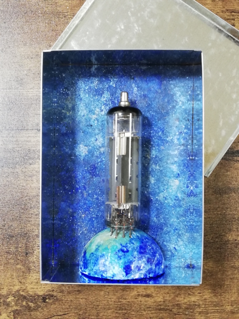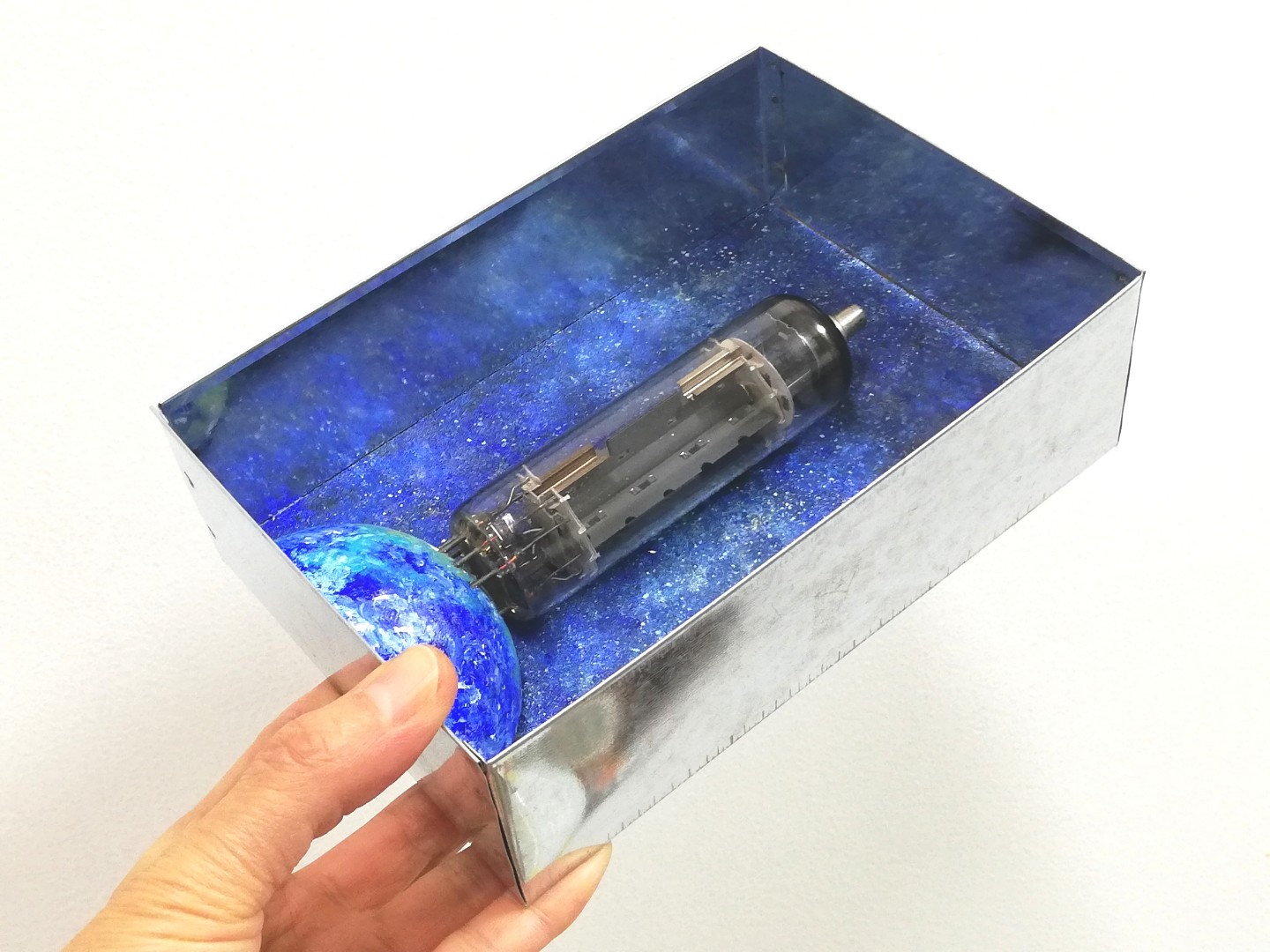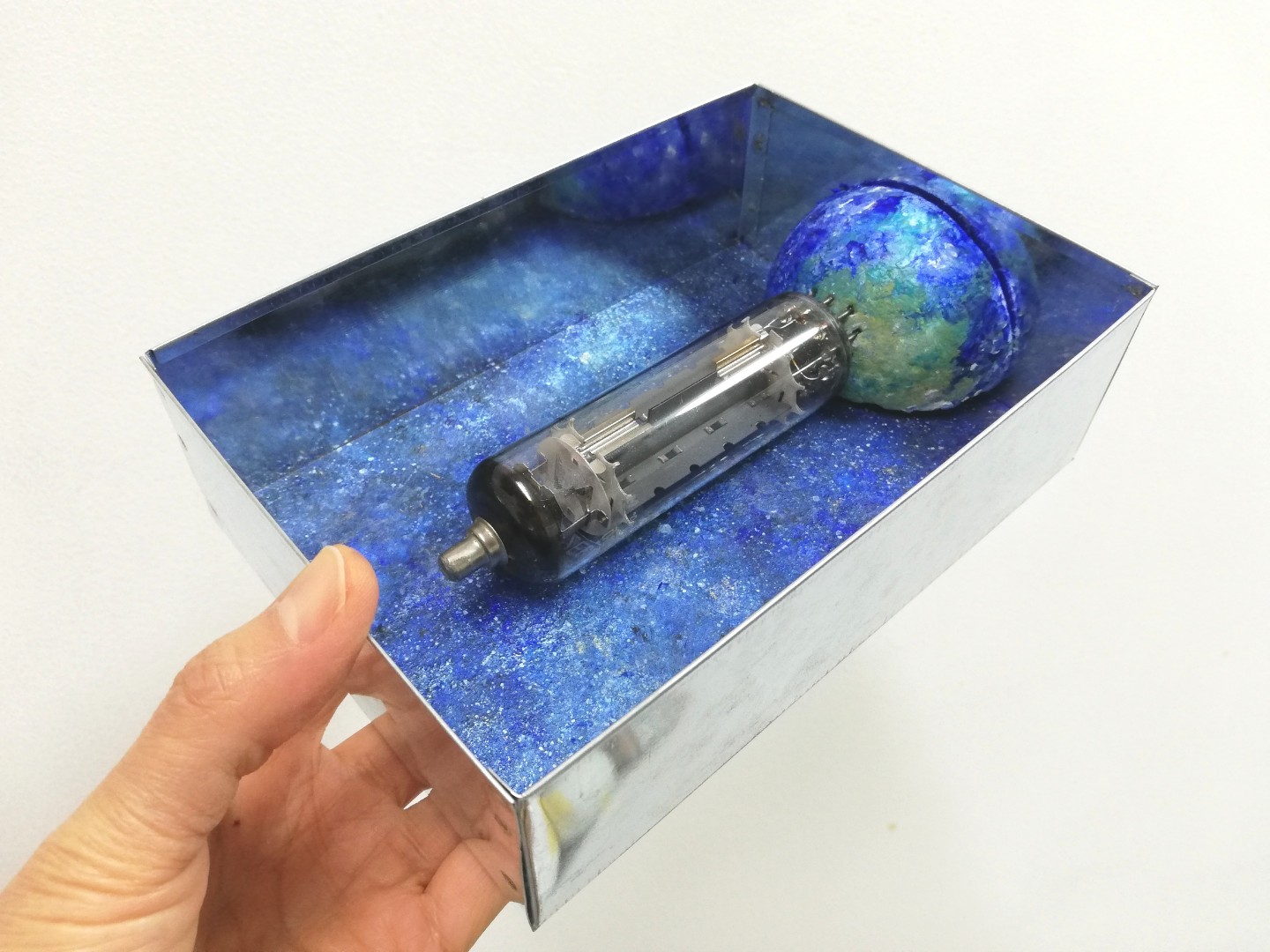 素材:アクリル絵の具、MDFボード、真空管、ブリキの箱、スチレンボール、多用途ボンド