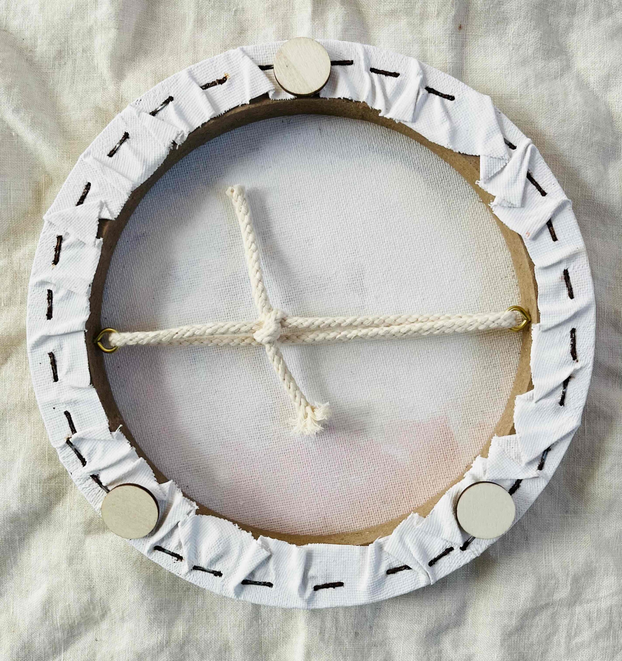 ※コットン布を裏面で張り留めているホッチキスがサビている為、円形の木の板が取り付けてあります。