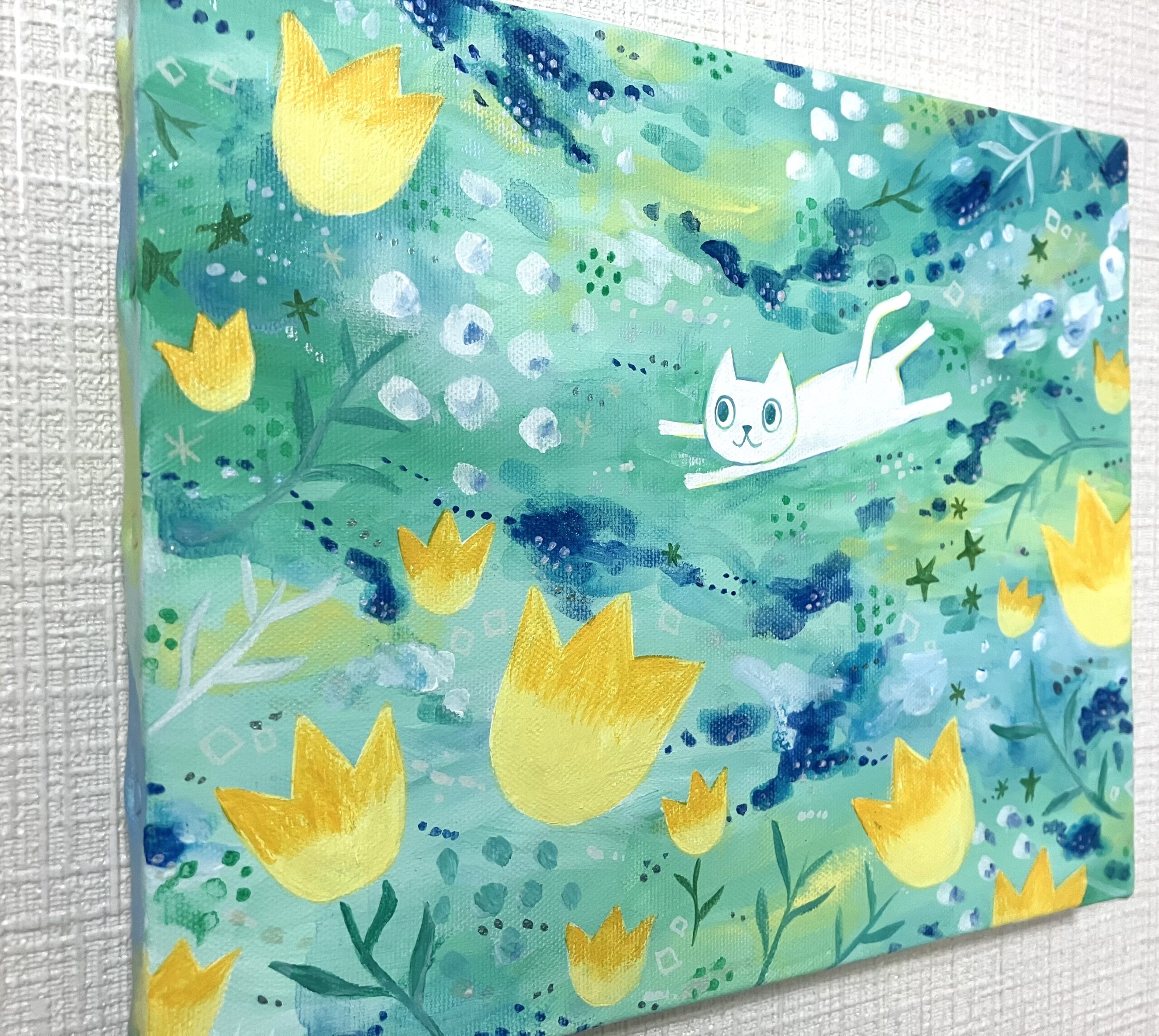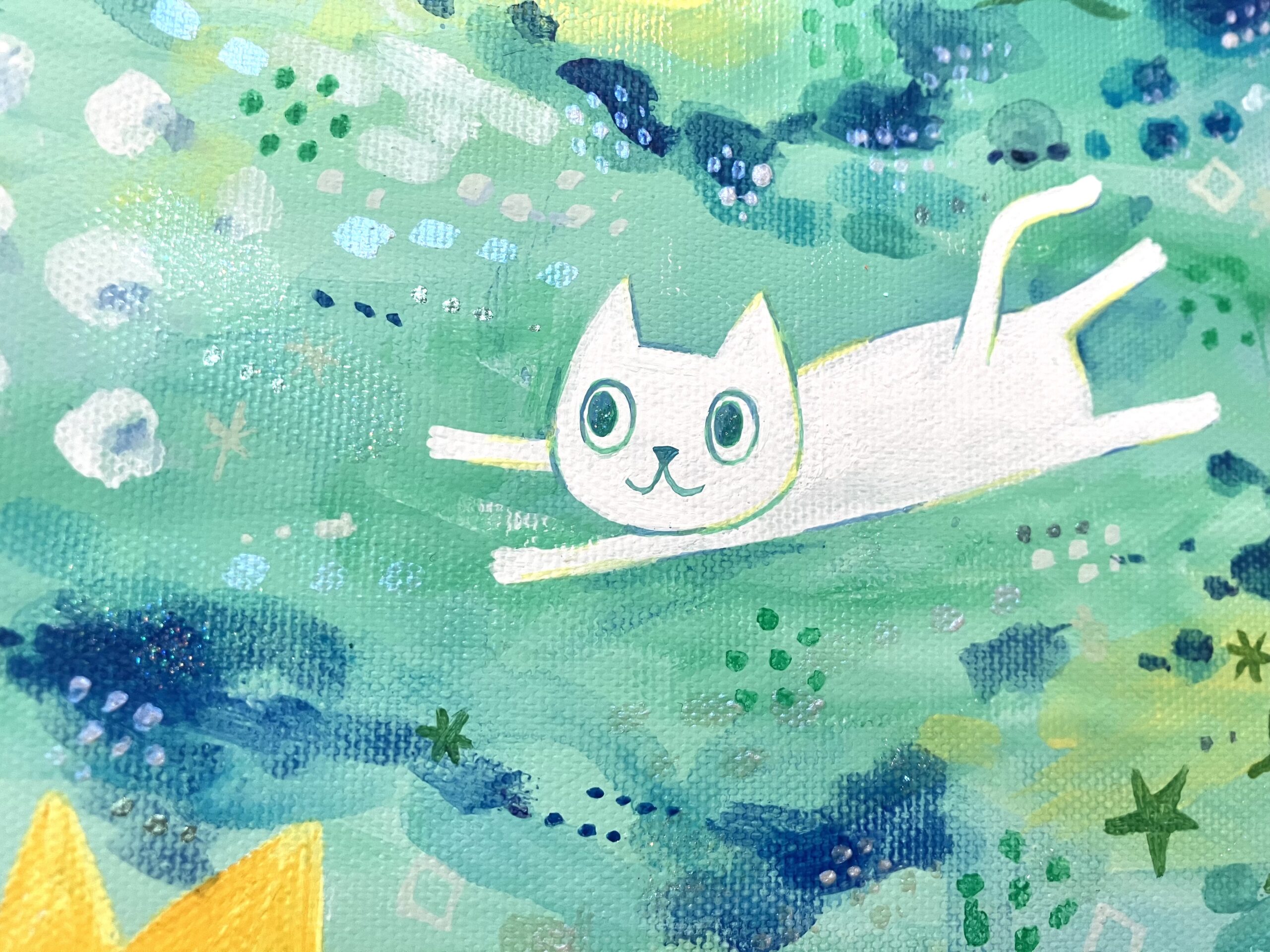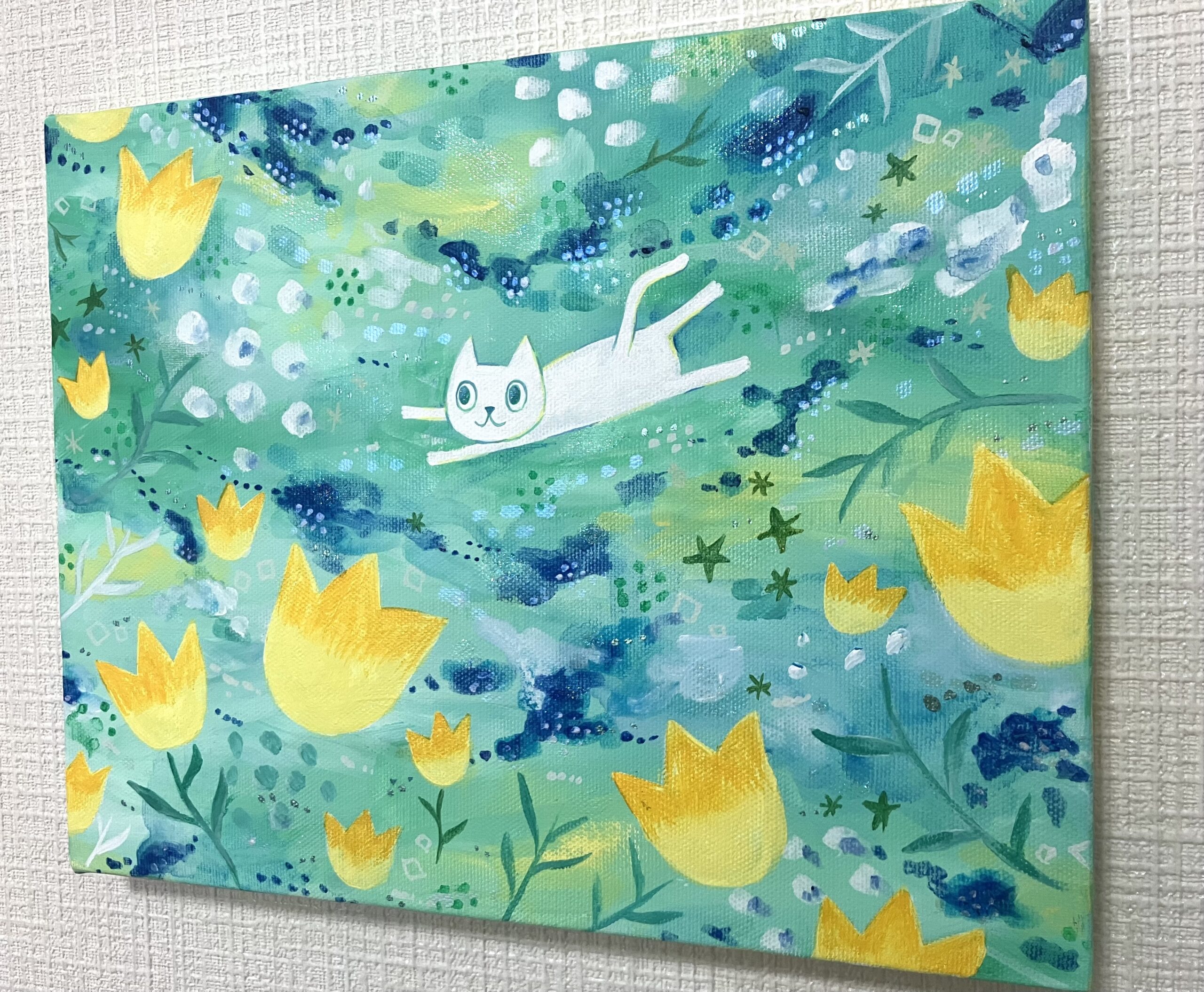 こちらは『漂う』シリーズです。抽象表現の中に猫とお花を漂わせています。