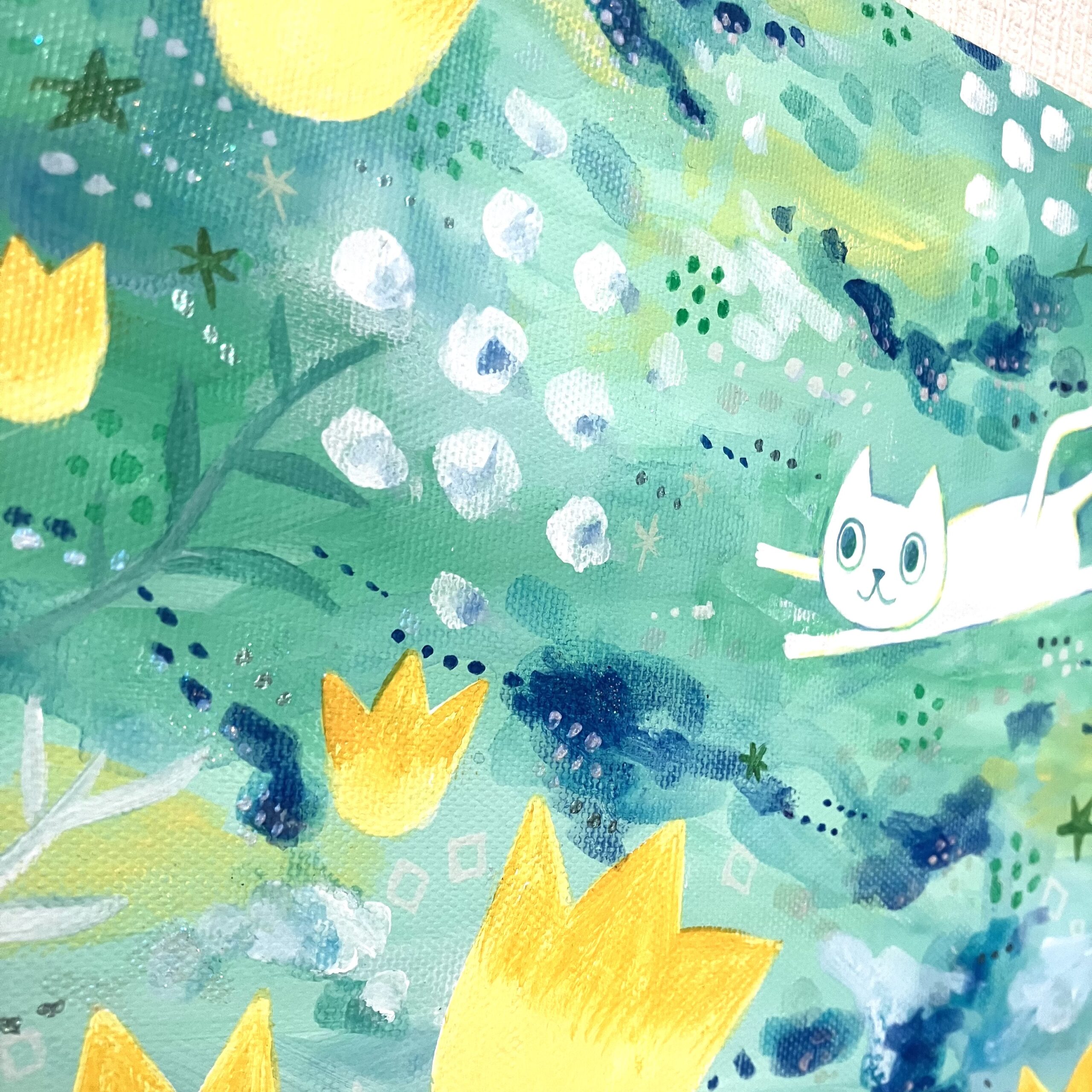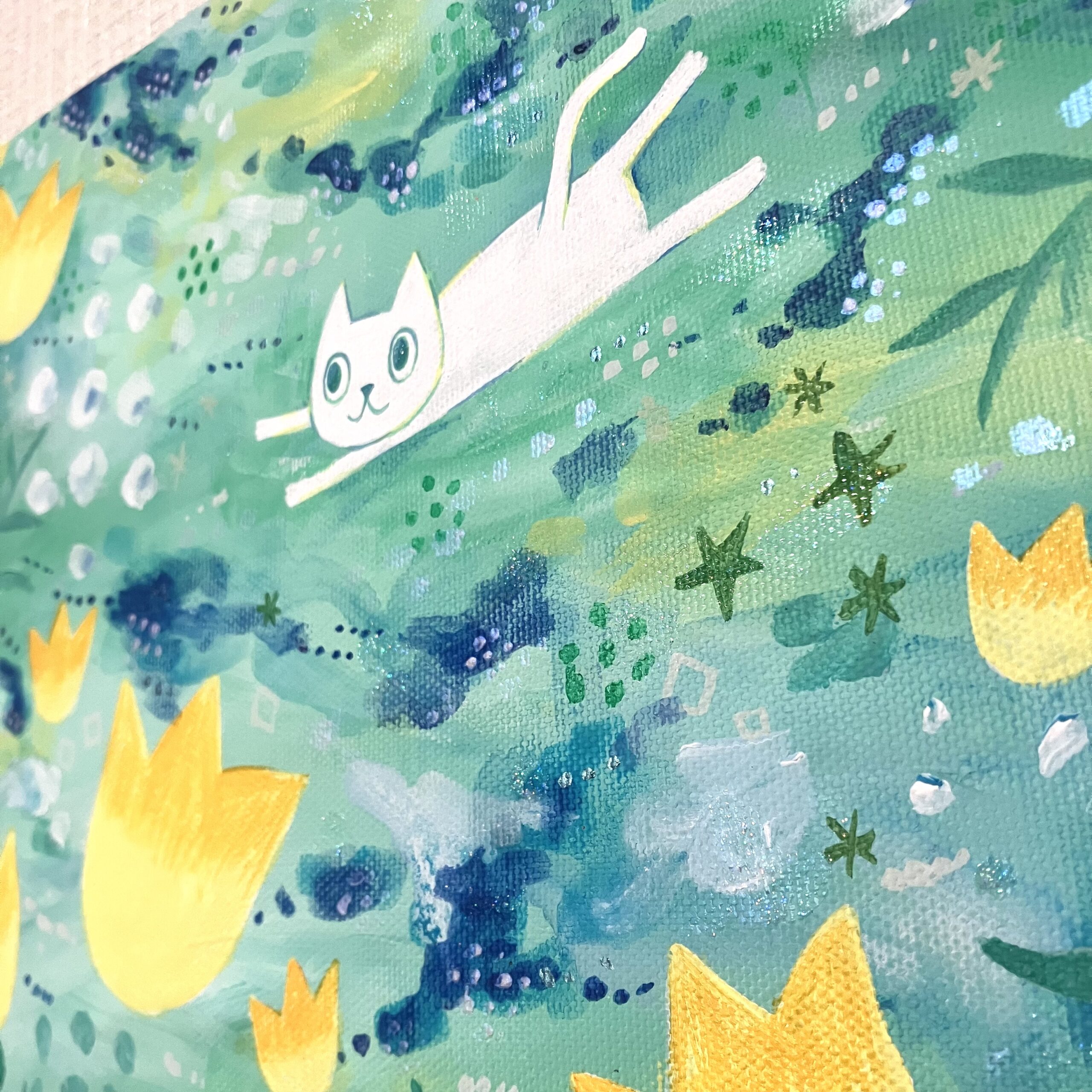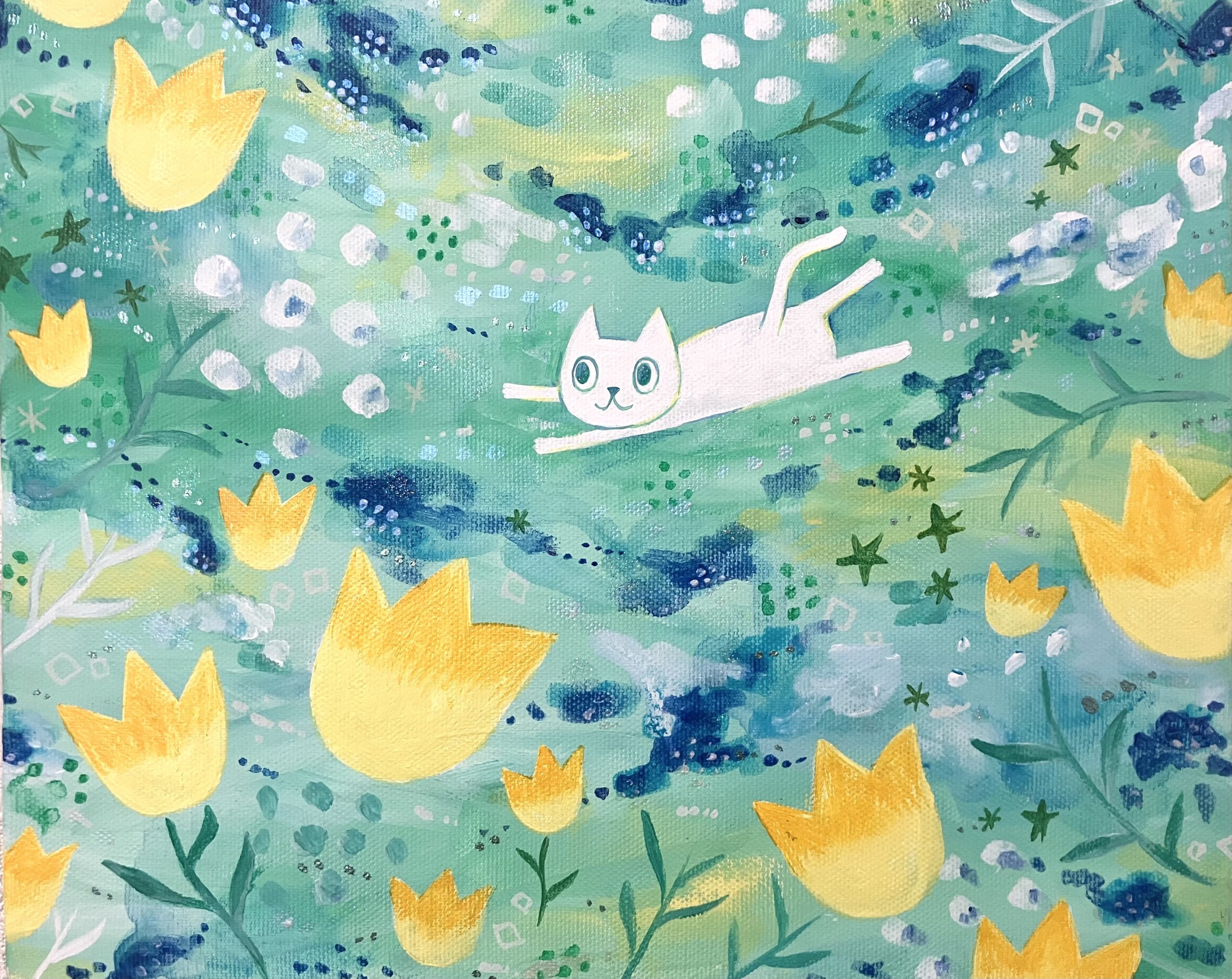 こちらは『漂う』シリーズです。抽象表現の中に猫とお花を漂わせています。