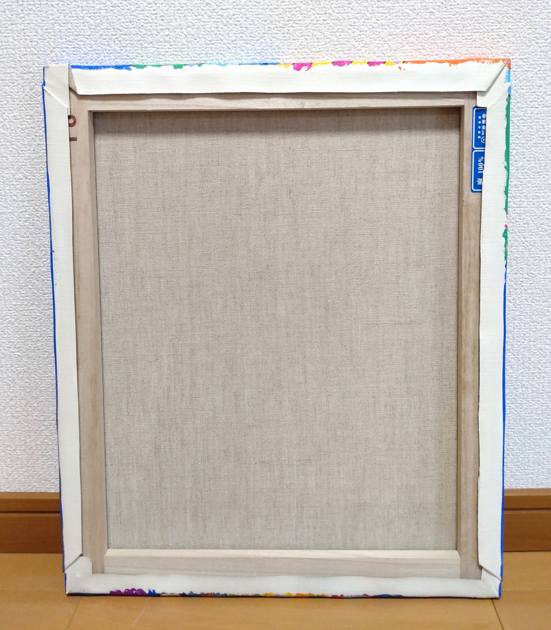 キャンバスのうしろに紐がついておりません。ピンにひっかけていただくと簡単&すぐに展示していただけます。(ふちの部分も色を塗っているので、そのまま飾ることができます。)