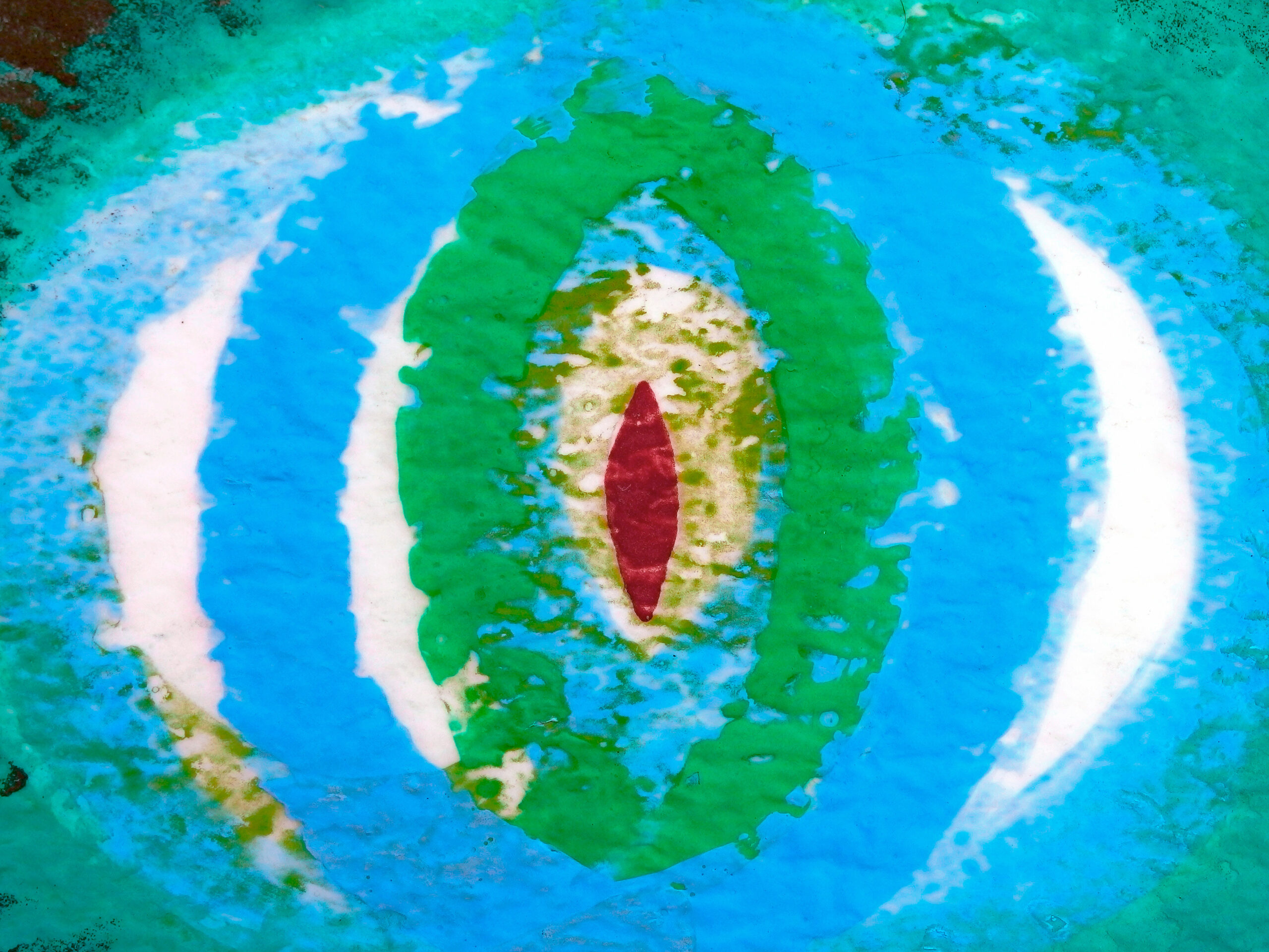 天然素材の和紙に膠を使うのが「日本画」の常識ですが、あえて人工素材を使っています。