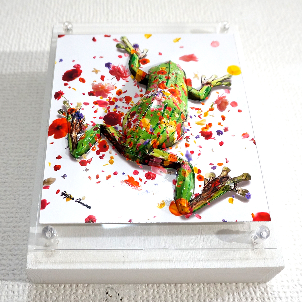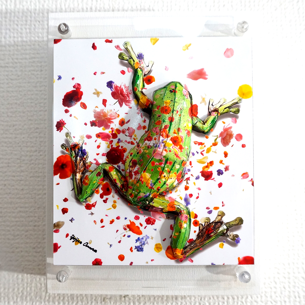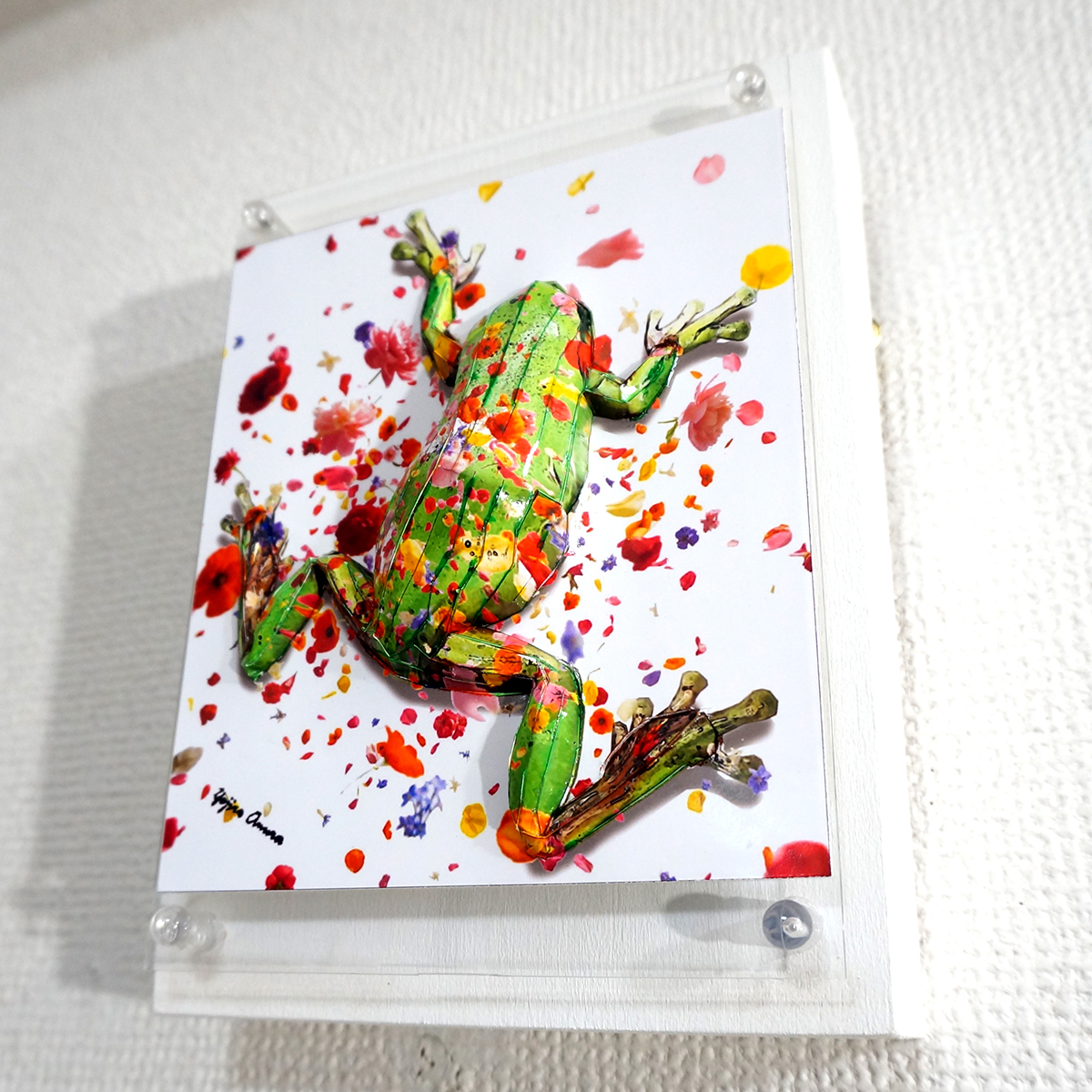 アマガエルのコラージュ画像を作成しペーパークラフト技術を用いて立体的に表現した作品です。