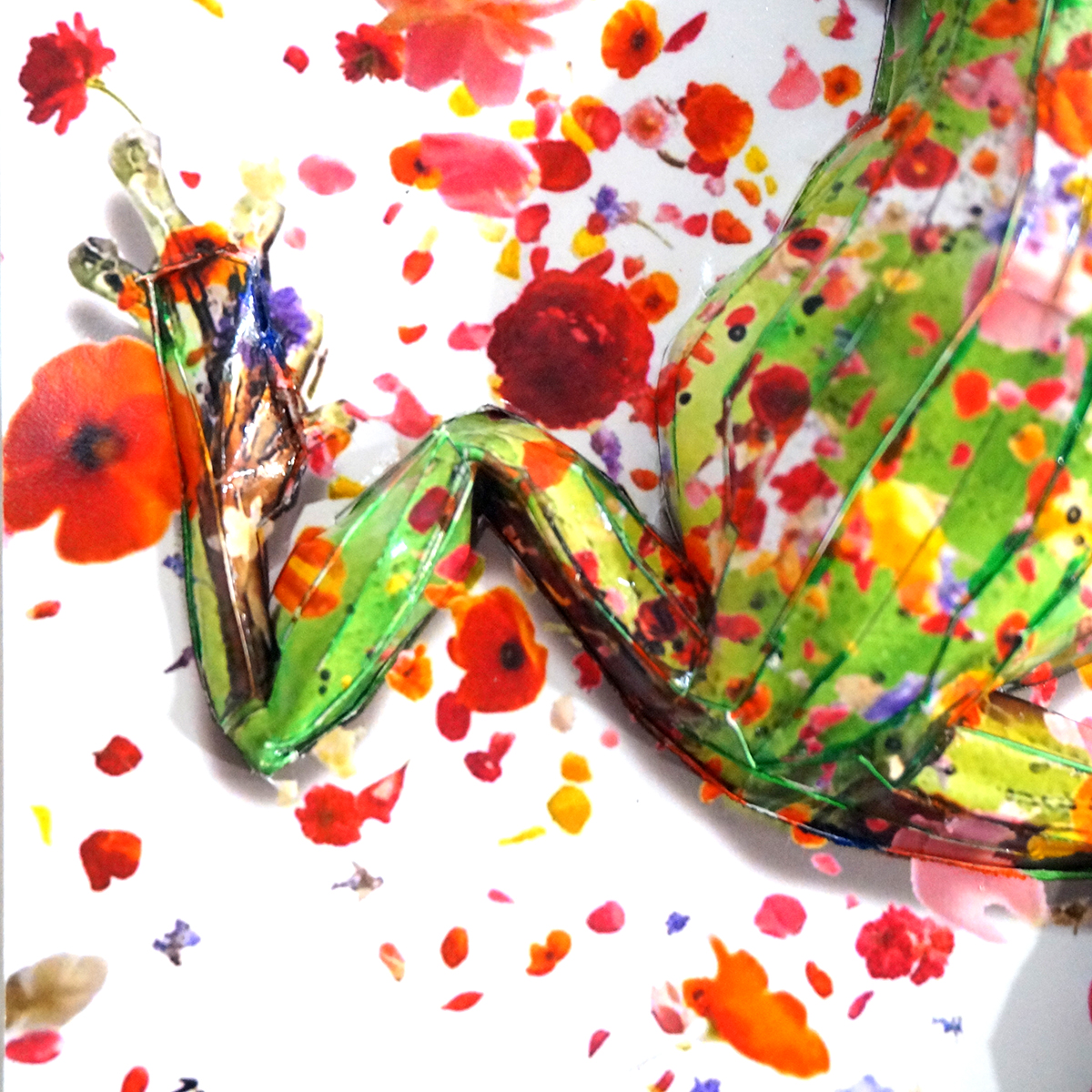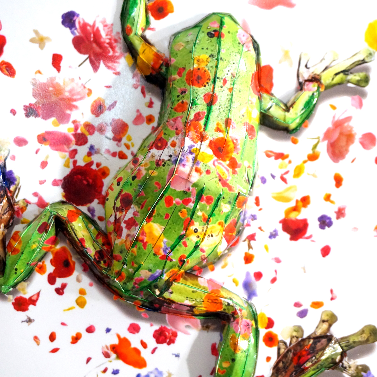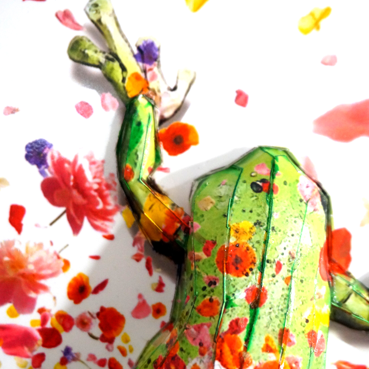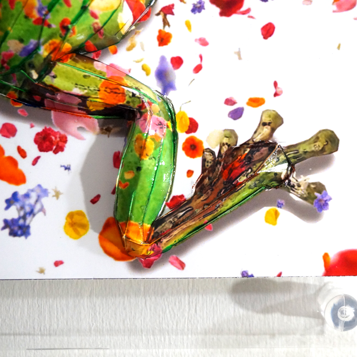 アマガエルのコラージュ画像を作成しペーパークラフト技術を用いて立体的に表現した作品です。
