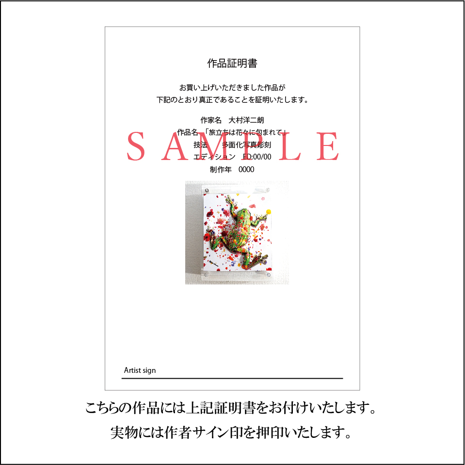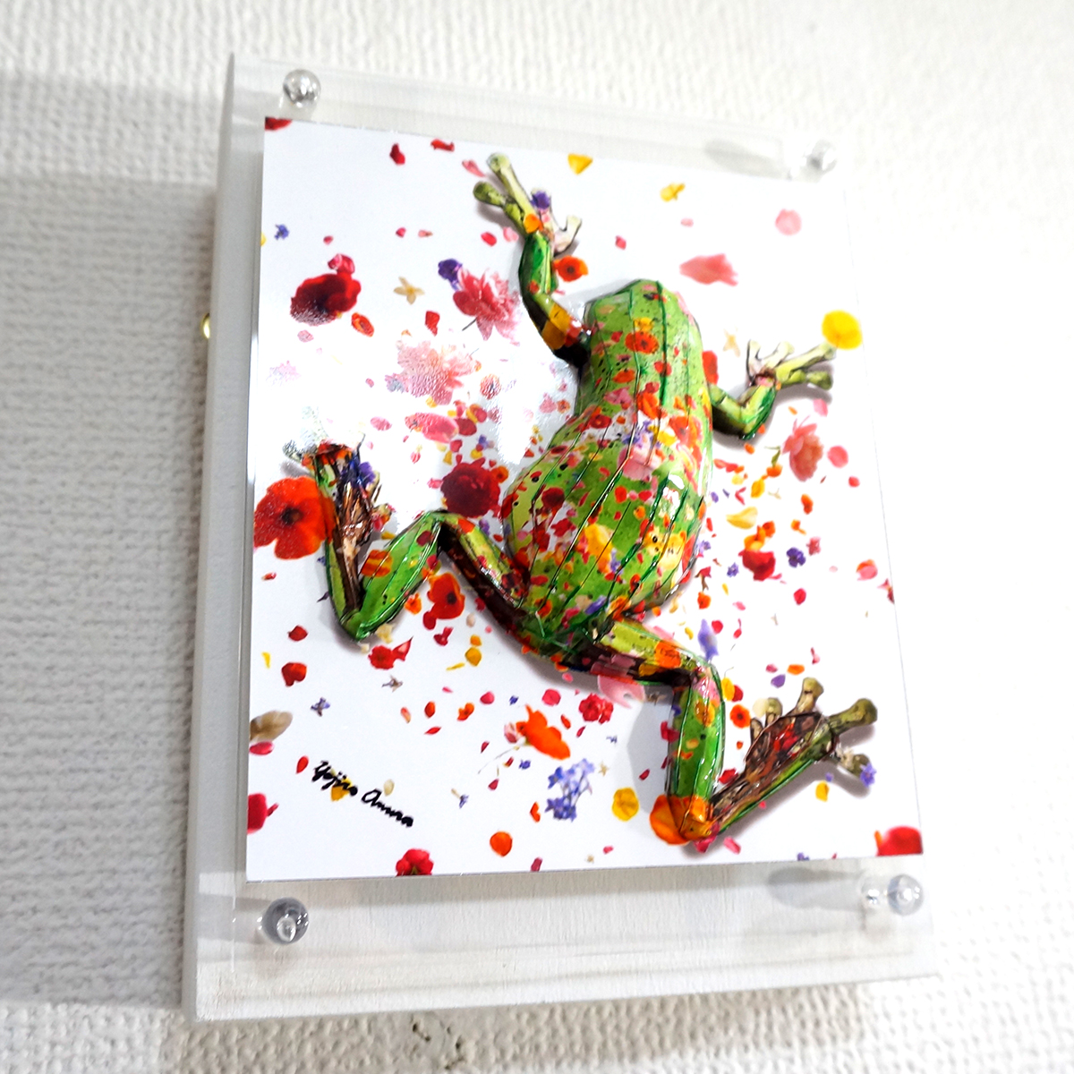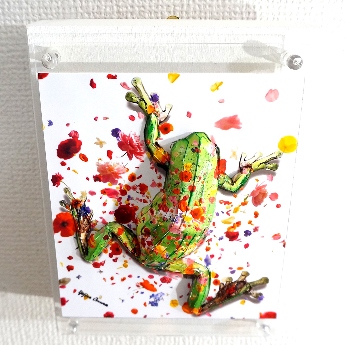 今まさに旅立とうと上を目指すカエルを祝福の花々が覆っている様子を表現したデザインです。表面上は光沢紙の艶のある質感となっております。