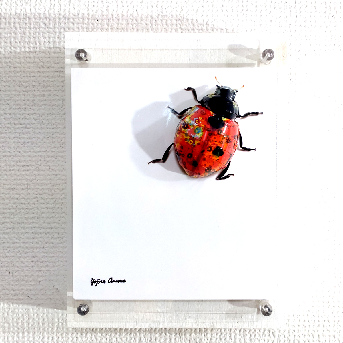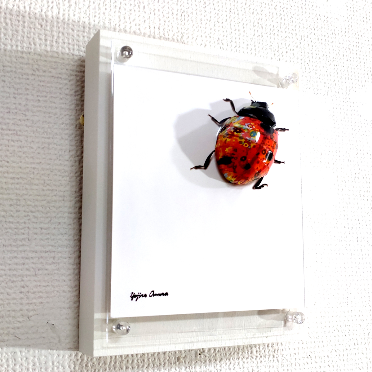 作品タイトル通り部屋に迷い込んできたテントウムシをよく見てみると、花柄模様だったという物語をイメージして制作いたしました。