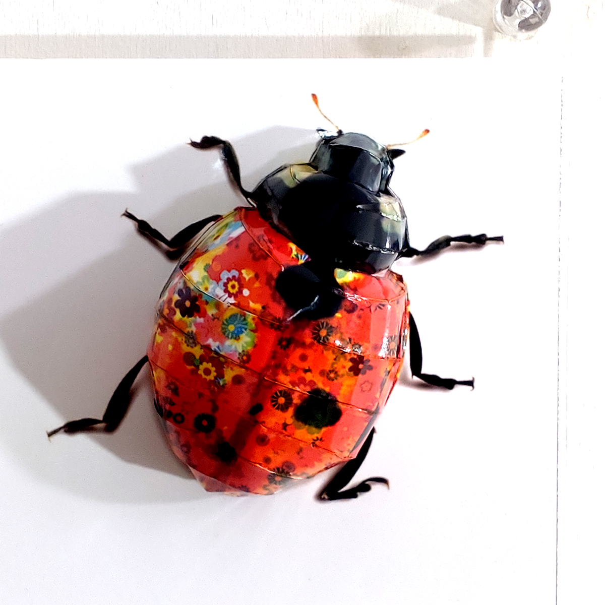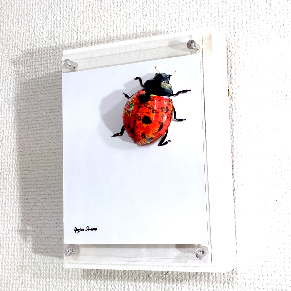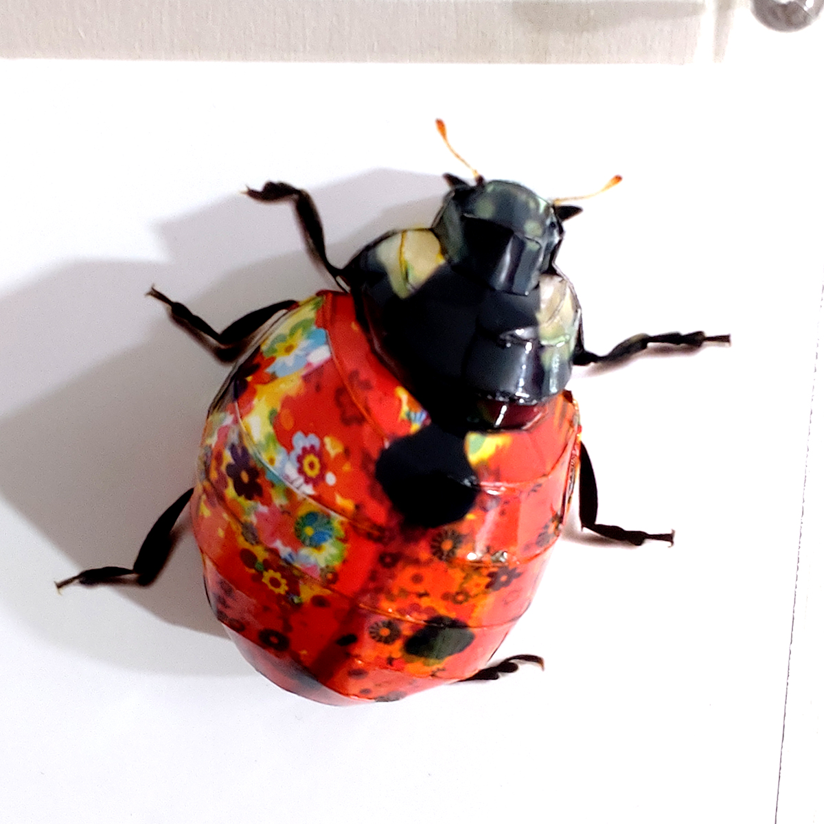 テントウムシのコラージュ画像を作成しペーパークラフト技術を用いて立体的に表現した作品です。