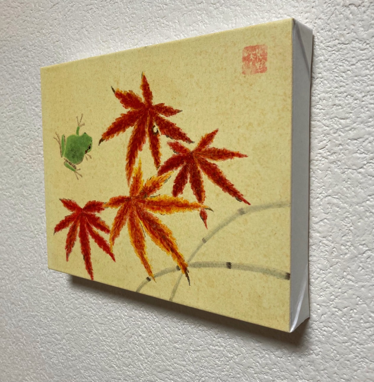 片目で紅葉をチラッと覗くカエル、葉のパリパリした触感、美しさを感じて頂ければ幸いです。