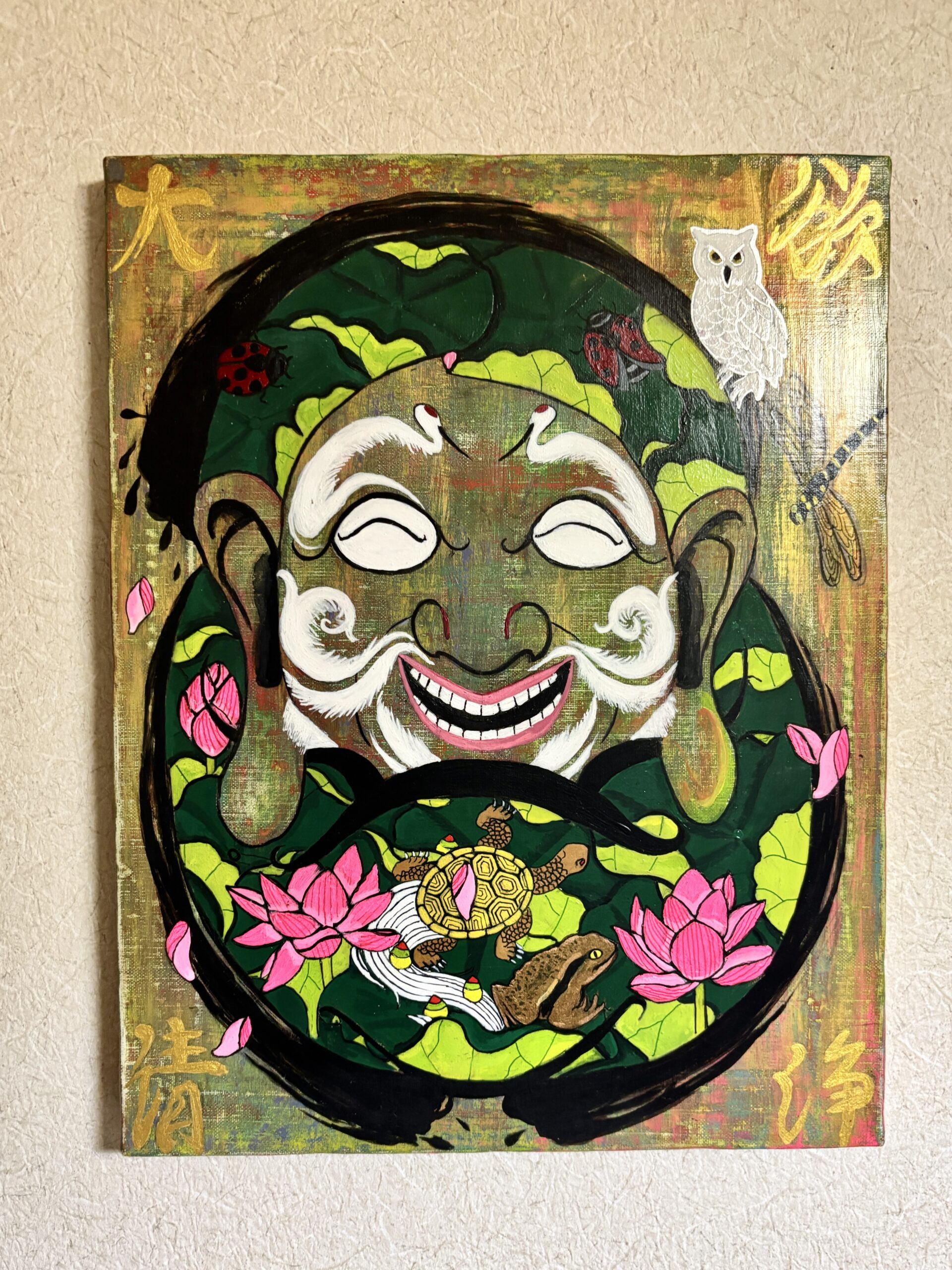笑い達磨に衣服は清らかの象徴である蓮の葉と花で包み、吉祥な生き物、亀、ガマガエル、 梟(ふくろう)てんとう虫をあしらっています。