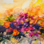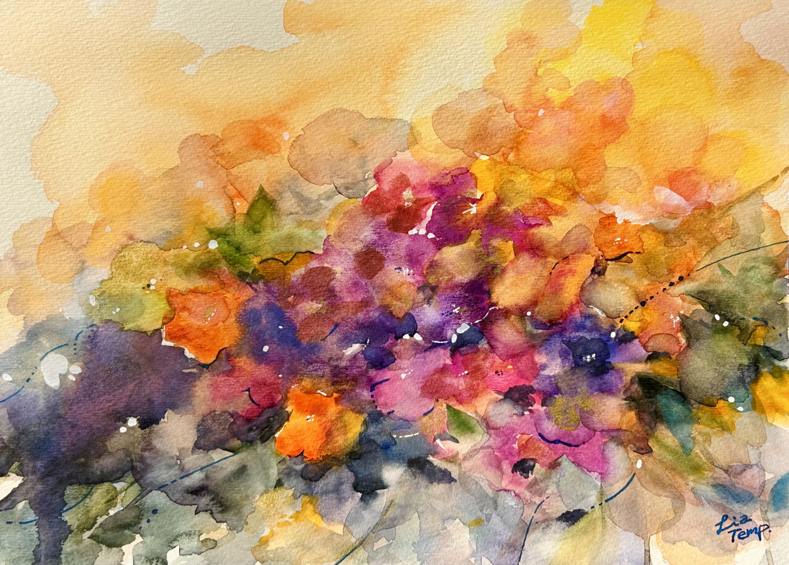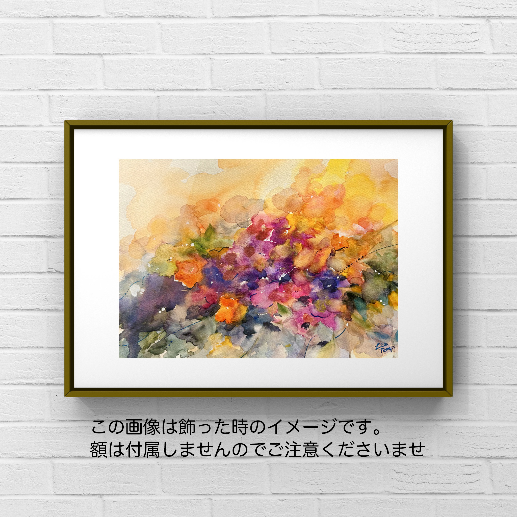 お花の抽象画を水彩で描きました。イメージはパンジーやビオラなど、紫が美しいお花を思い浮かべました。金などのラメ絵具も使用しており、角度を変えて見るとキラキラして見えます。