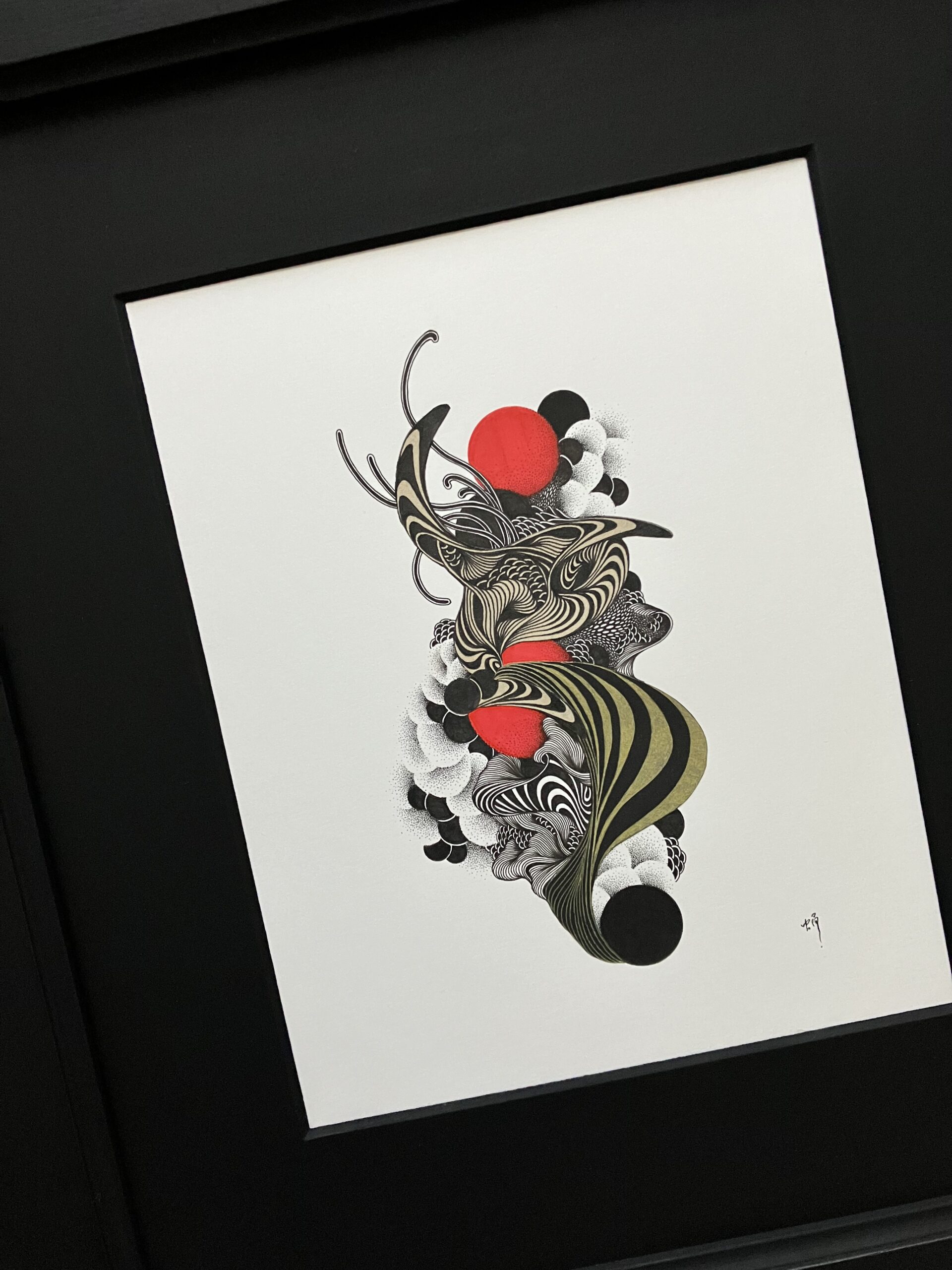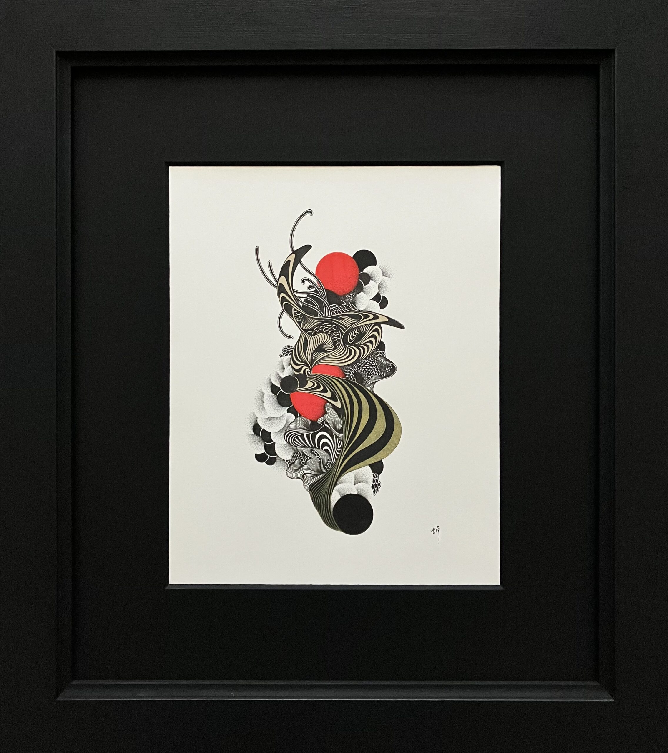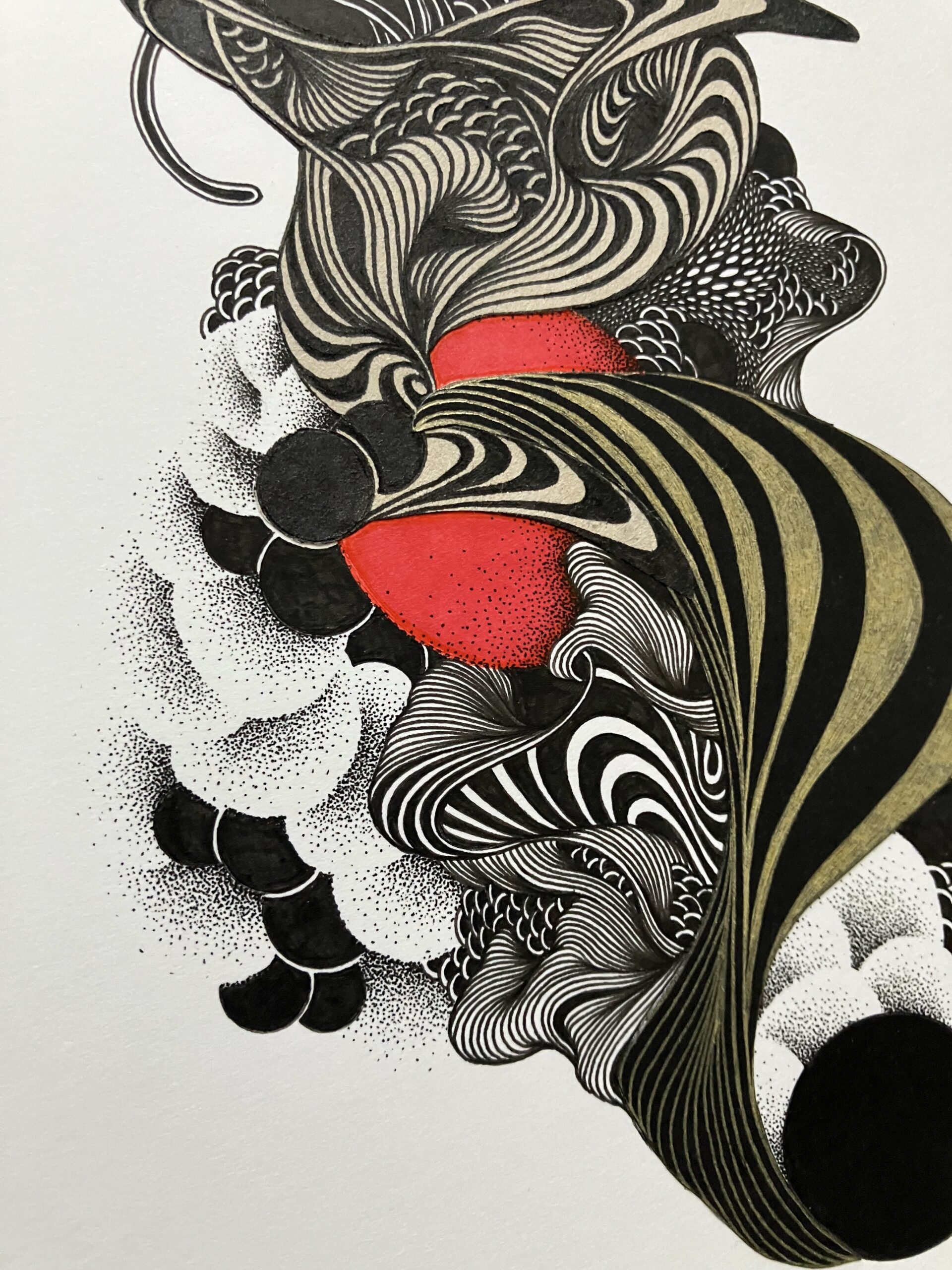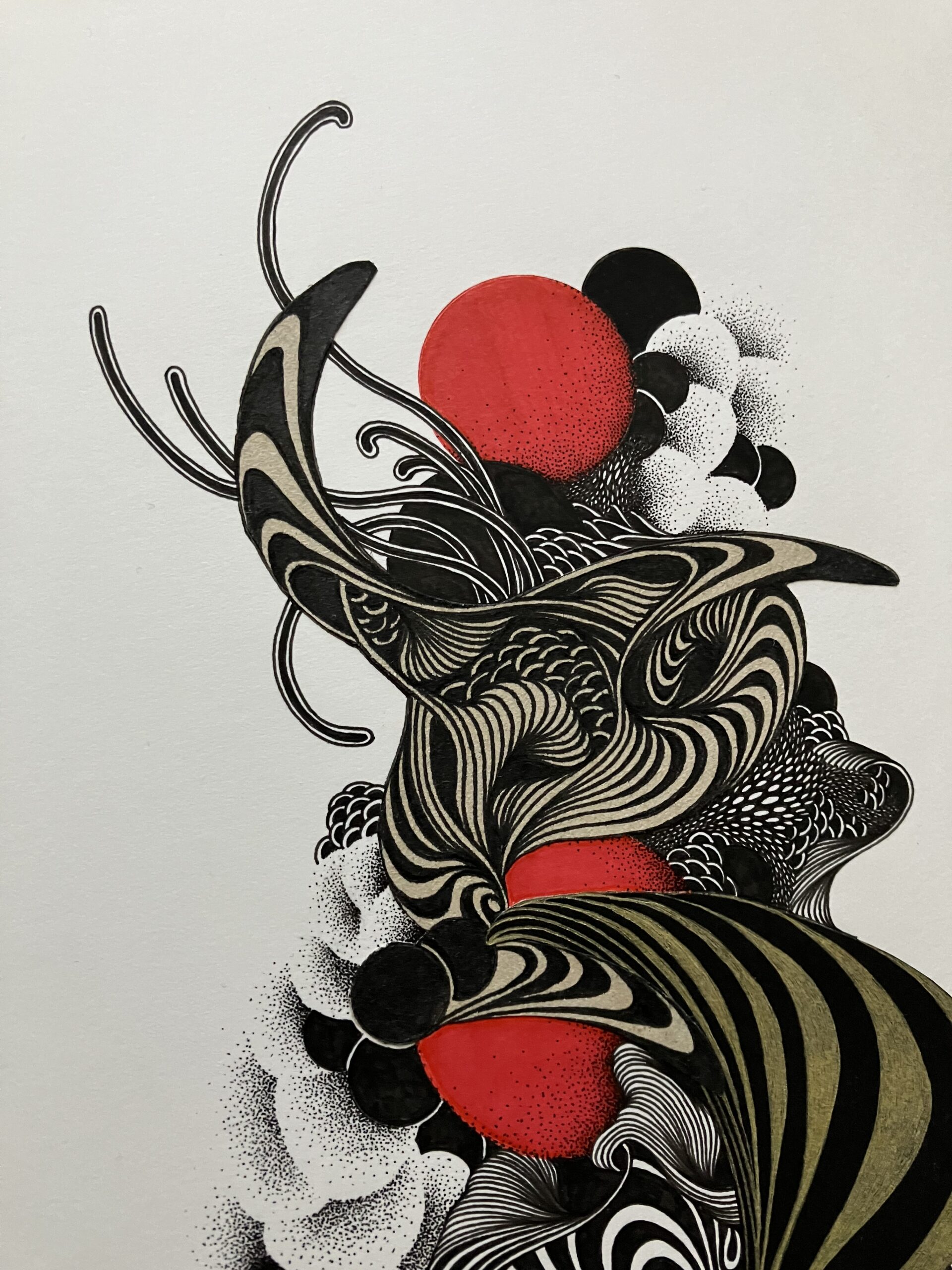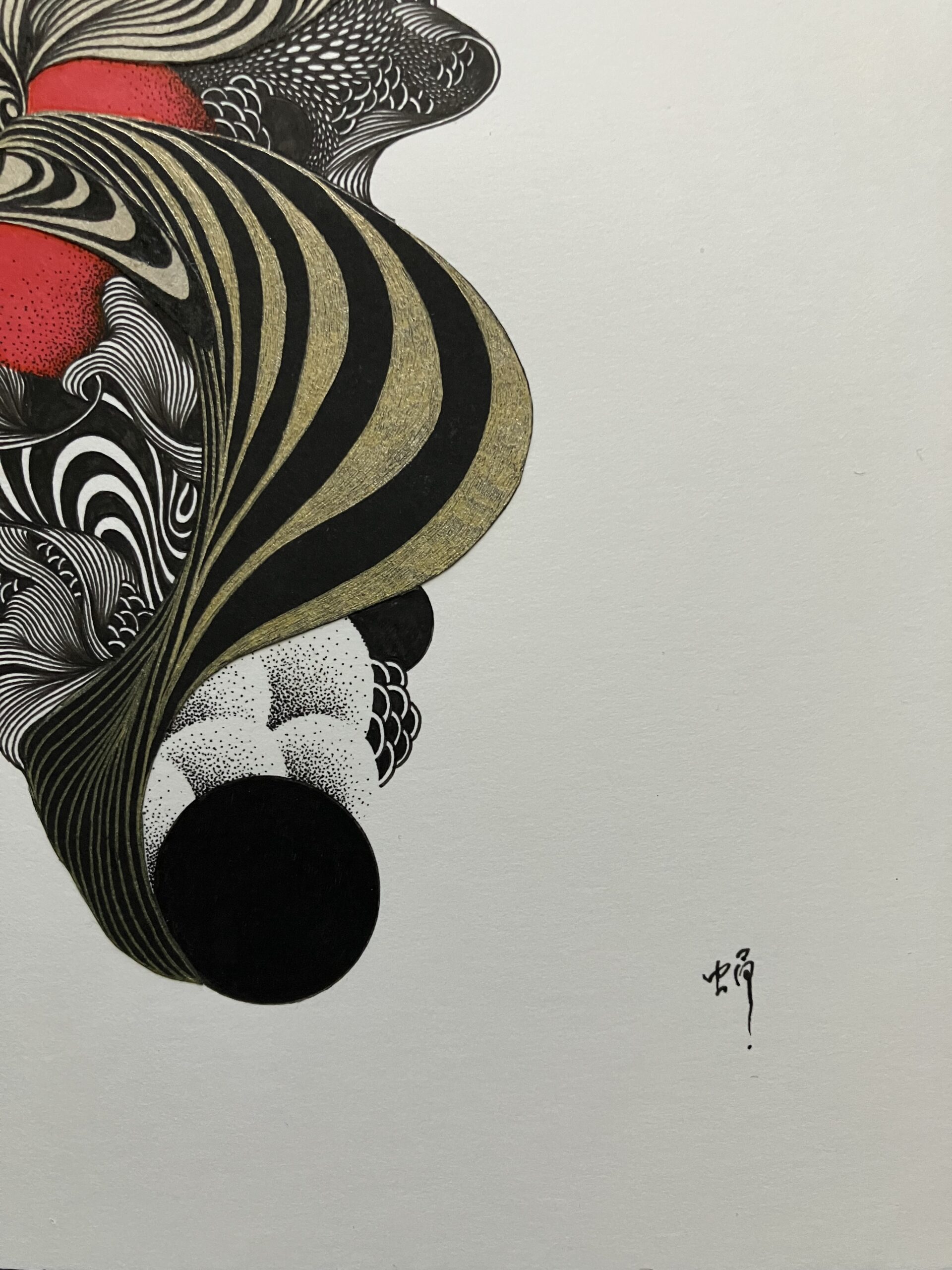 黒、赤、金色のペン、数種類の紙を使用し一部コラージュで表現。