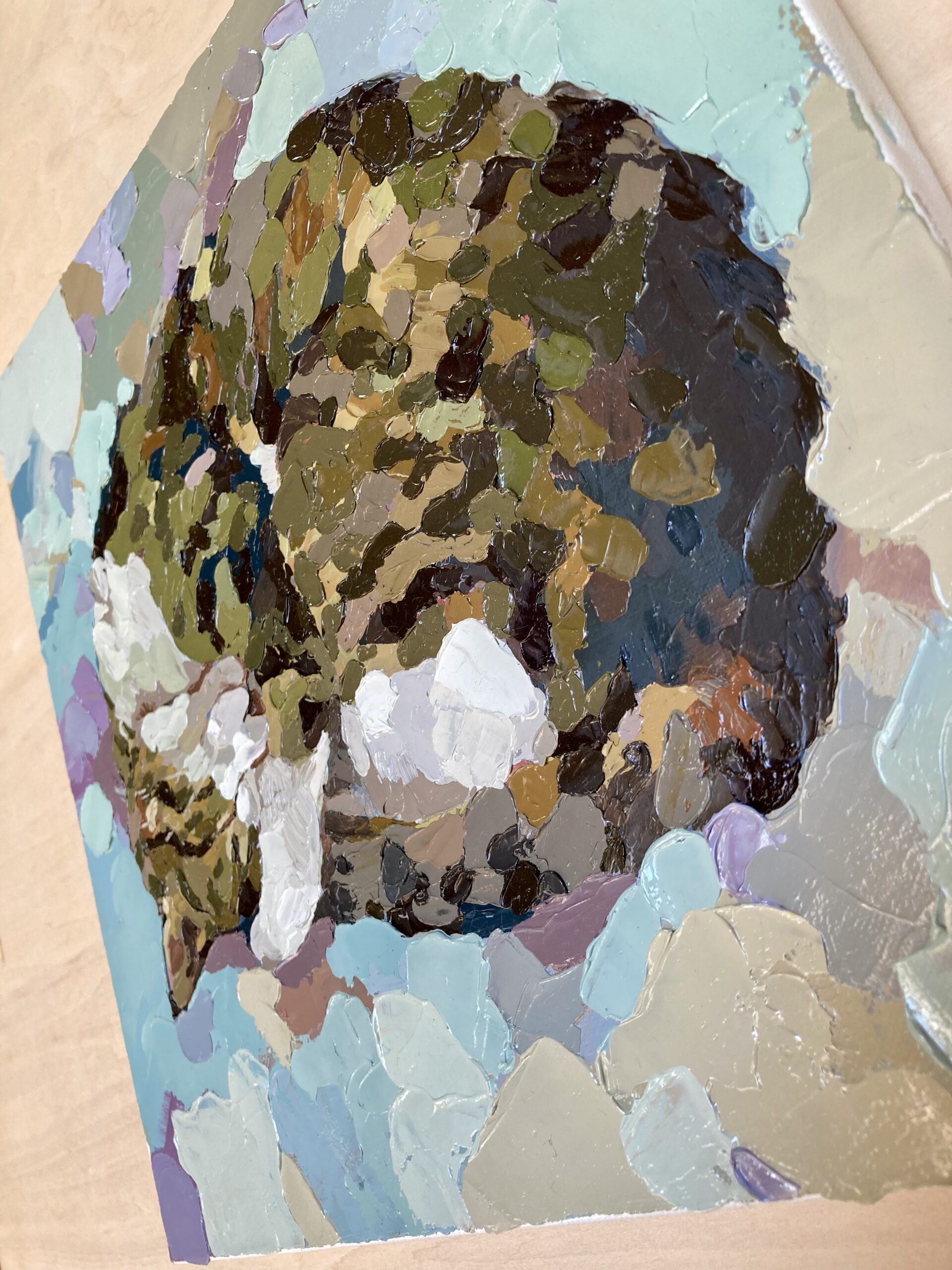 主にパレットナイフと筆を用いて描いており、表面は凹凸がある油絵です。