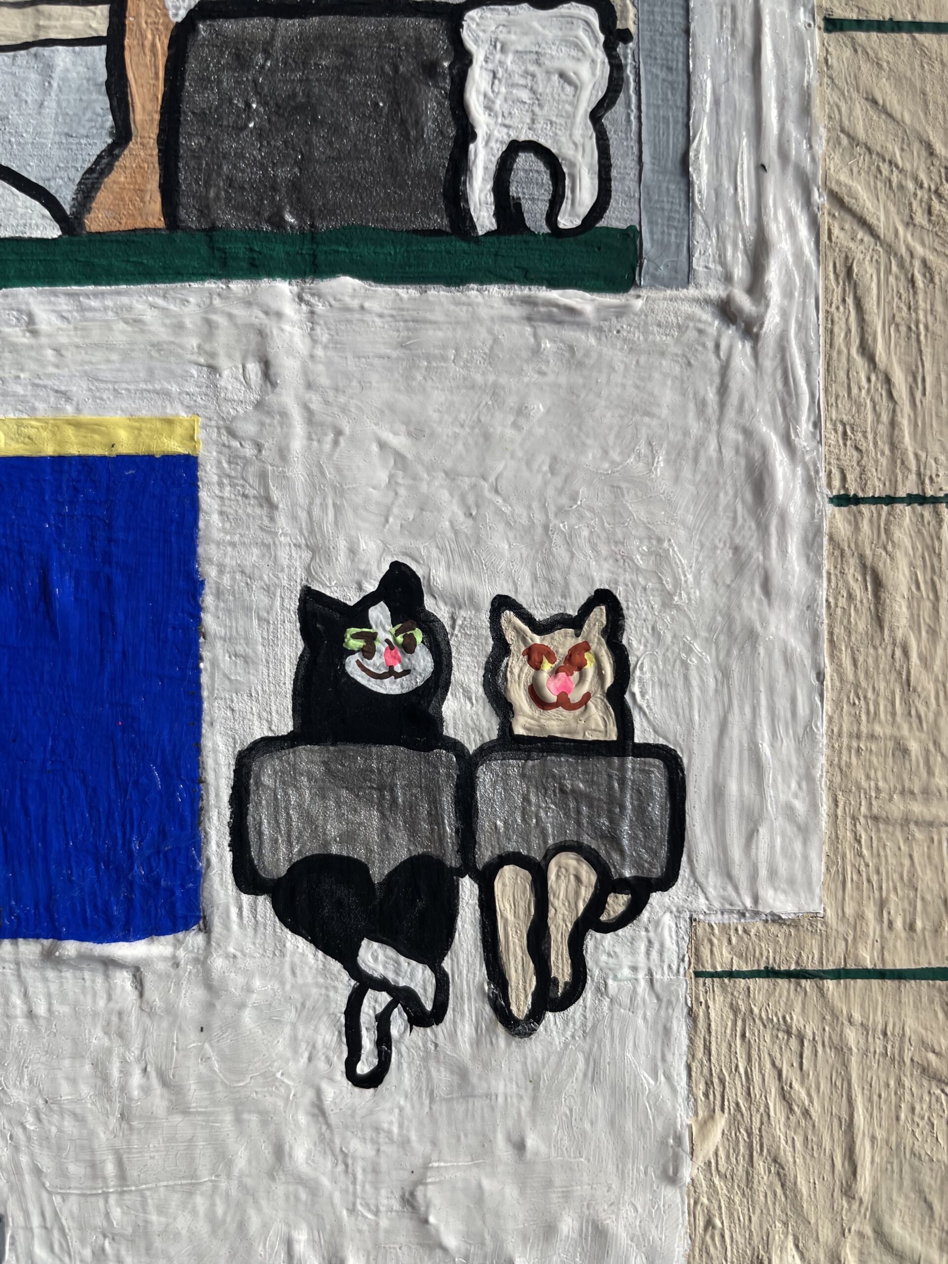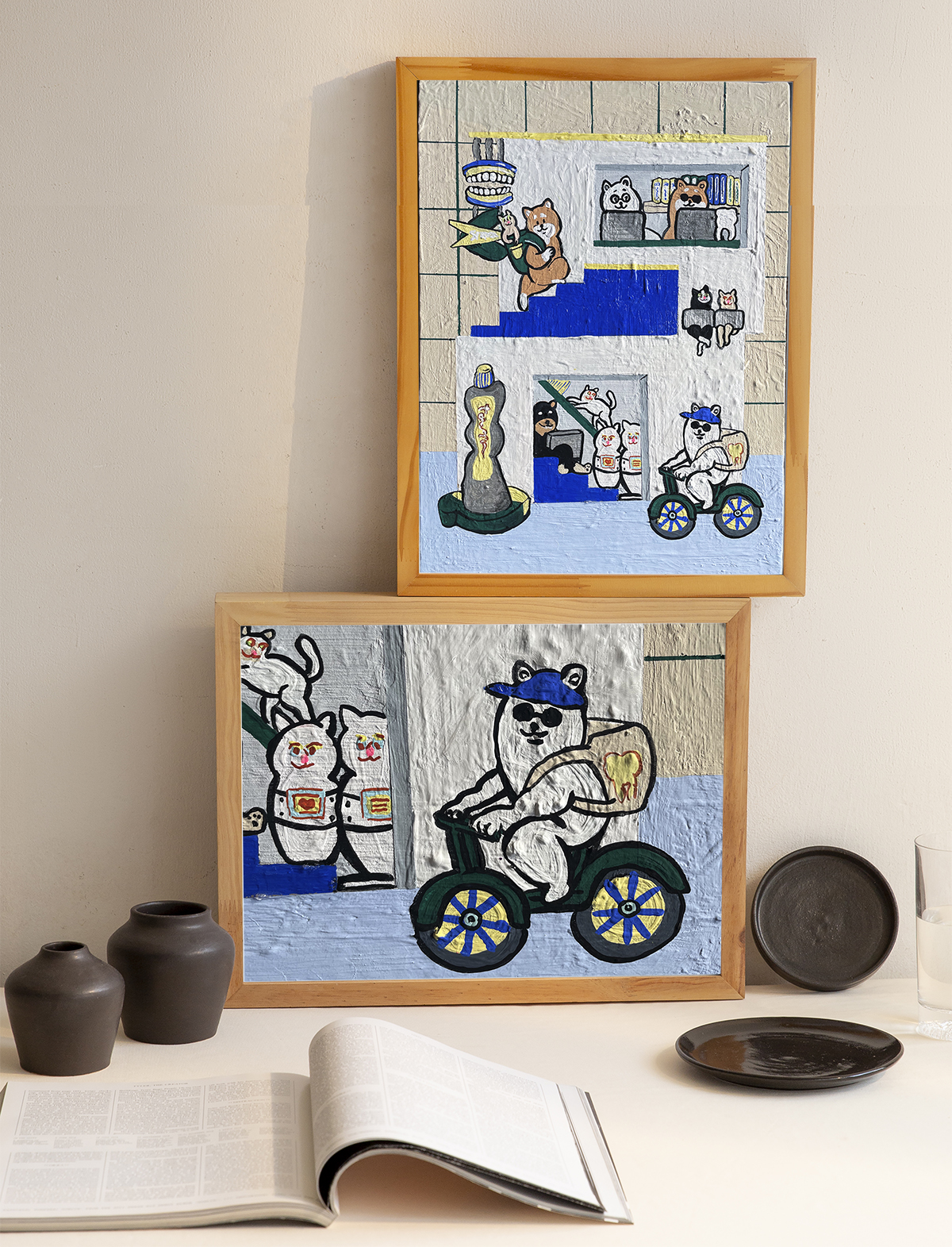 ホワイトの建物部分は艶出しのアクリルメディウムを使用しており、光沢感があります。
