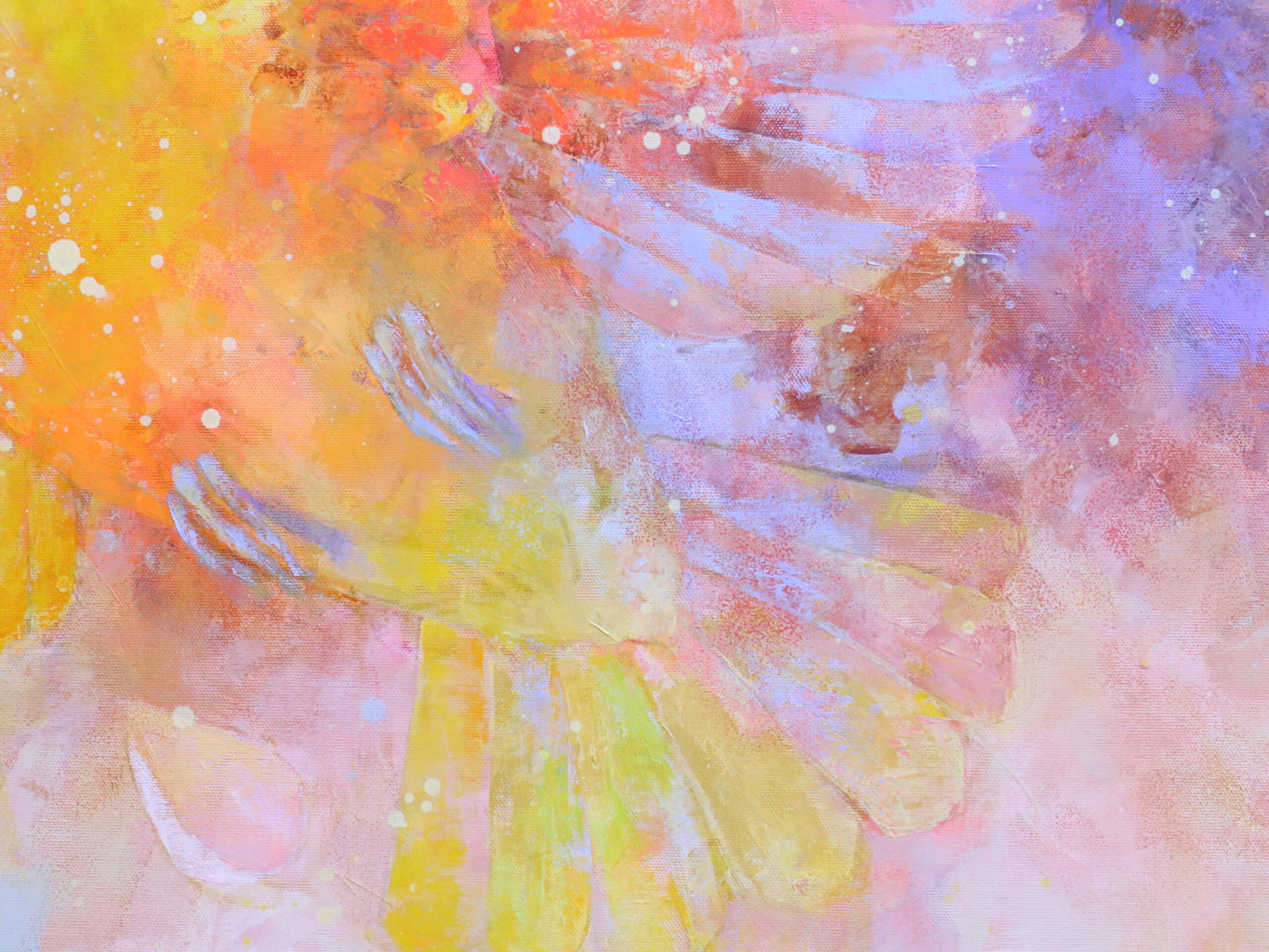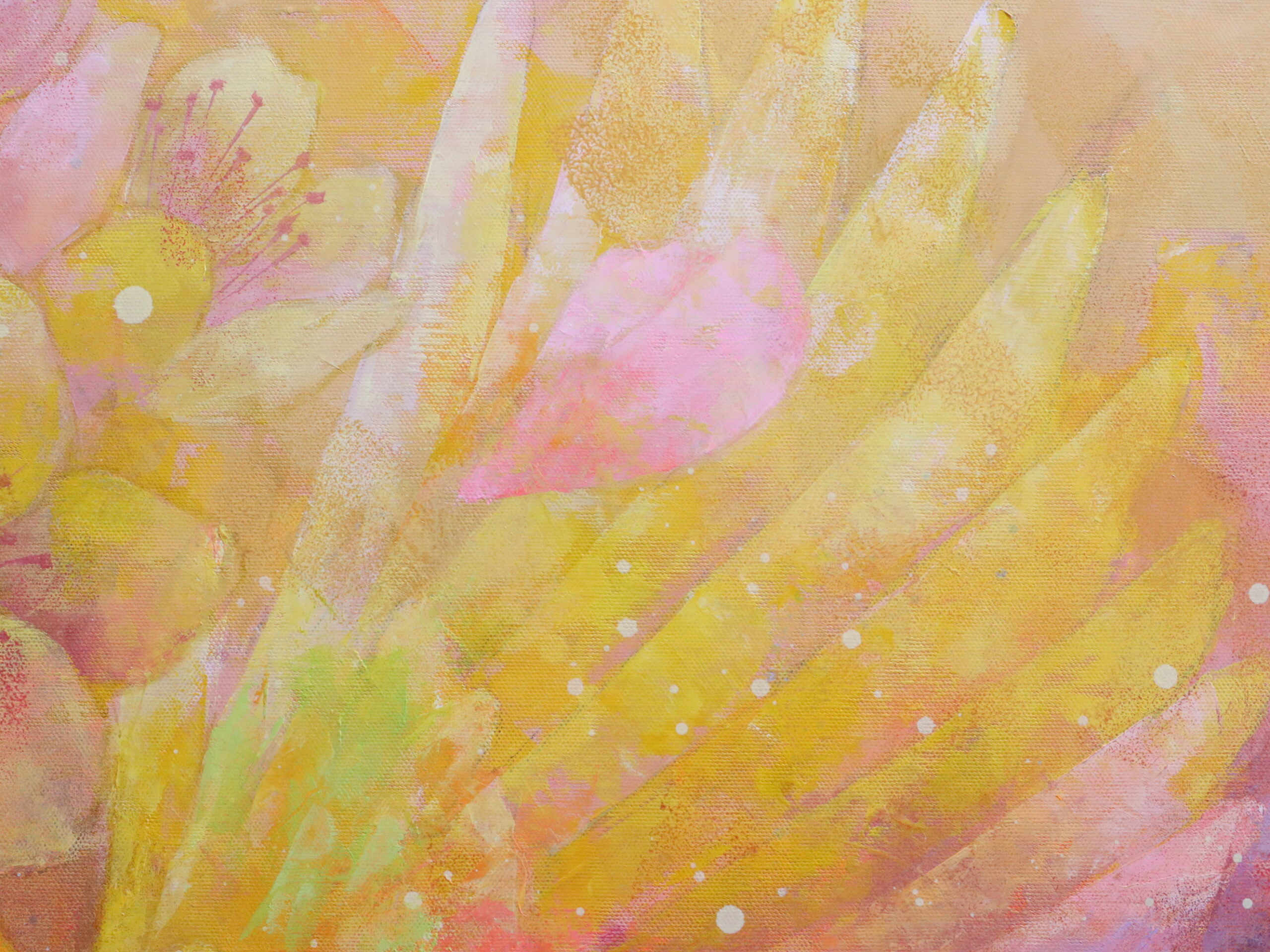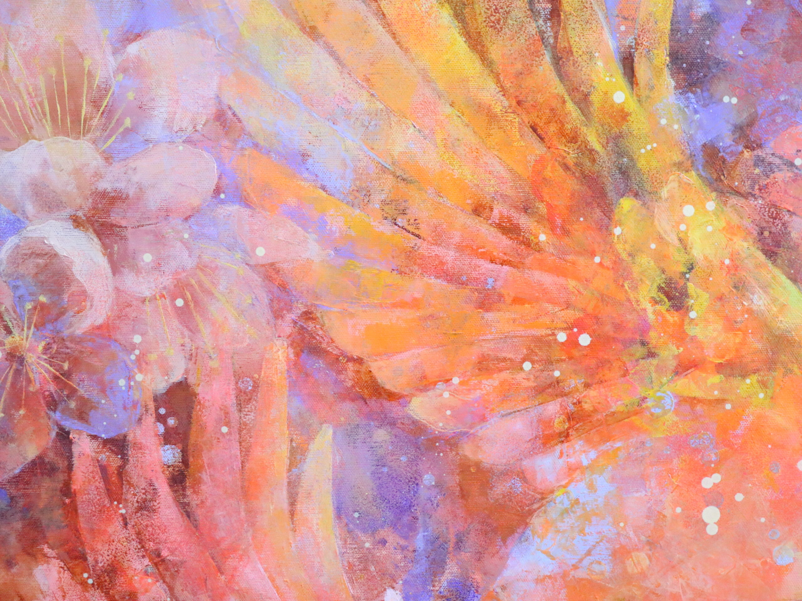 薄く溶いた油絵具を何層にも重ねて描き、最後にローラーを使い色を重ねて深みを出しました。色の重なりの美しさを感じていただけたら、嬉しいです。