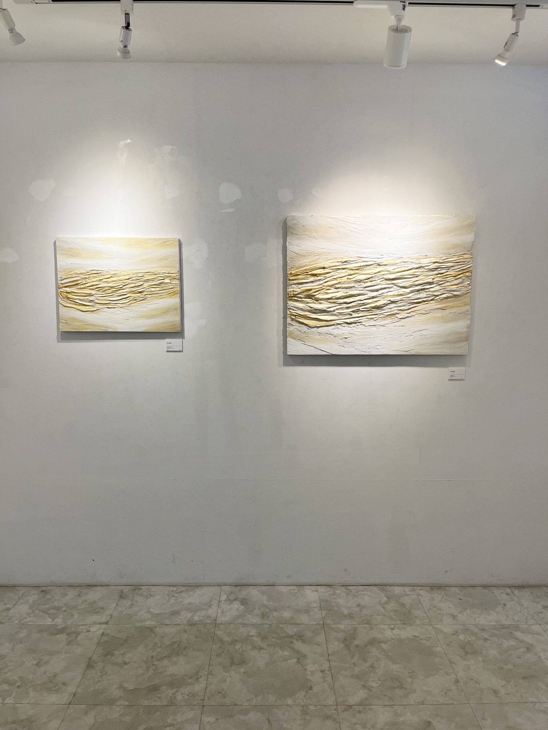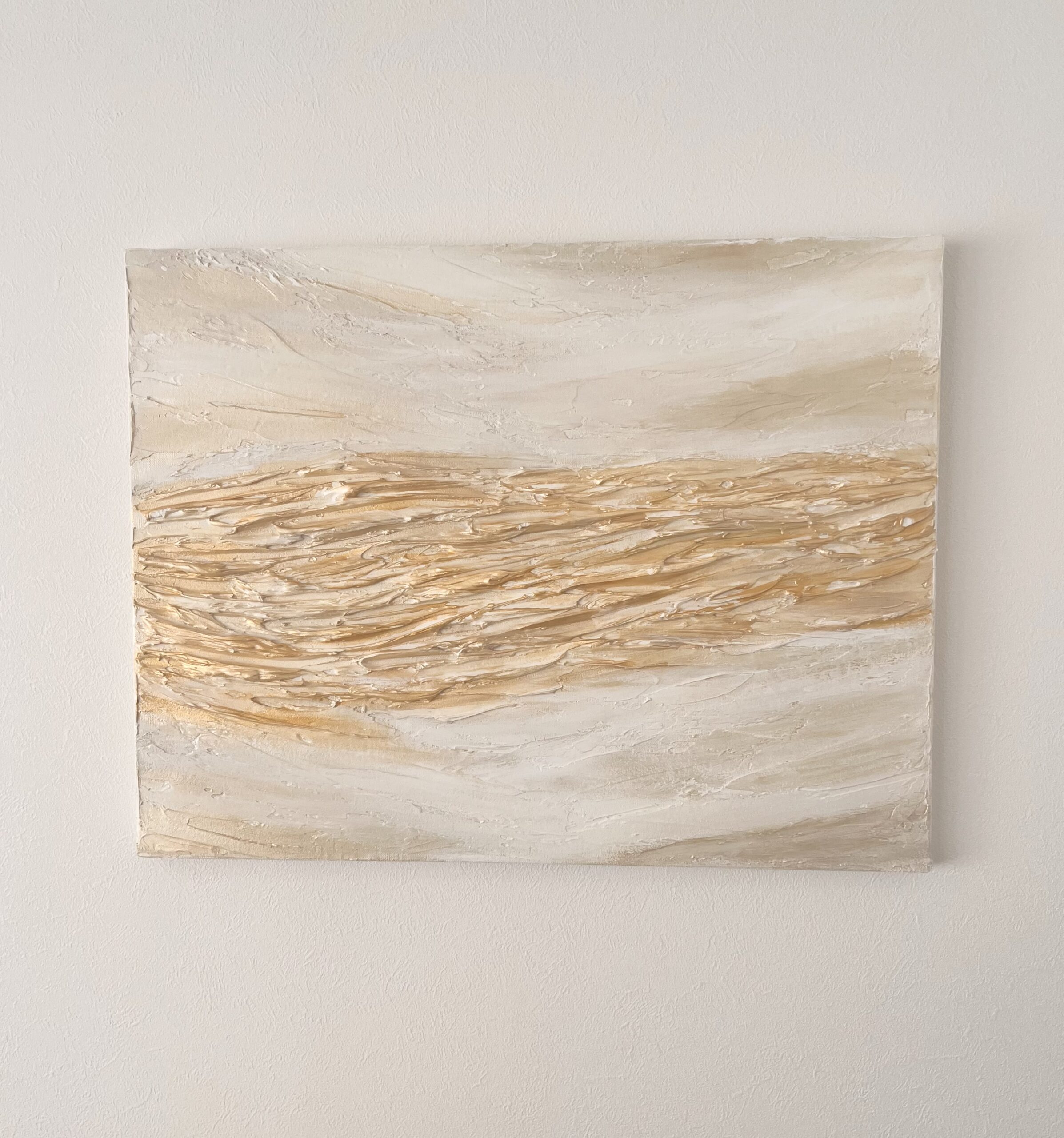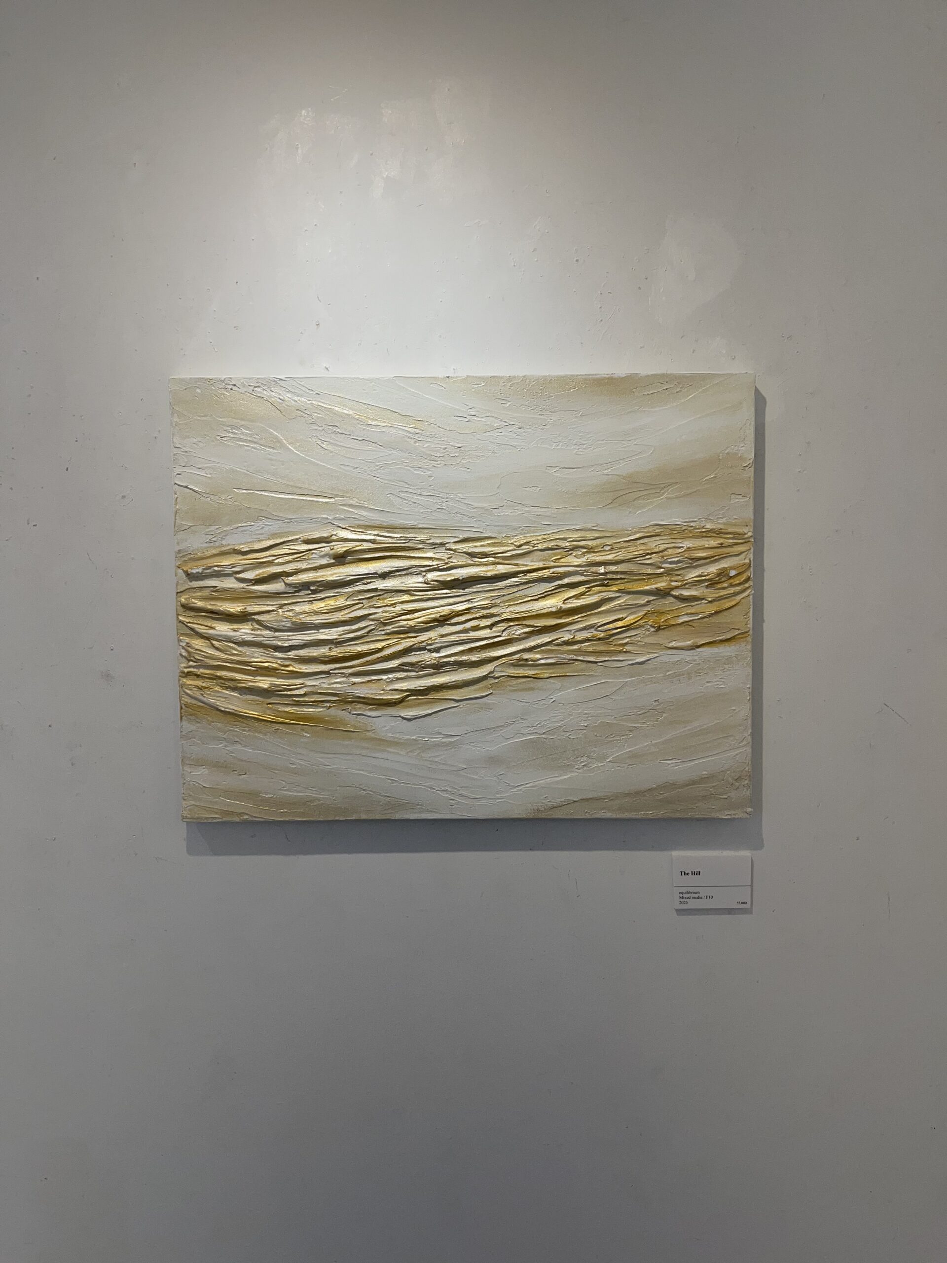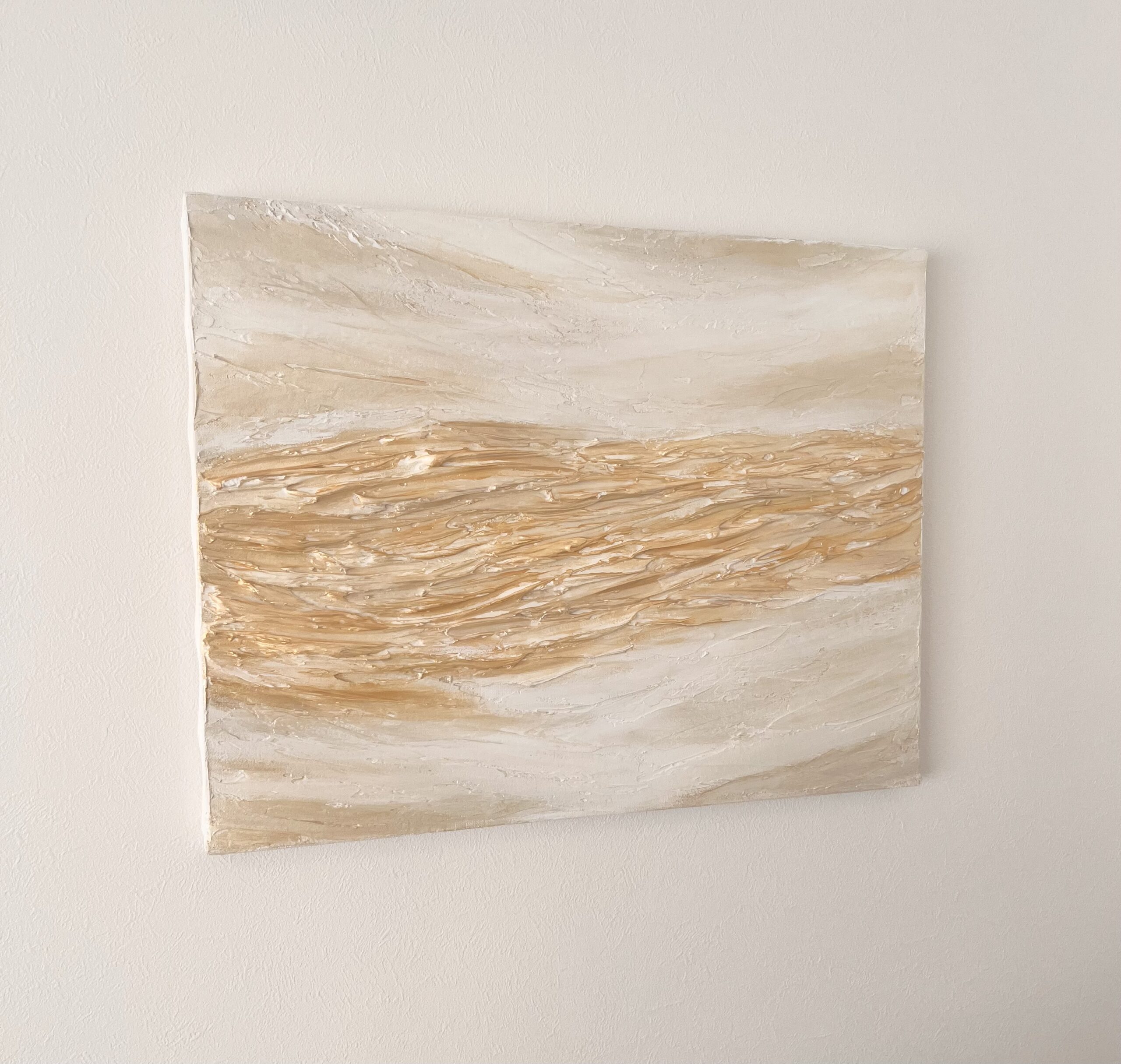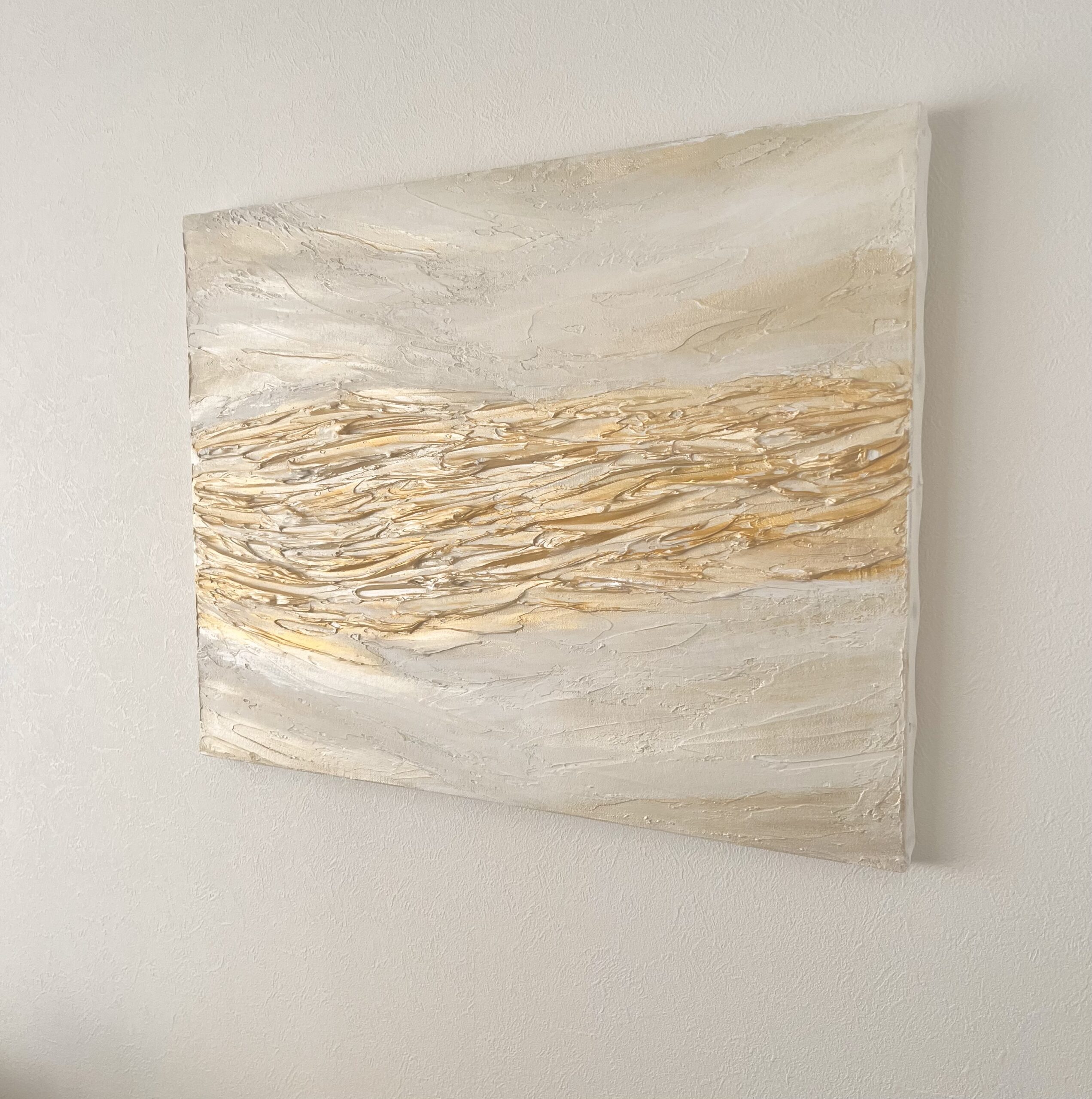 テクスチャーが非常に厚く、様々なトーンのメタリックを重ねておりますので、実物は贅沢な見応えがあります。白やコンクリートの壁、モダンな空間におすすめの作品です。