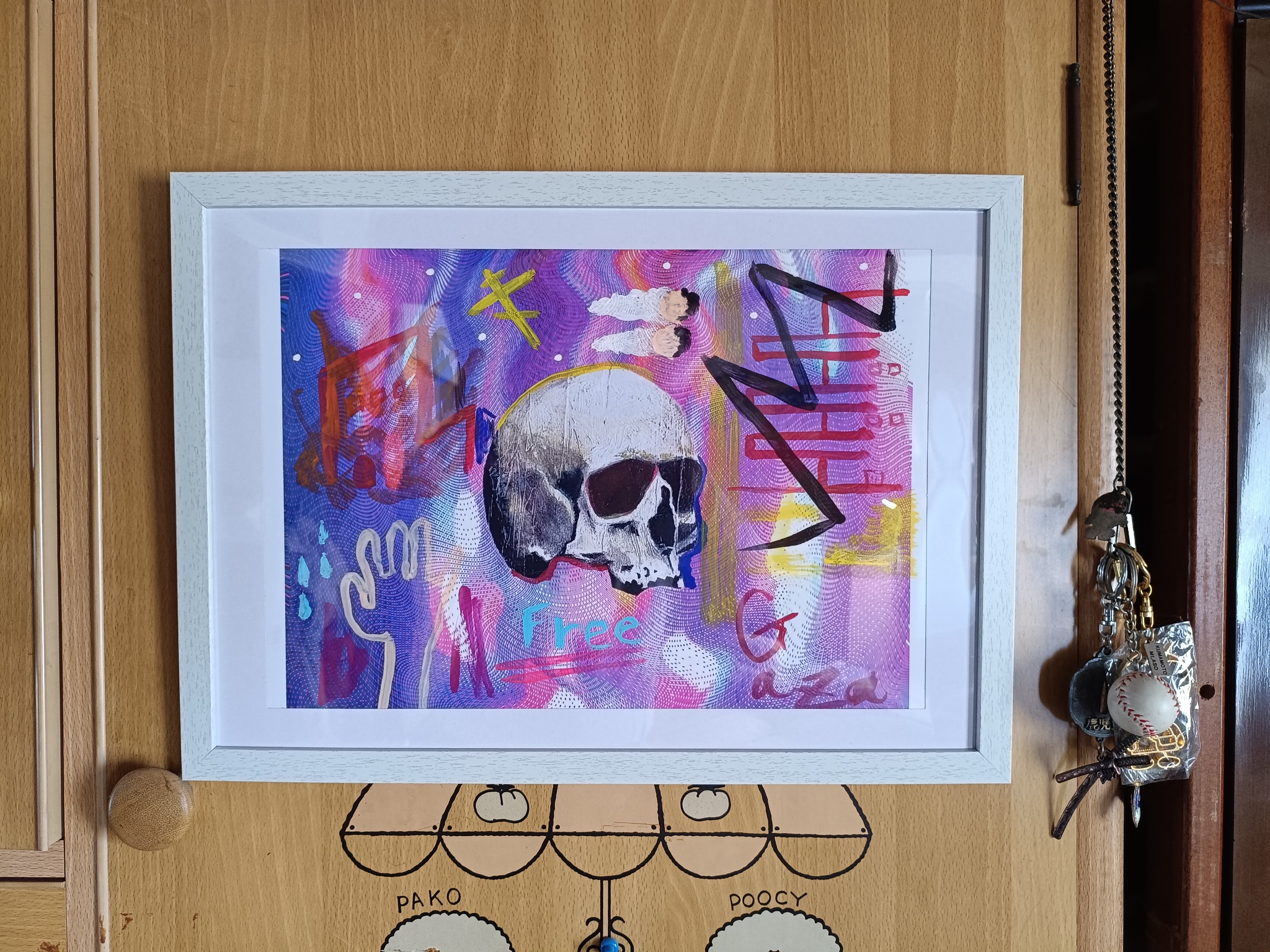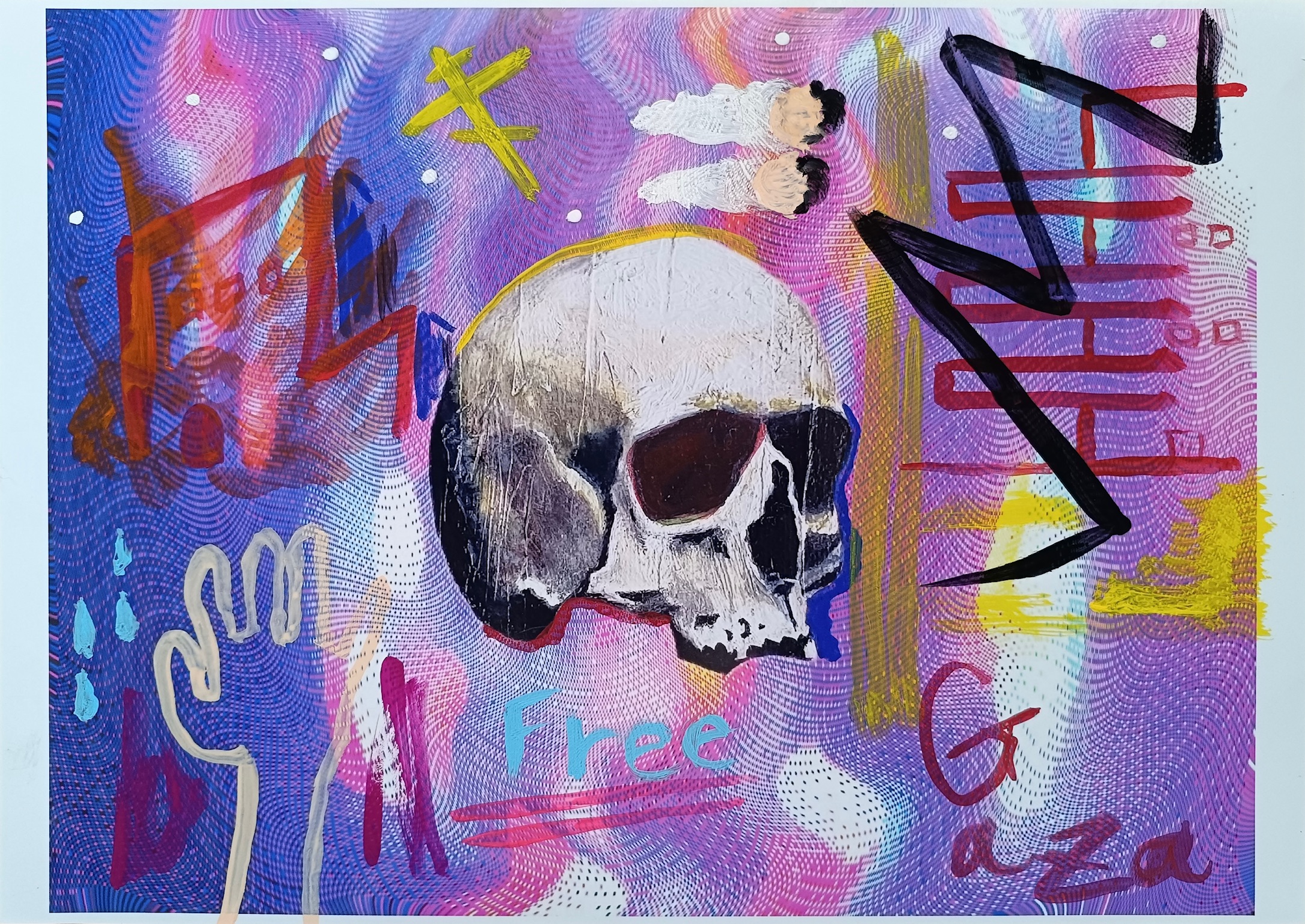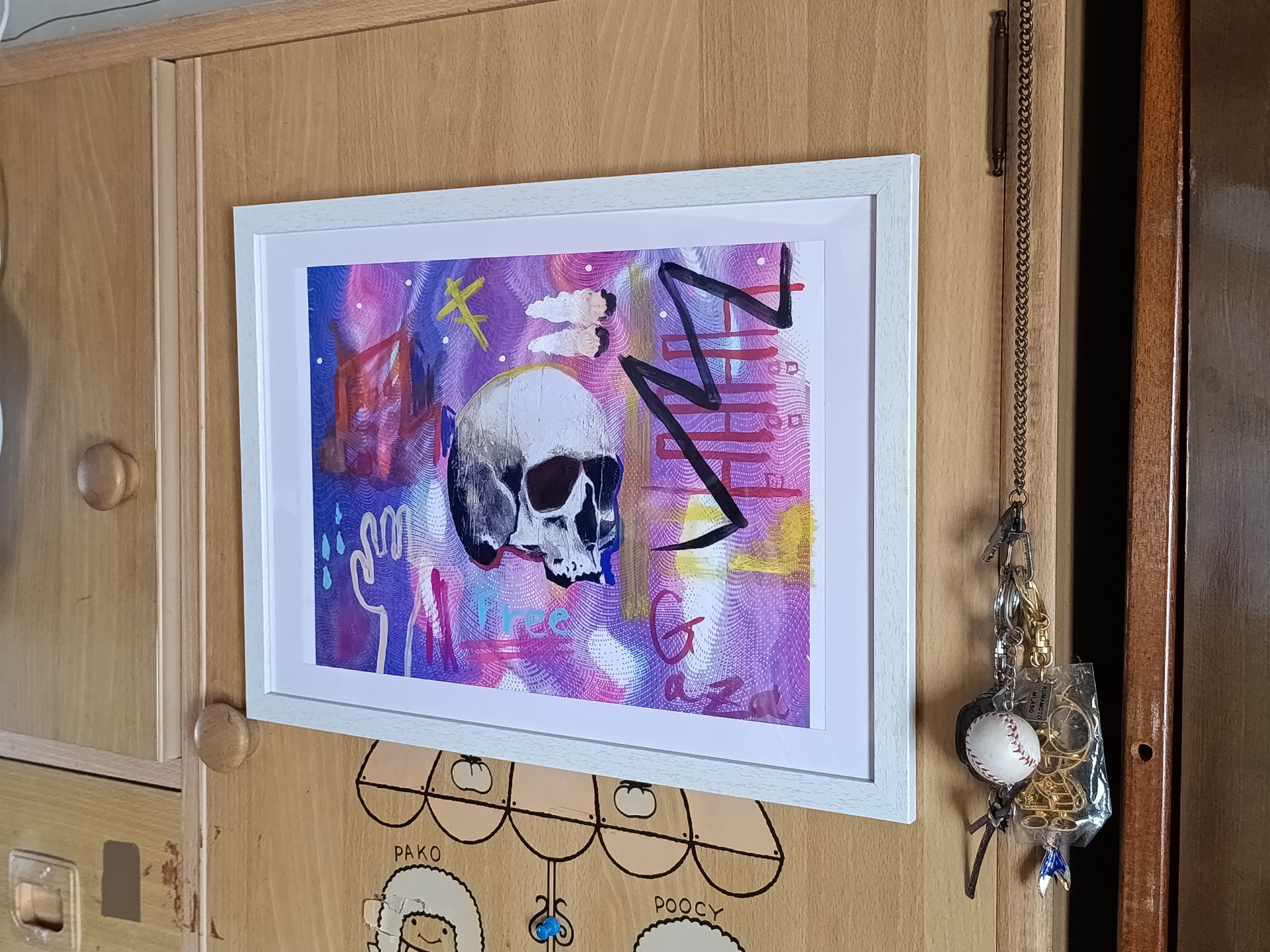 この作品では、生々しい感情と大胆な抽象表現を融合させ、アクリル絵具を用いて生命、自由、そして闘争といったテーマを探求しました。頭蓋骨は、鮮やかな色彩とギザギザのフォルムが織りなす混沌としたダンスの支柱となり、痛みと回復力を映し出しています。この作品はエネルギーに満ち溢れ、深い思索を促します。作品が置かれた空間は、思考を刺激し、躍動感に満ちた活力に満ちた空間へと変貌します。それは、強く心に響く視覚的な物語です。