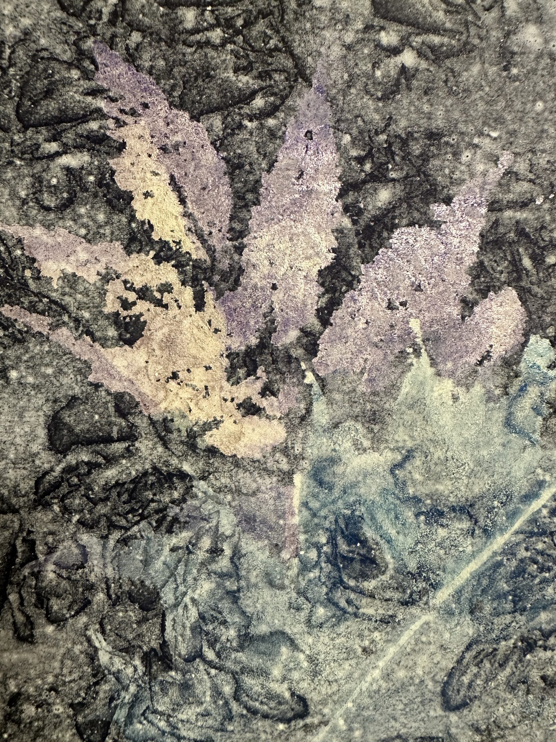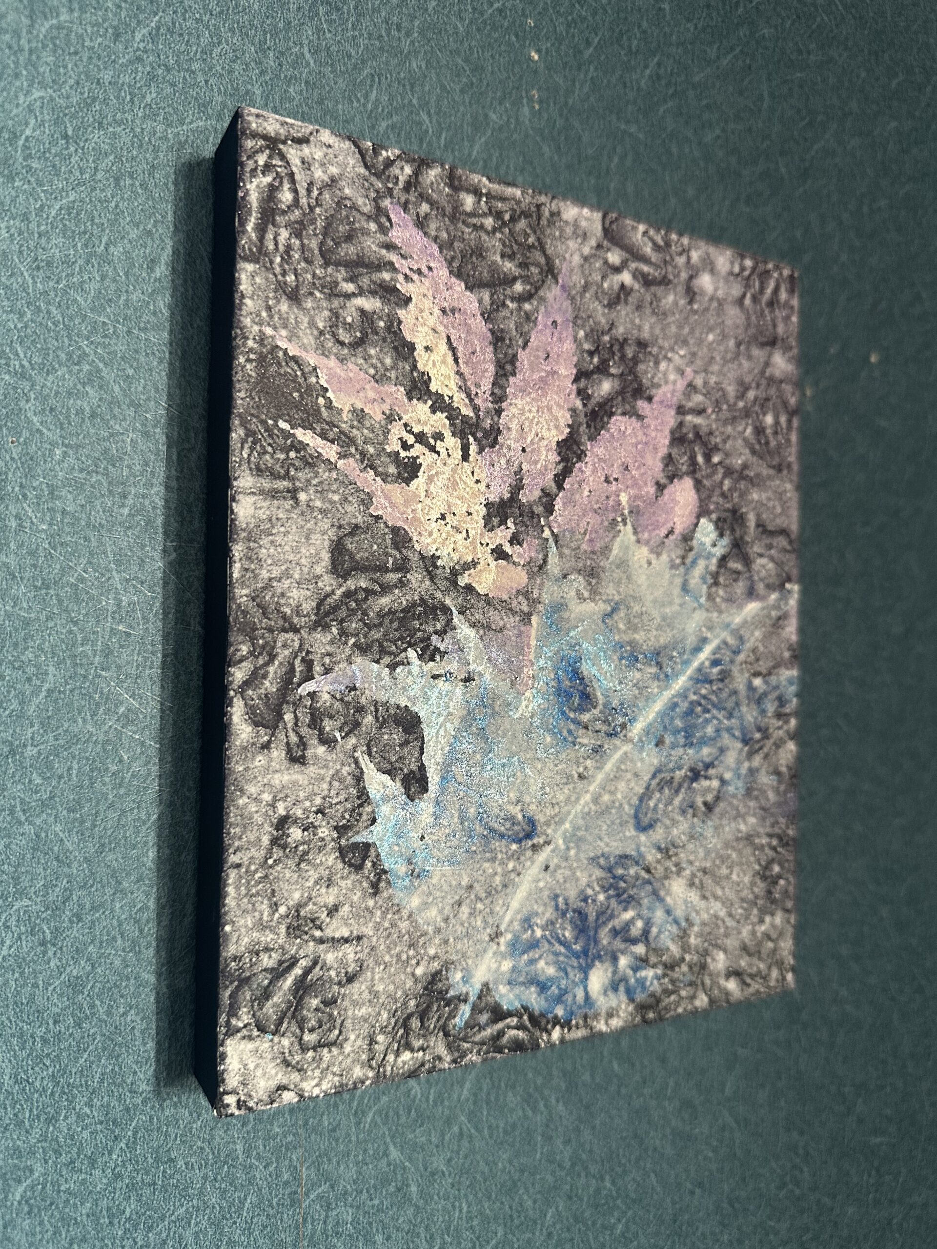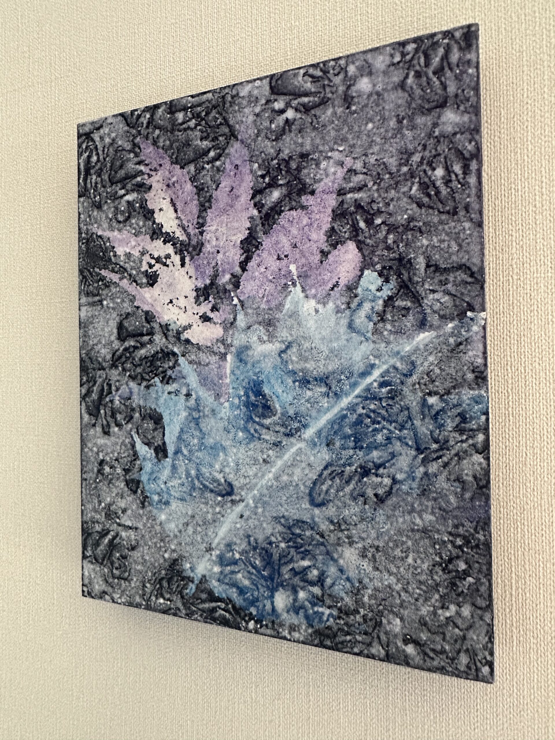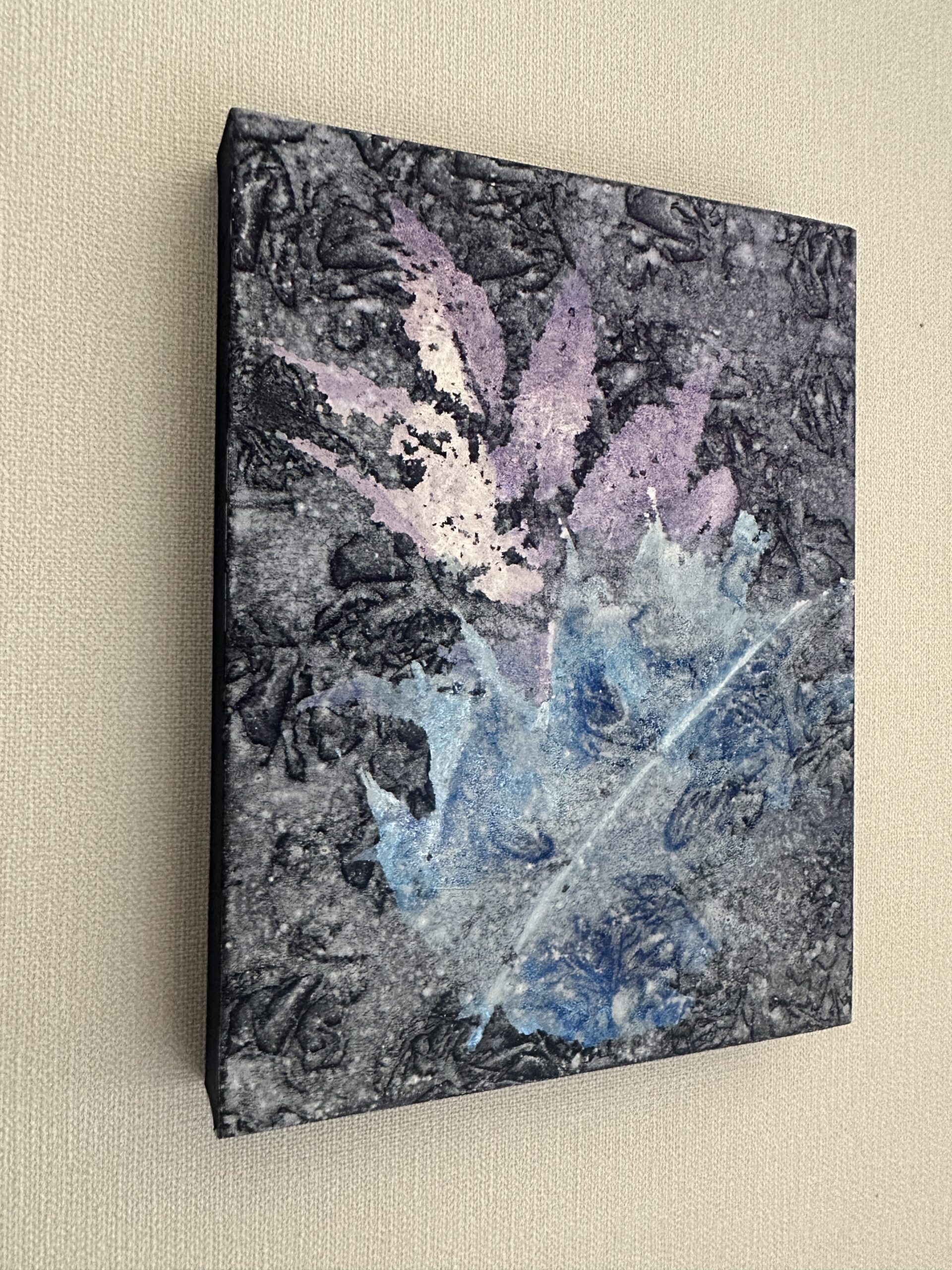 箔を使用した作品は、光のあたり方によって輝き方が変わります。日中の窓から入る自然光、夜の照明の光など、光の違いにより表情がかなり変わります。また、箔の変色を抑えるためのコーティングをしておりますが、時間経過とともに少しずつ色味が変化します。その変化もお楽しみいただけますと幸いです。