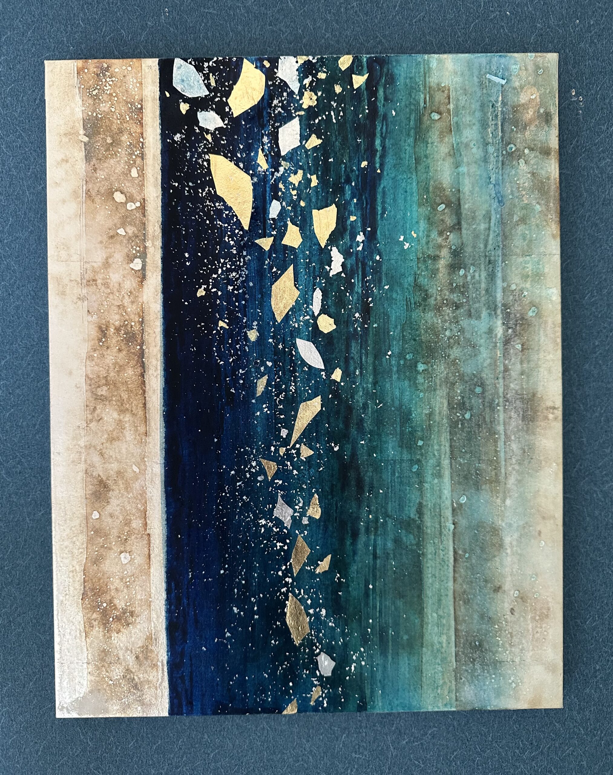 仁淀川の澄みきった深い青と、音を奏でるような水しぶき。 仁淀川の青を思い出すと、静かな森の中に身を置いているかのような気持ちになり心が落ちつきます。 全面に銀箔を貼り、部分的に色を変化させた上に青を重ね、木漏れ日を受けて光る水しぶきを金色や銀色の箔で表現しました。
