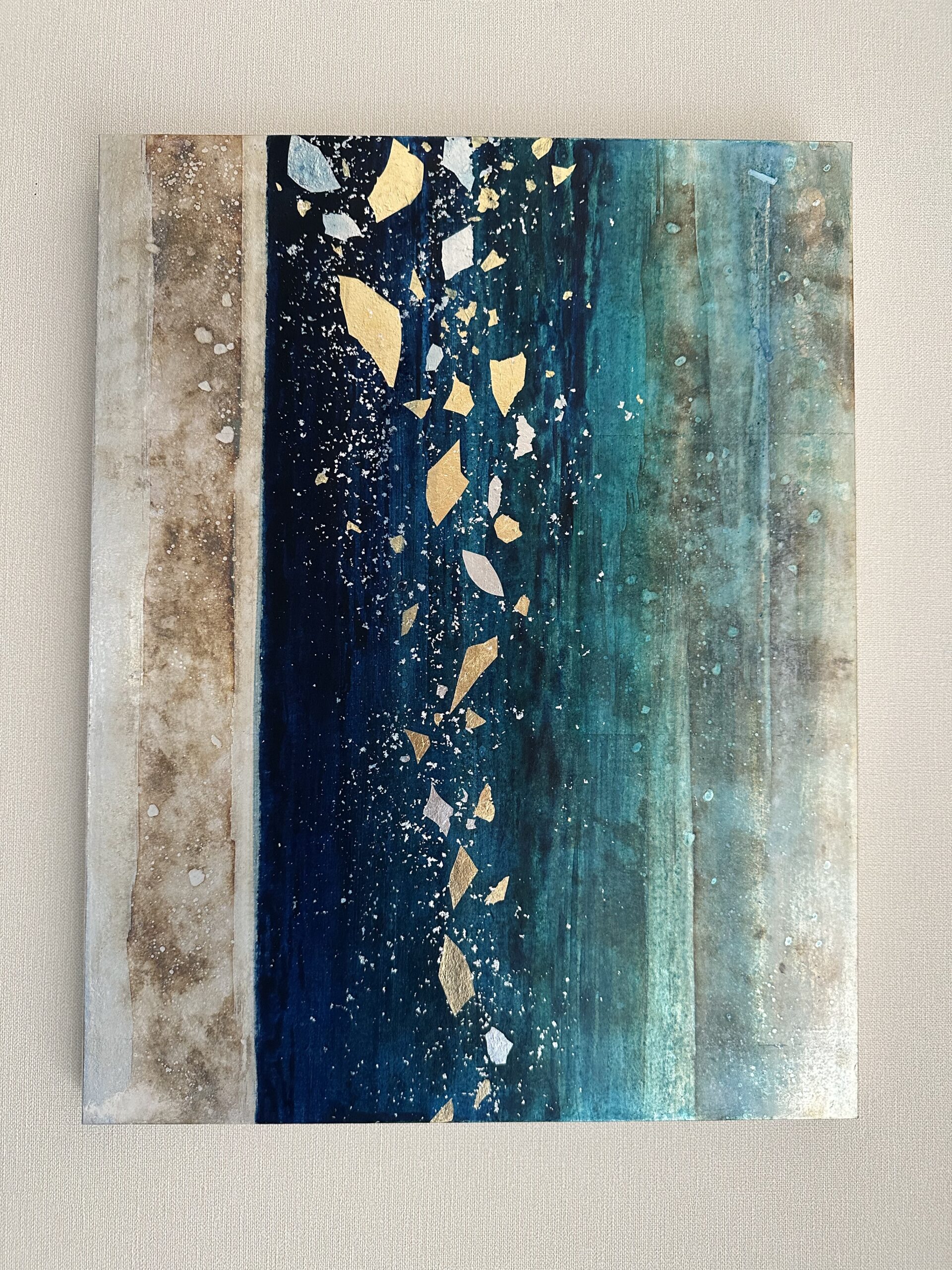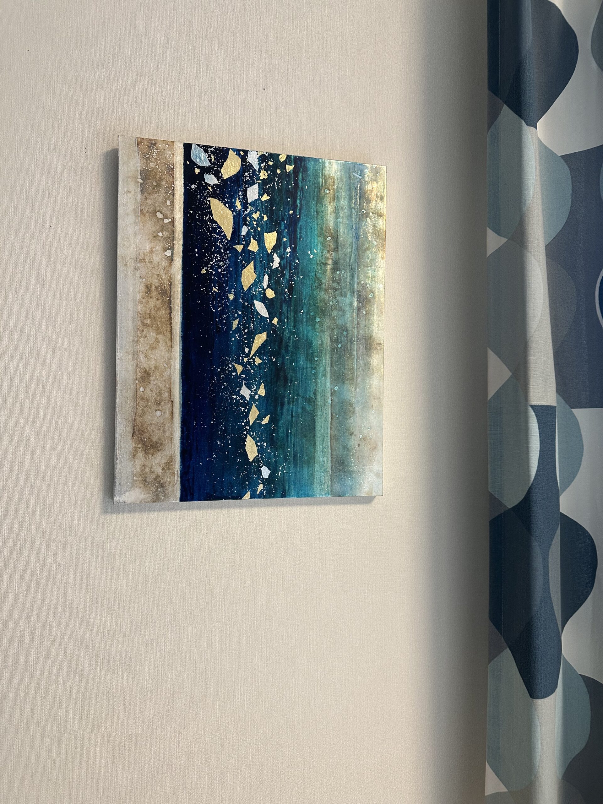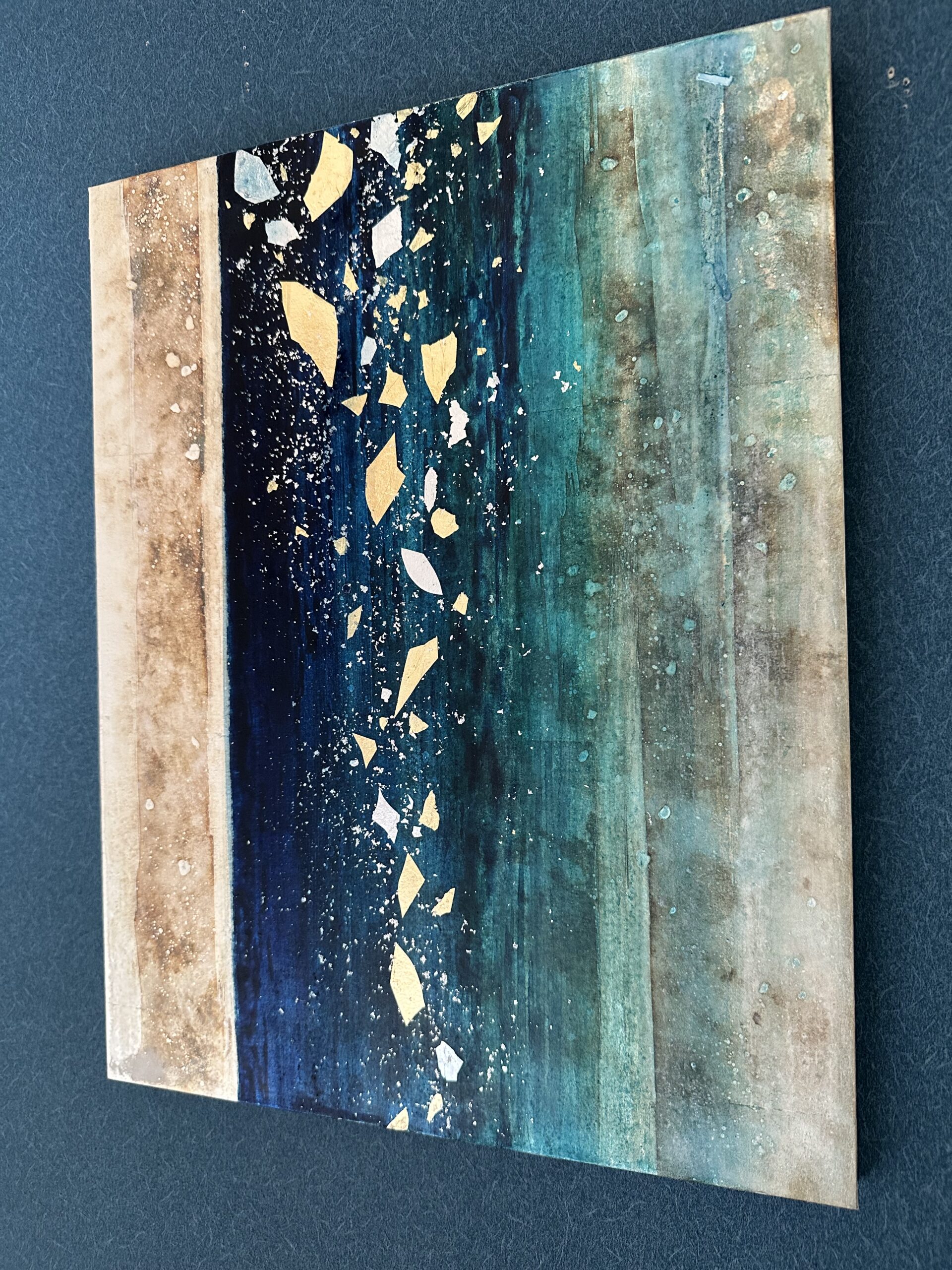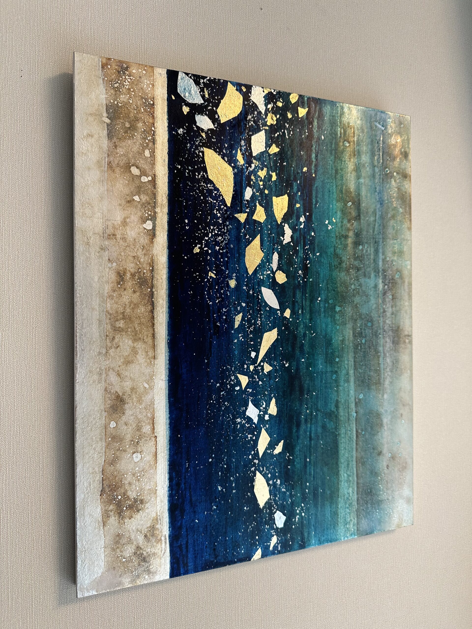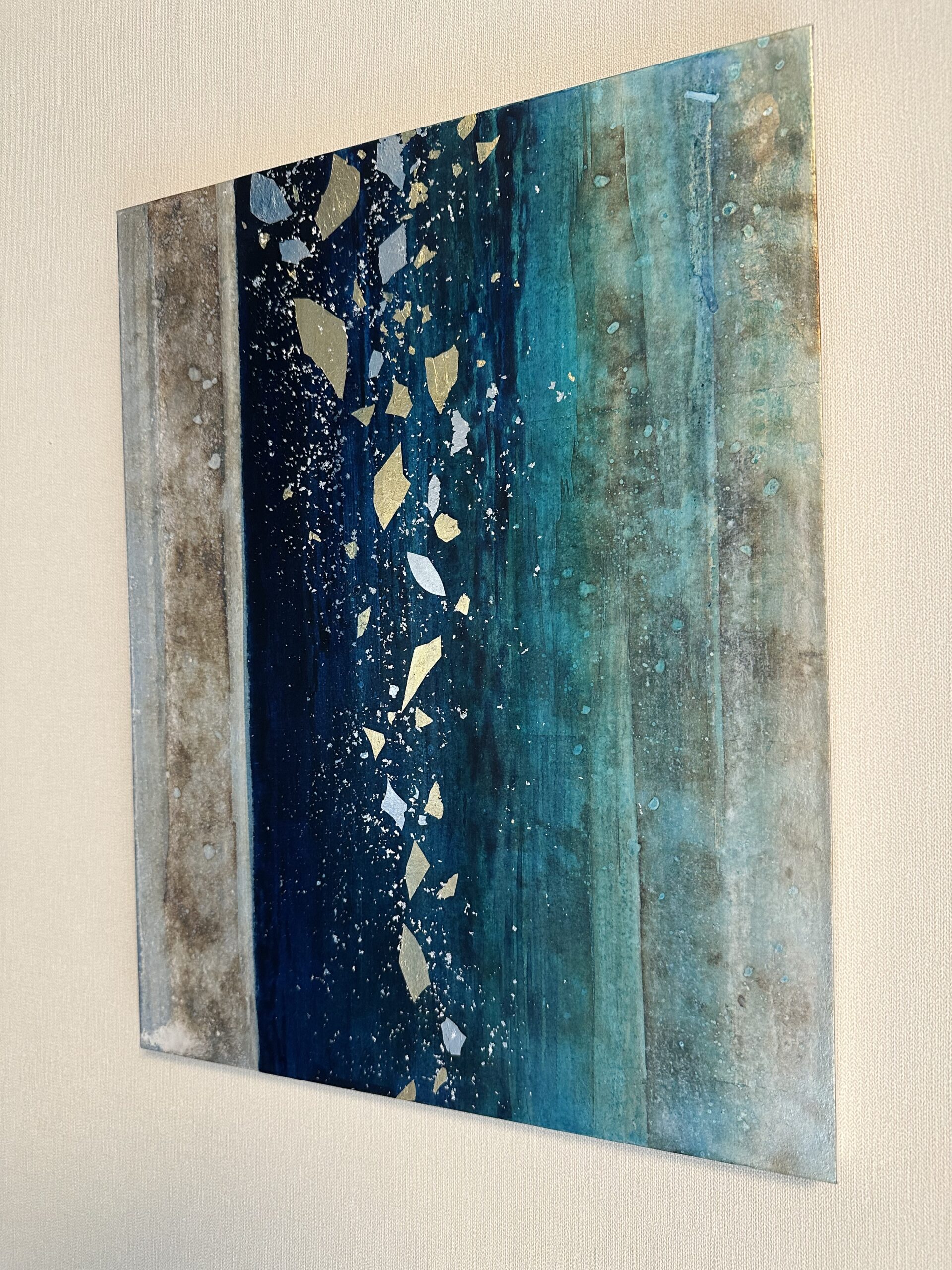 箔を使用した作品は、光のあたり方によって輝き方が変わります。日中の窓から入る自然光、夜の照明の光など、光の違いにより表情がかなり変わります。また、箔の変色を抑えるためのコーティングをしておりますが、時間経過とともに少しずつ色味が変化します。その変化もお楽しみいただけますと幸いです。