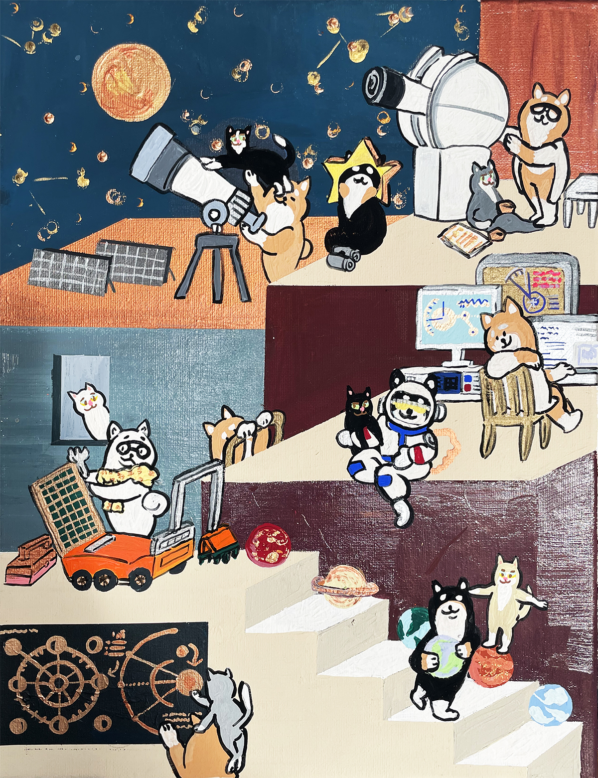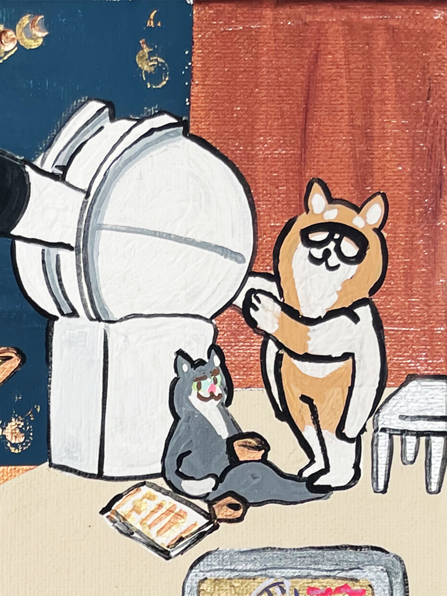 ここは、月が一番近い場所にある天体研究所。いまにも星が降ってきそうな夜ですが、柴犬の研究者達は今日も変わらず星や銀河などの宇宙現象の謎を解明するため、月と星の観測をしています。物理学や数学を得意とする柴犬研究者ですが、それぞれの得意な分野があることを承知しているので、お互いの研究内容に干渉はしません。そんなところも柴犬らしいですね。
