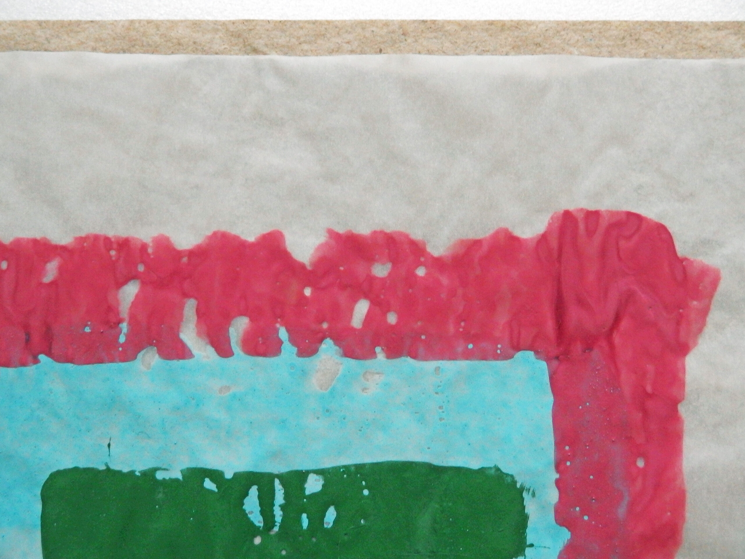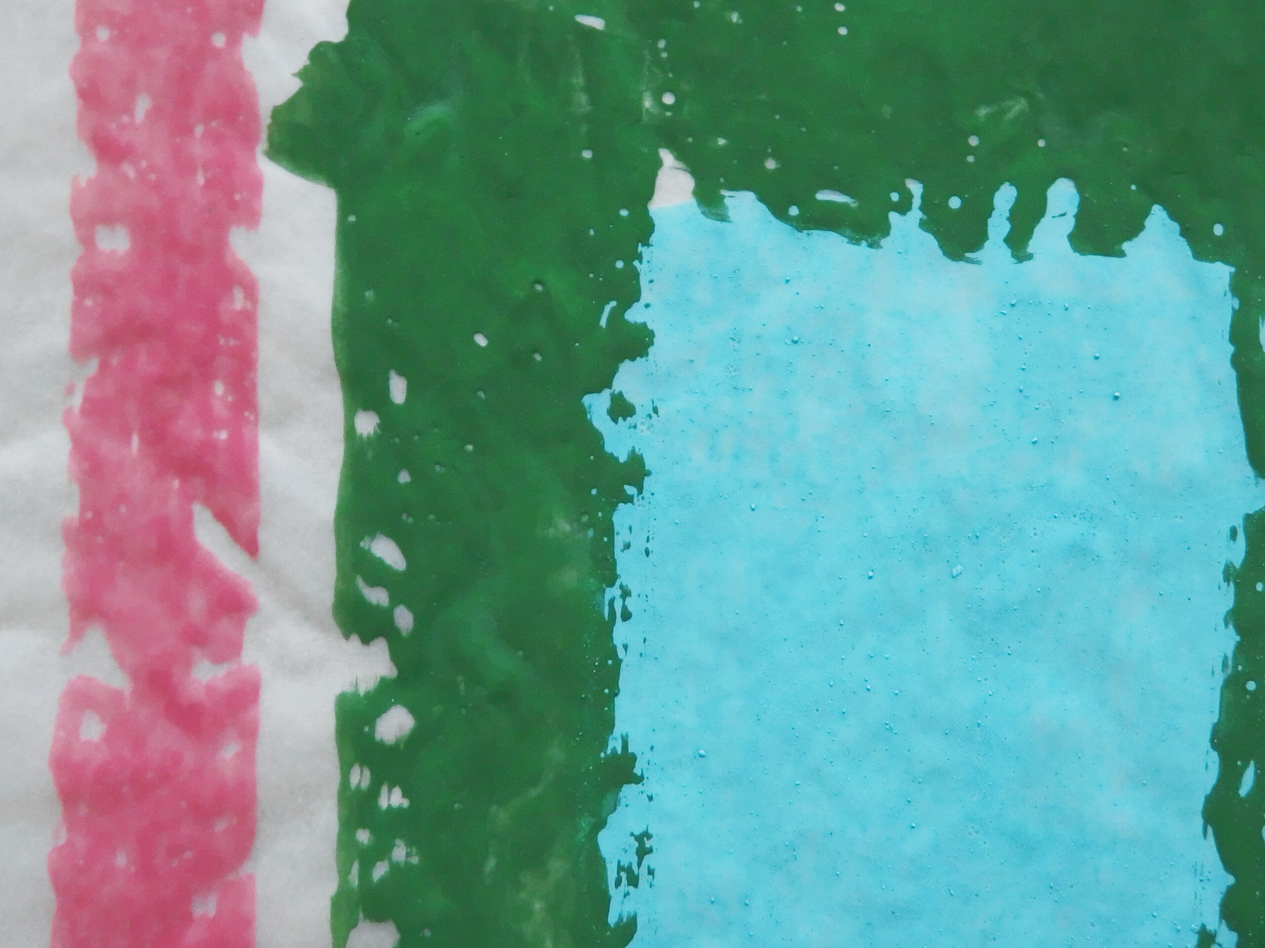 天然素材の和紙に膠を使うのが「日本画」の常識ですが、あえて人工素材を使っています。