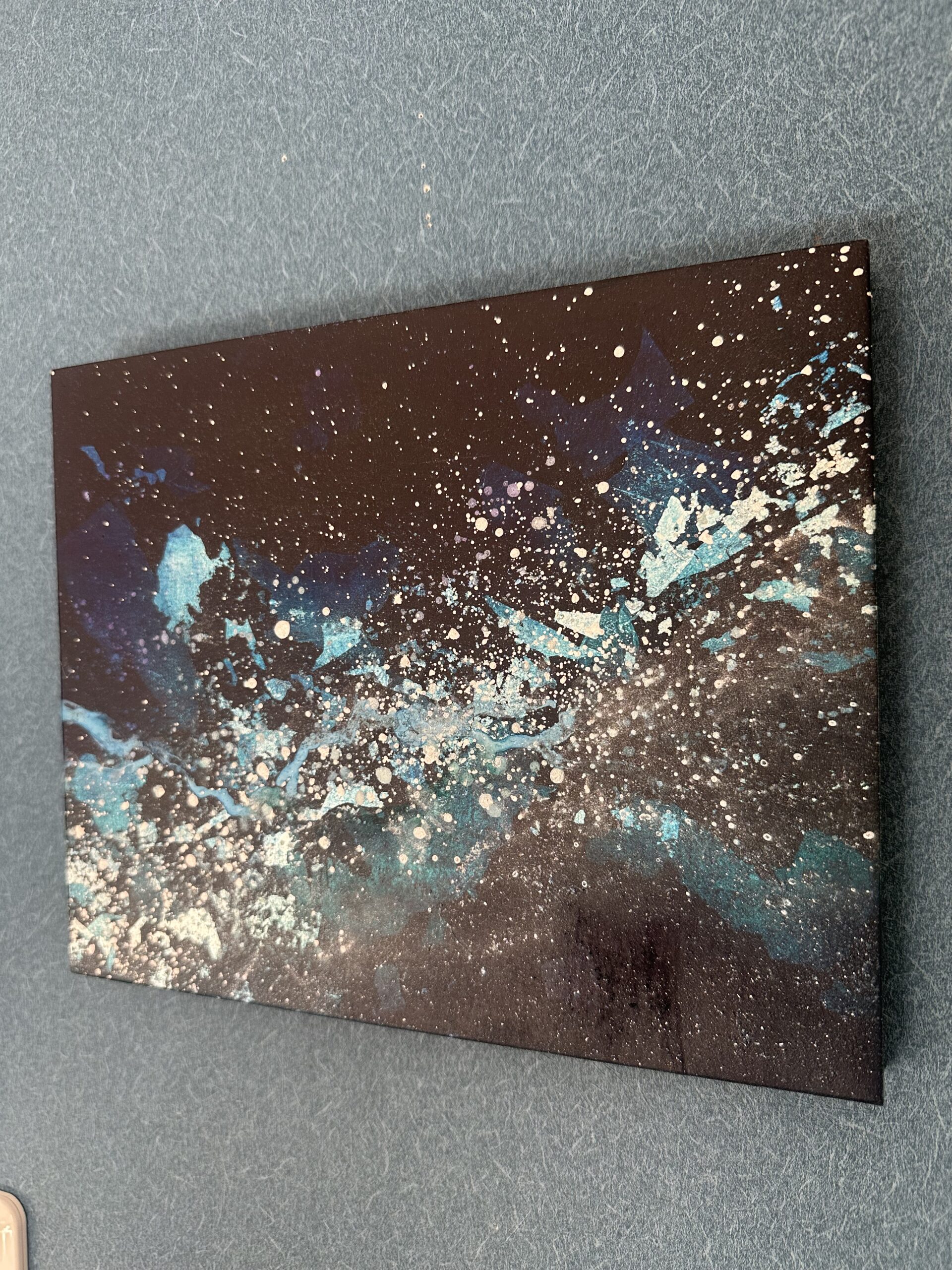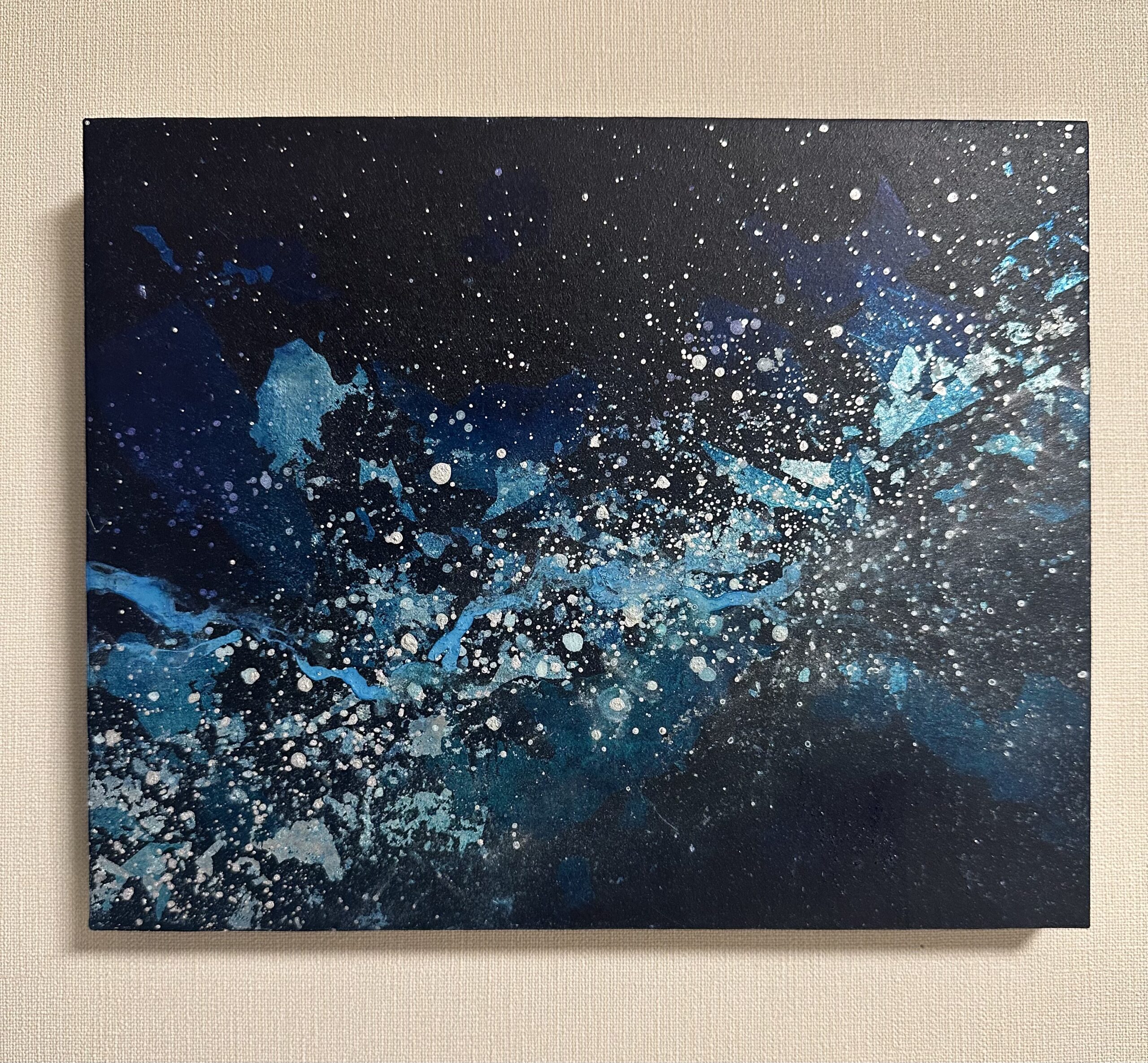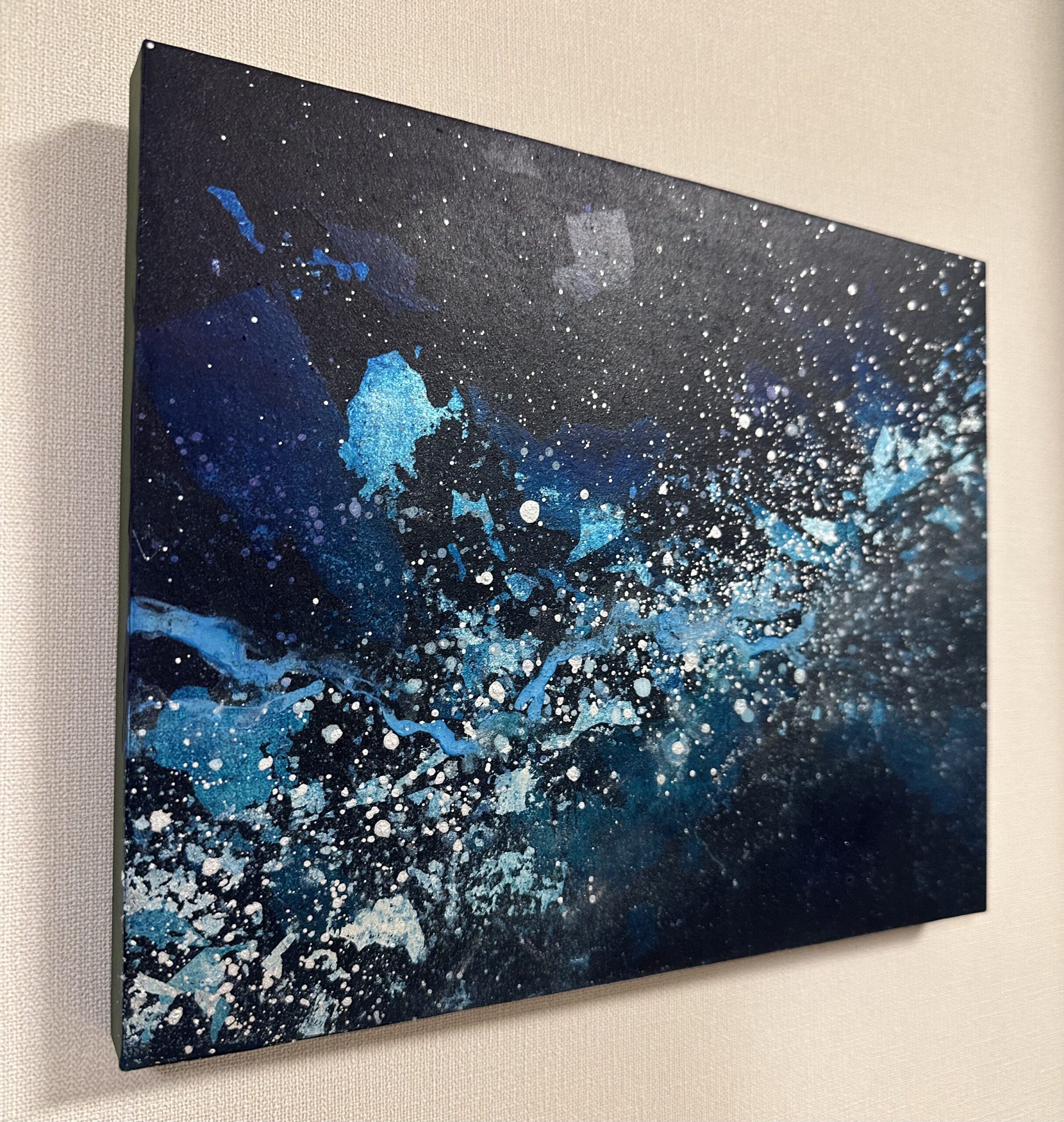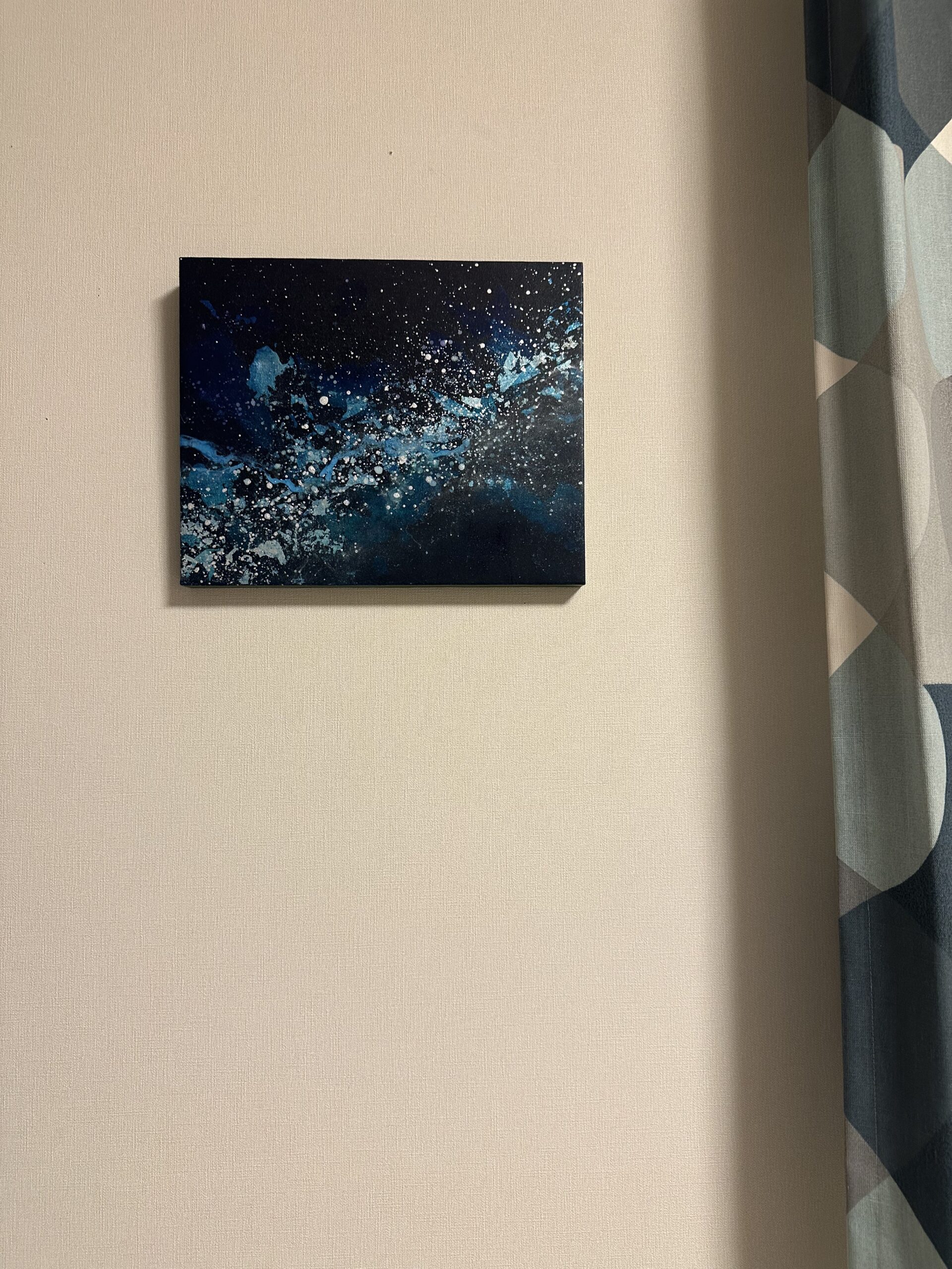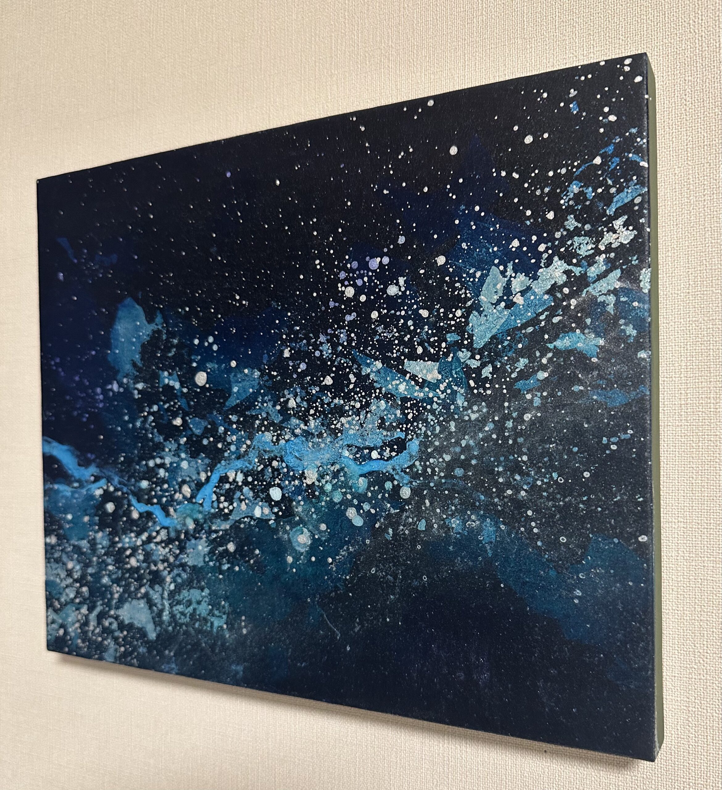 青と星を何層も重ね、どこまでも広がる夜空を描きました。