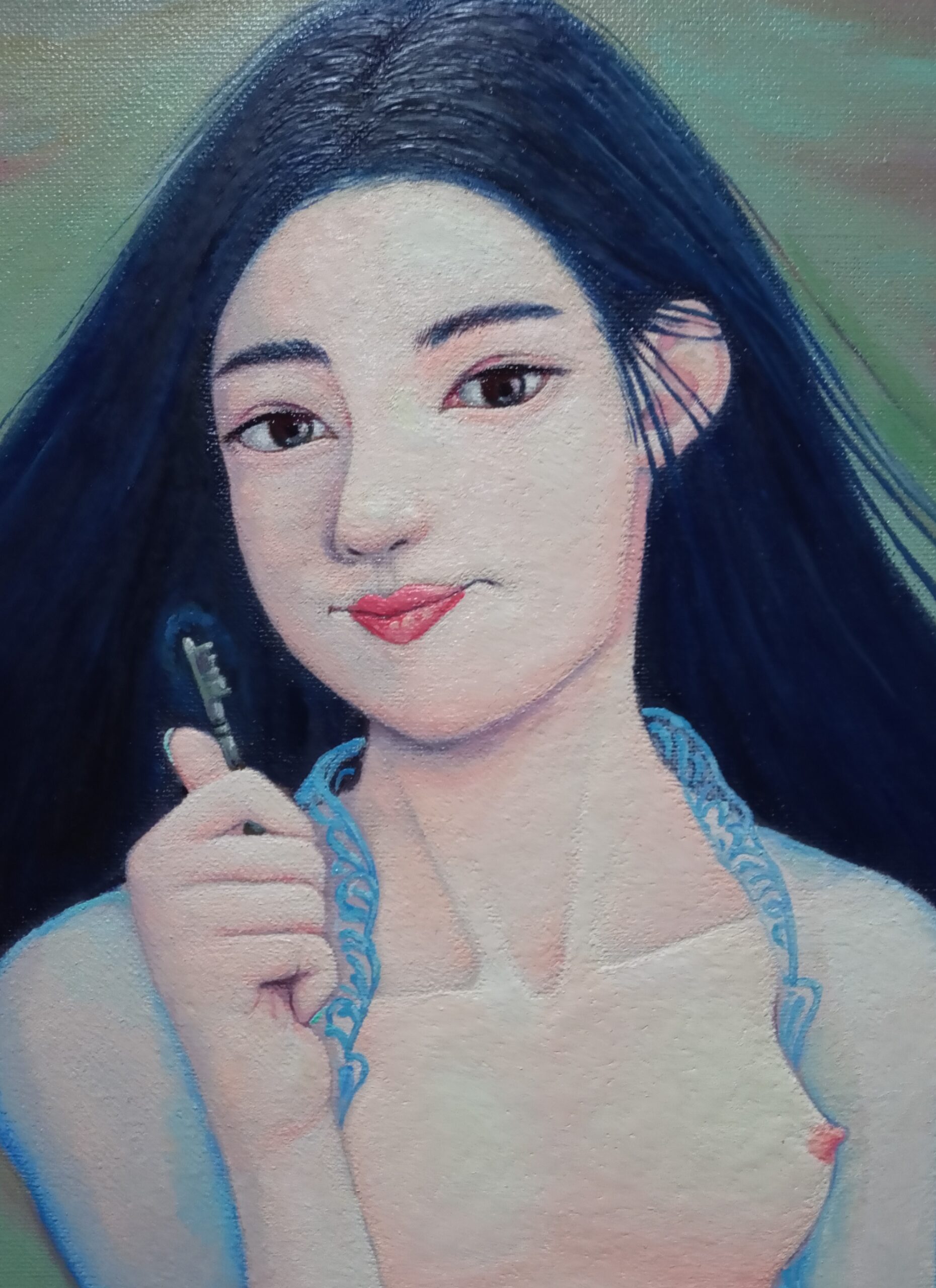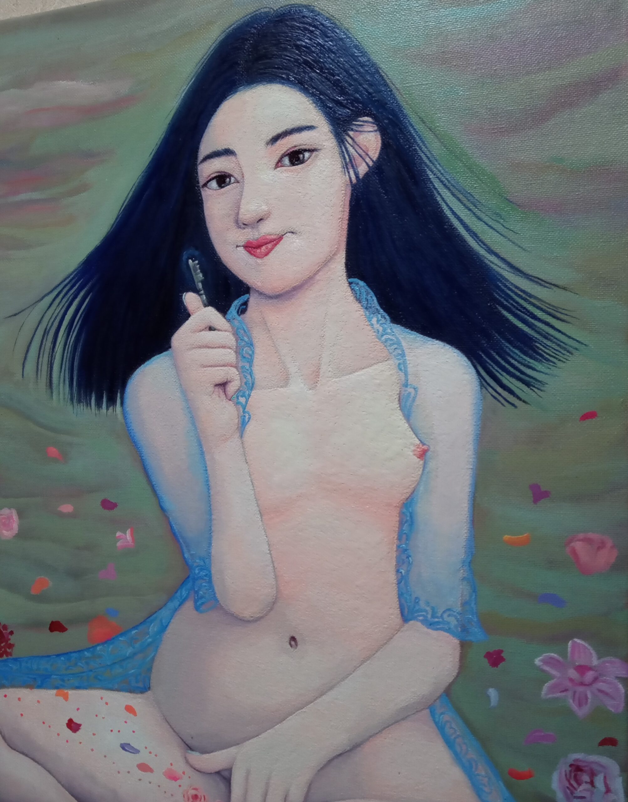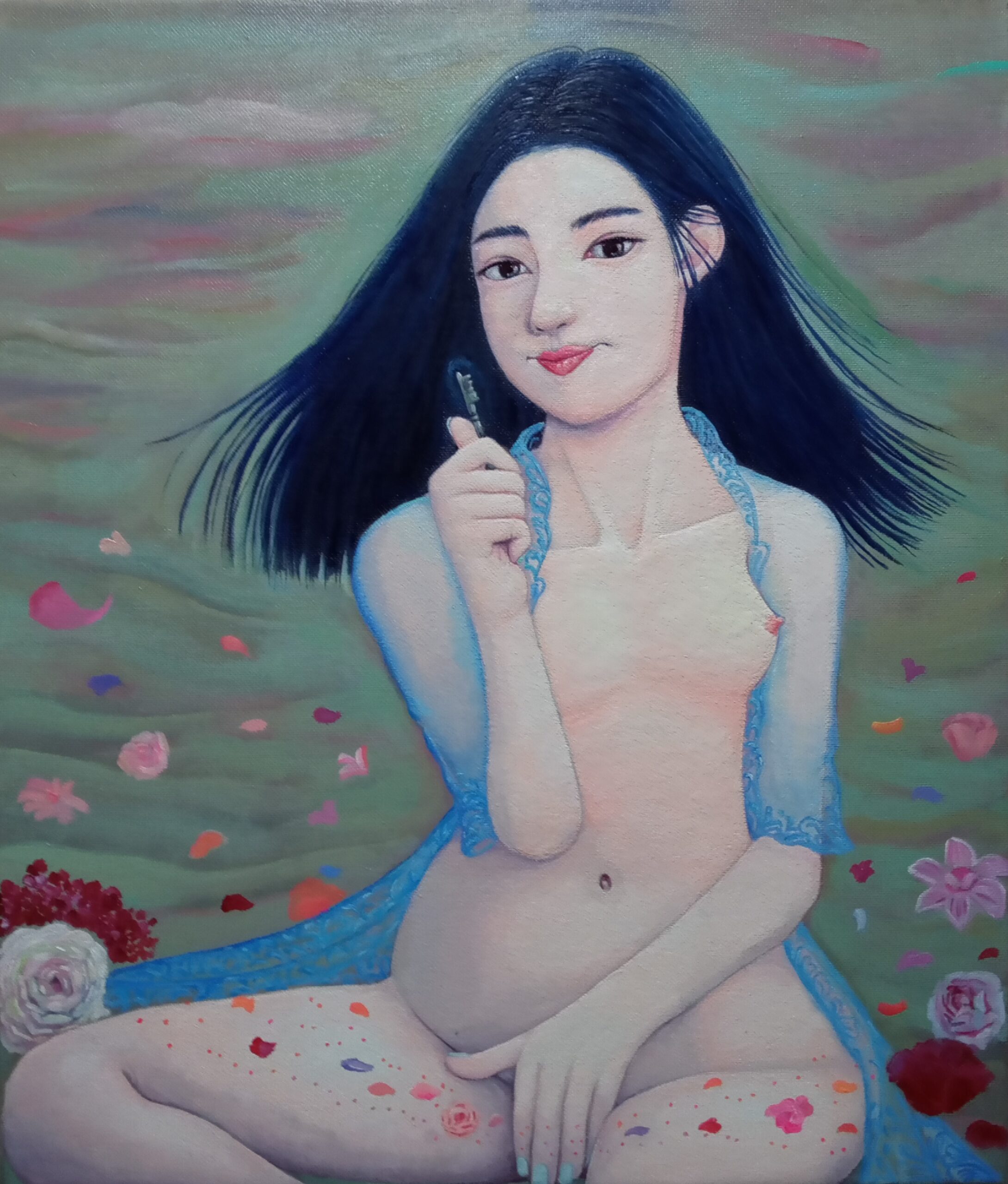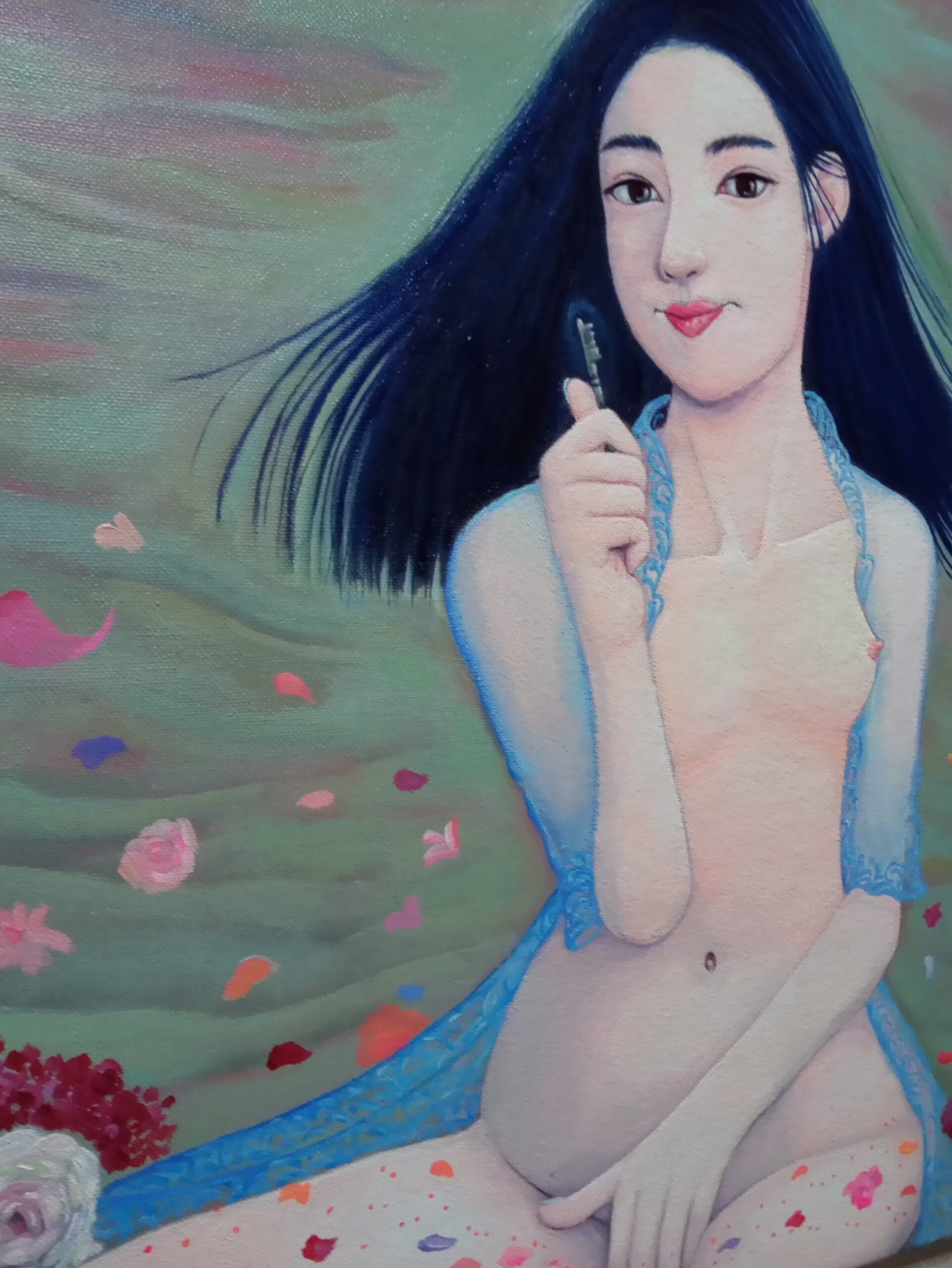 series Women㉘ 今を生きる女性をスパイスを効かせた愛で表現しました。釈迦もイエスも聖徳太子もみんなここから生まれて来ました。喜びも悲しみも、夢や希望も、戦争も平和もみんなみんなここから始まるのです。ただただ感謝です。  前面の花などは少量の蛍光色を用い、浮き出るように仕上げました。