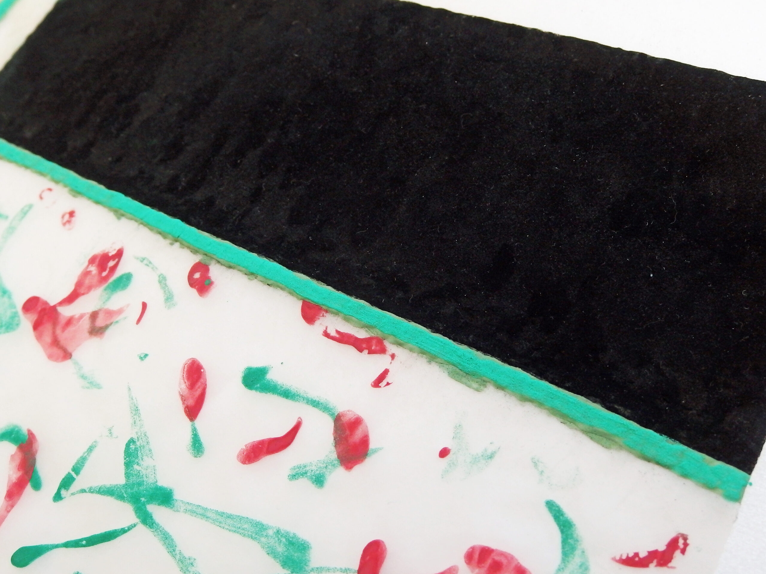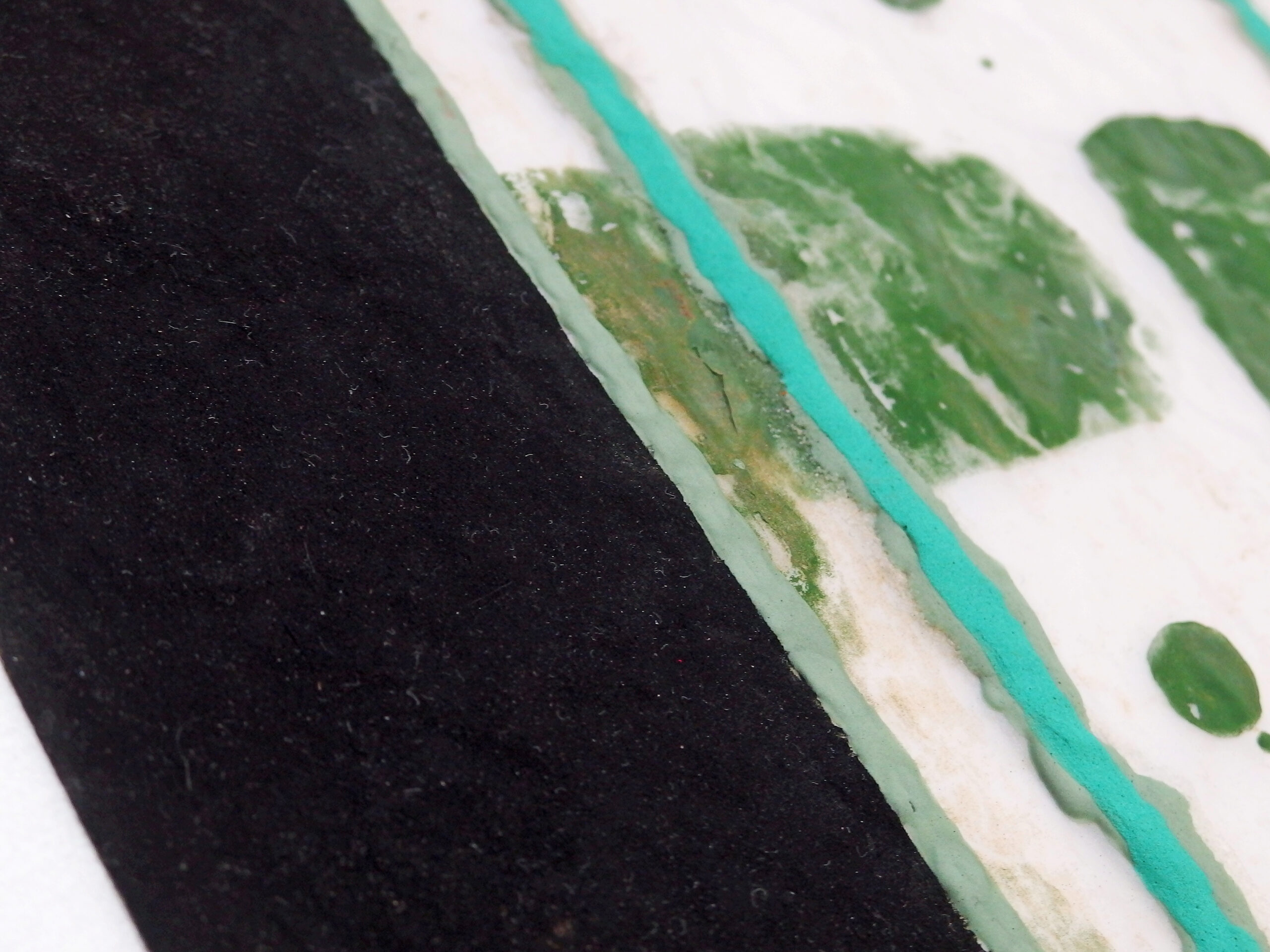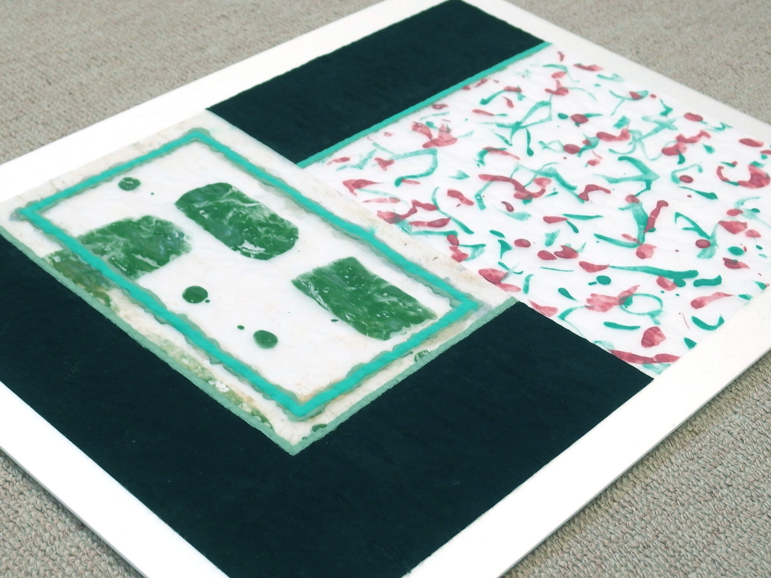 天然素材の和紙に膠を使うのが「日本画」の常識ですが、あえて人工素材を使っています。